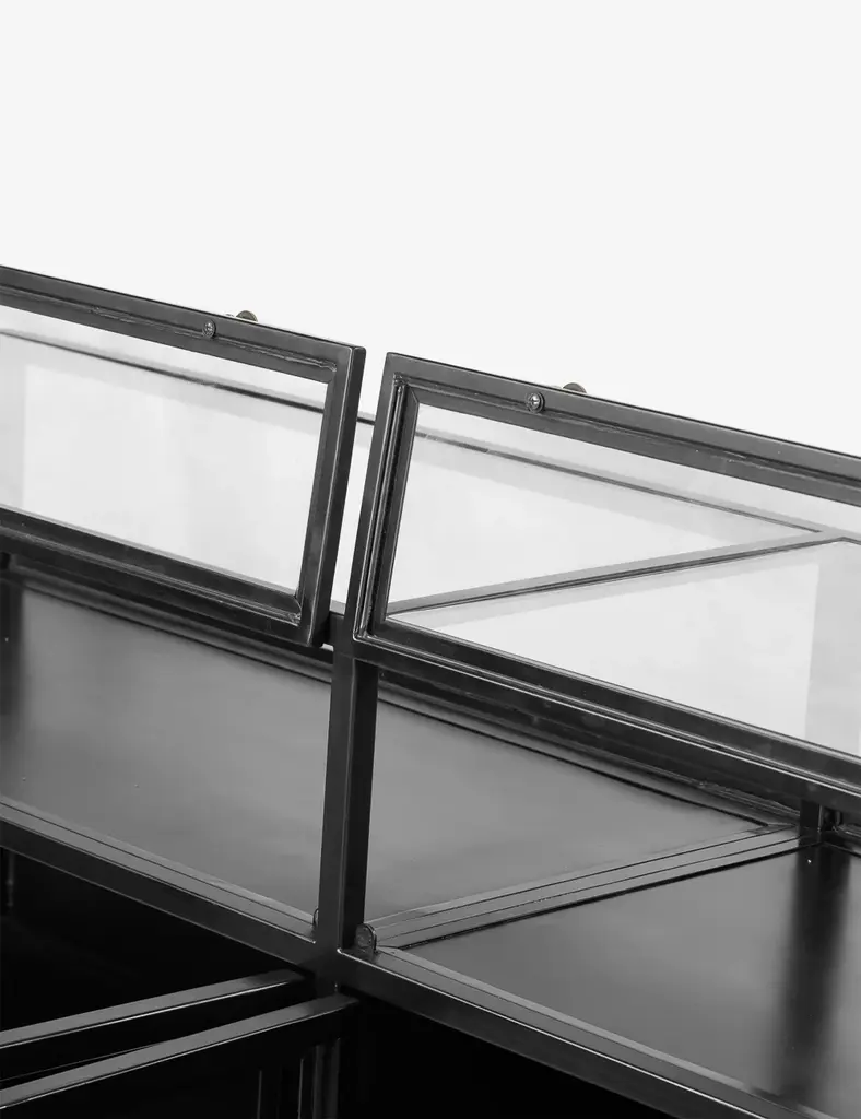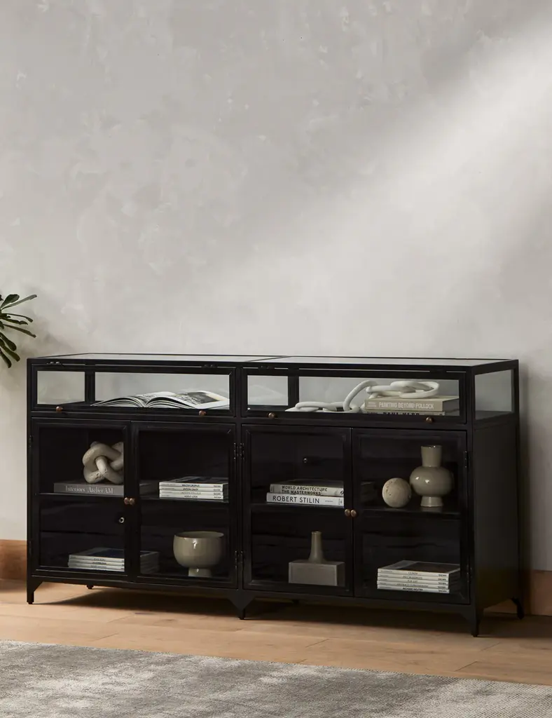 In a sleek nod to a shadow box design, this sideboard cabinet features an iron frame with glass enclosures for storage and display. The Malcom Sideboard includes cabinet shelving and a glass top case for a clean look with an industrial edge.