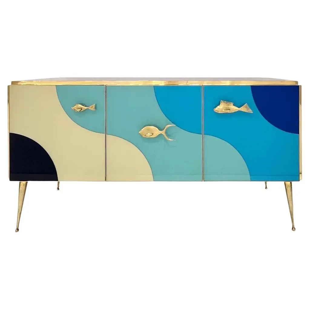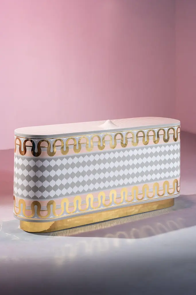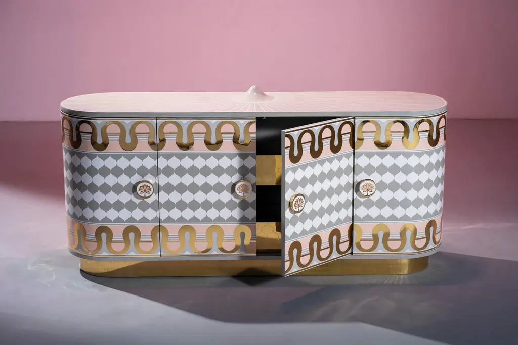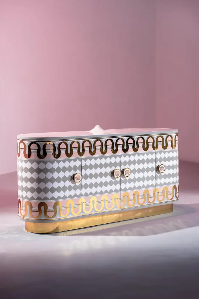 Beautiful brass arches and inlay patterns adorn the Mandala Sideboard Basra. Italian design is crafted with Indian motifs for a unique cabinetEach piece from this collection is thoughtfully put together by hand. Deeply inspired by the skilful inlay and brass artisanal work of India, the collection evokes a contemplation of our times, where a little humour is required in our daily lives, alongside at least a hint of spirituality, to welcome miracles every day. The reflection of purity, of the human spirit, is brought to life through colorful resin and solid brass craftsmanship. Utopian constructivist designs are contrasted with luxury through decadent forms and awe-inspiring beauty. Each piece will certainly add more meaning, beauty, poetry, connection, atmosphere and ethereal aspects, wherever placed. Enjoy subtle conversations with design, manifested through intrinsic brass and resin inlay, this eclectic and vibration altering work of Matteo Cibic and the keen eye of Scarlet Splendour, all of which only add more enamour to this jubilant collection.Care: Wipe gently with dry soft cloth. Liquid spillage must be wiped without delay. A premium liquid wax maybe used occasionally to refresh the high gloss.Please note: Each piece exalts the handmade, the painstakingly crafted, the authentic. A piece may have slight variations and tiny imperfections but these are the marks of an artisan, a testament to the individuality of each work of art. It is our belief that these variations infuse our objects d'art which desire and we assert our right to make the necessary qualitative changes. Prices do not include VAT. VAT may be applied depending on the ship-to location.