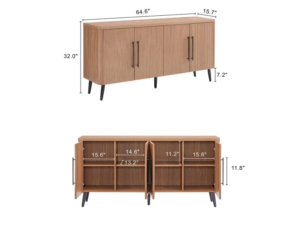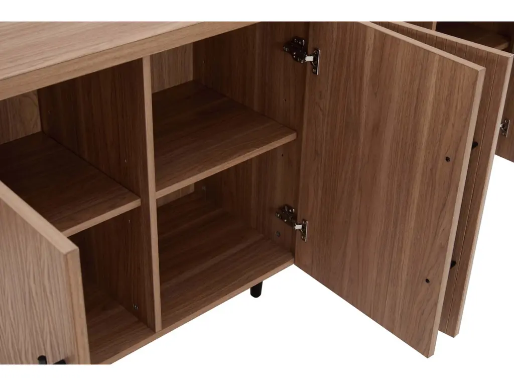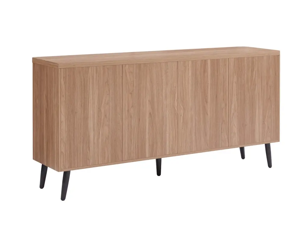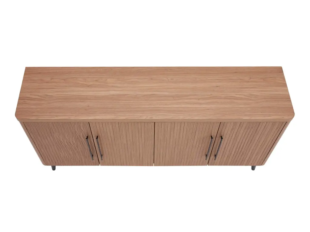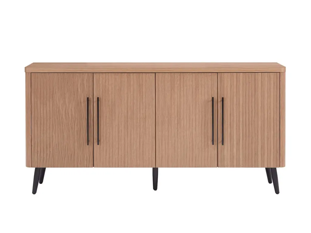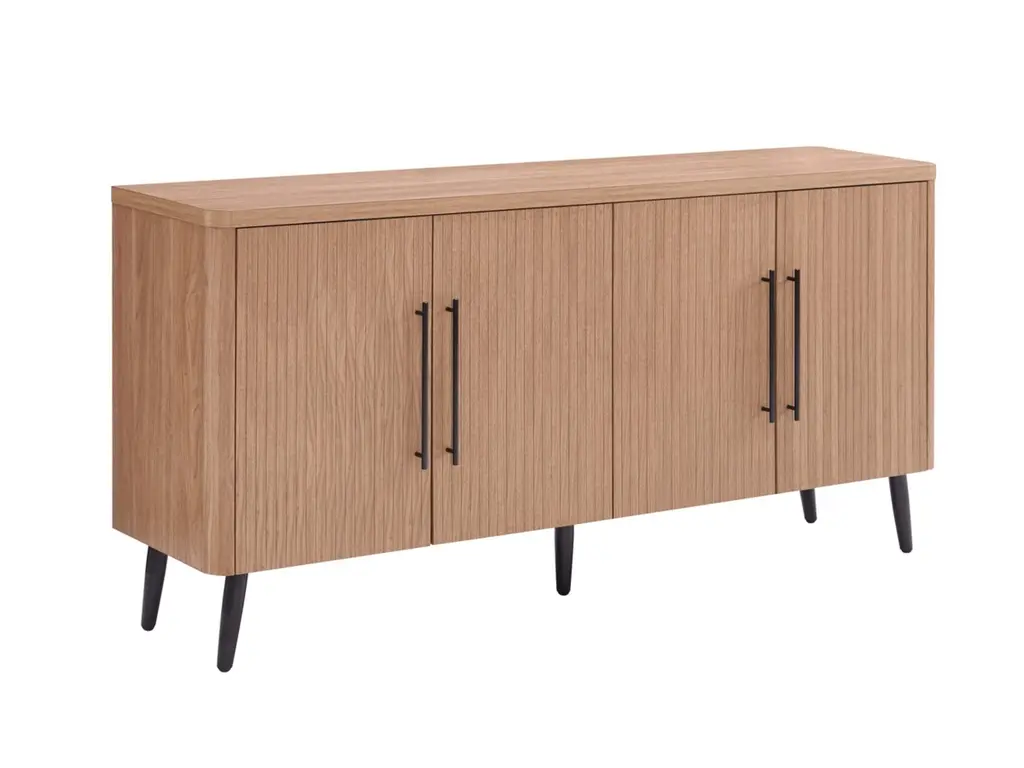 Introducing the Jodie Collection, a stunning new addition to the realm of Mid-Century Modern design. Crafted from premium manufactured wood, each piece in this collection showcases exquisite wood ribbed drawers and doors, adding a textured sophistication to your living space. The sleek black metal handles complement the splayed metal legs, creating a harmonious blend of elegance and contemporary flair. The Jodie Collection redefines style and function, offering timeless pieces that seamlessly enhance your home decor with a touch of modern nostalgia.