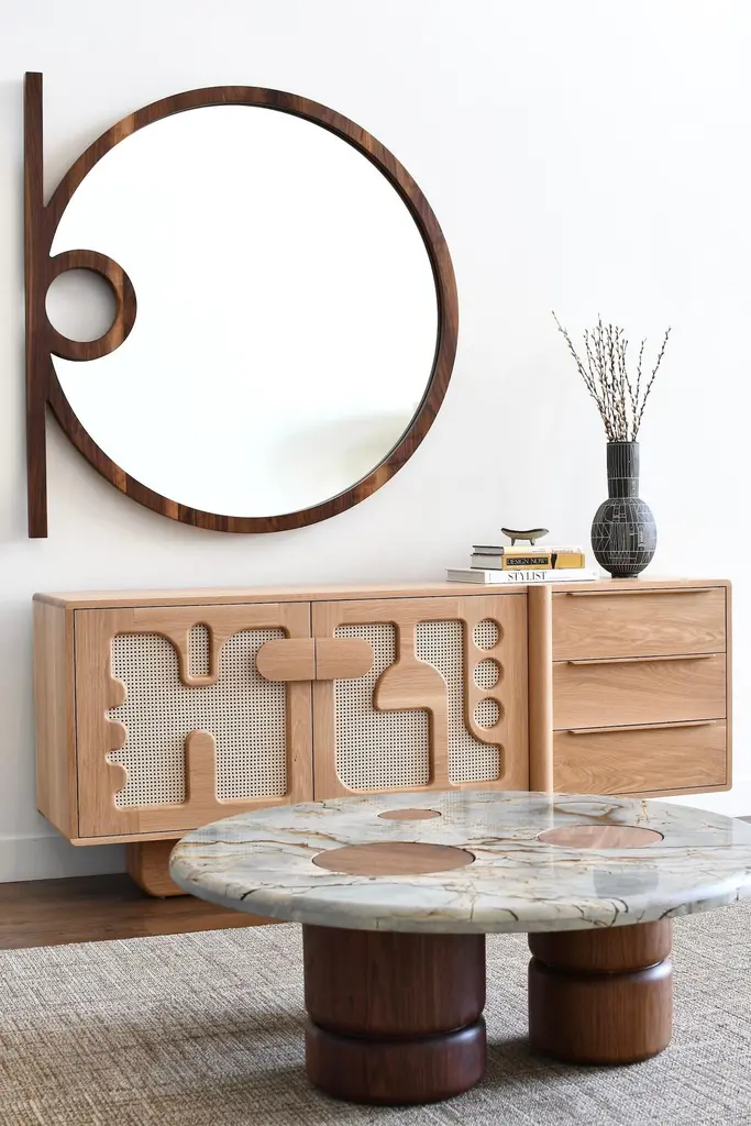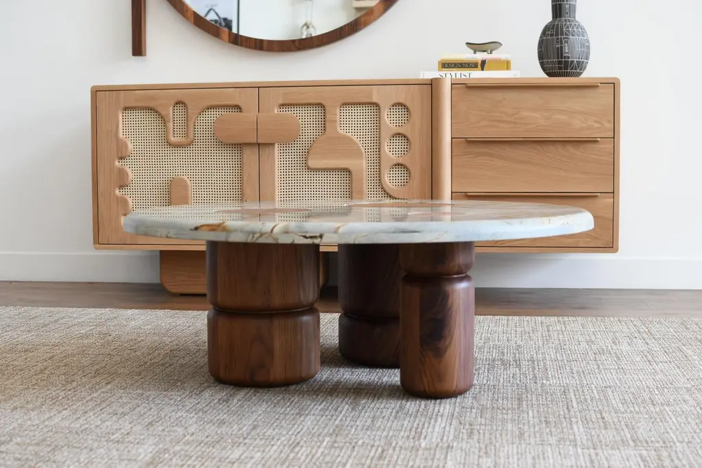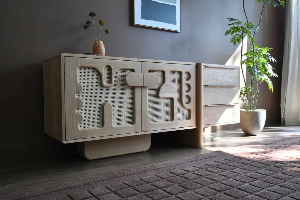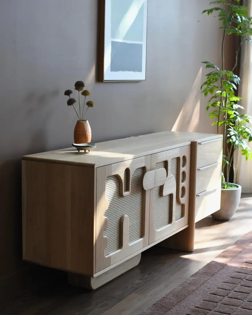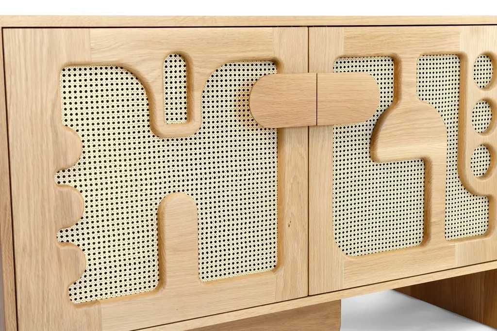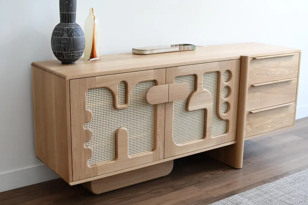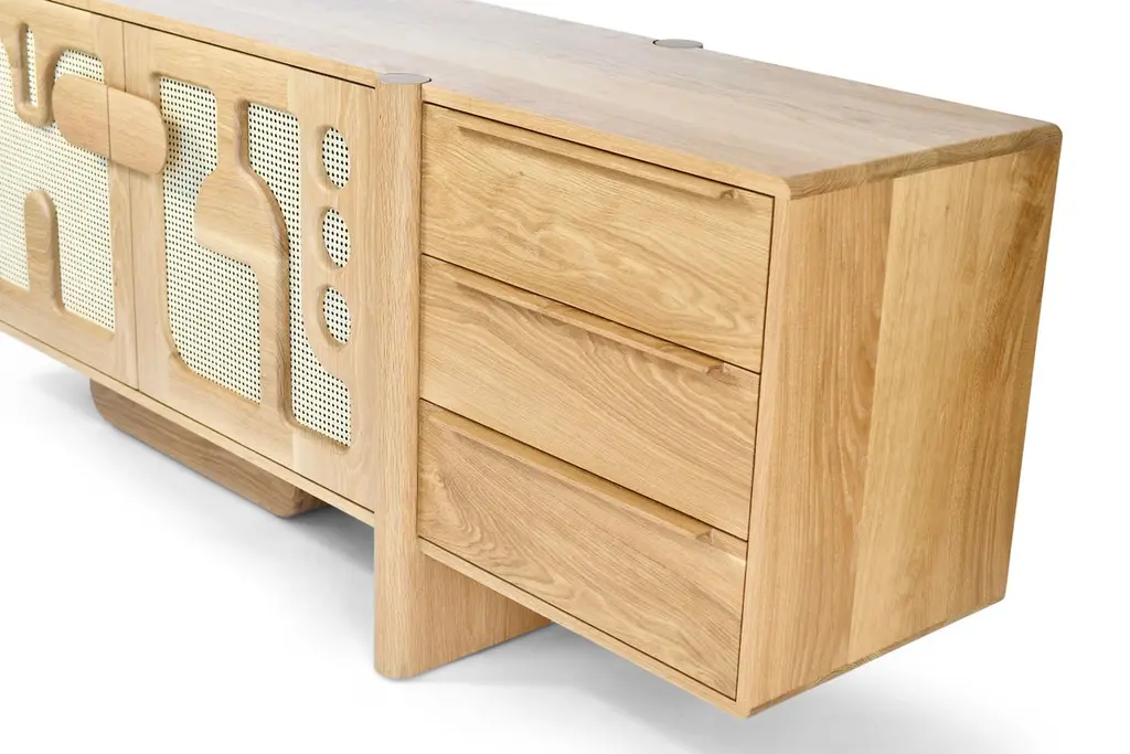 The Marais Credenza finds its inspiration from the bold 1970’s French graphic design style. These contemporary patterns paired with natural caning provide an elevated sculpted statement that embraces the past.The overall form of this credenza champions the foundations of the Danish Modern Movement. Rooted in functionality, every curve and feature is meticulously crafted to ensure aesthetics and utility go hand in hand. A modern sculpted design that honors the traditions of natural materials applied in a sustainable and timeless approach. Handcrafted in Los Angeles