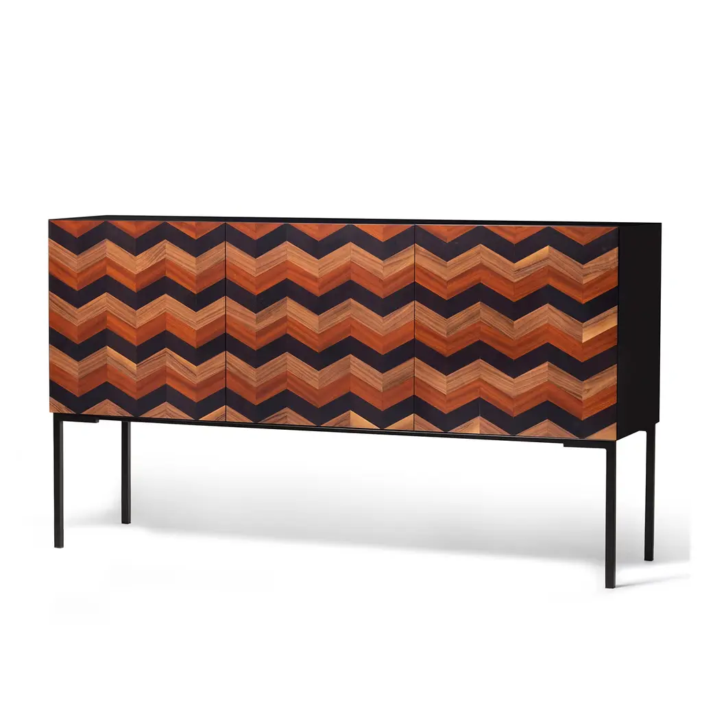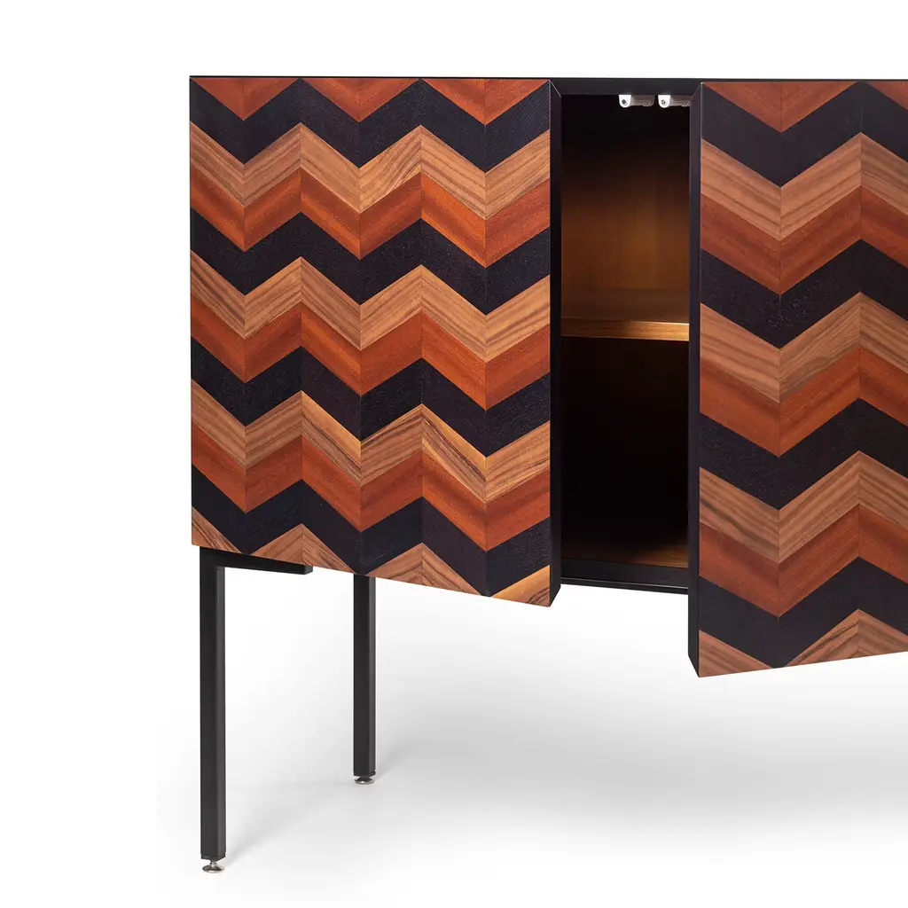 Named after the Italian word for "tide", this spectacular sideboard is distinguished by a waved motif that draws inspiration from the dreamy and fascinating image of a sunset on the sea. Deftly handcrafted, it is fashioned of black ash, Canaletto walnut, mahogany, also available in blue ash. The slim and sturdy legs in black-lacquered iron complete the piece. Please refer to the Concierge for possible customization options.