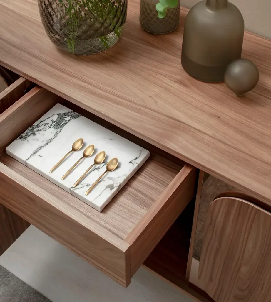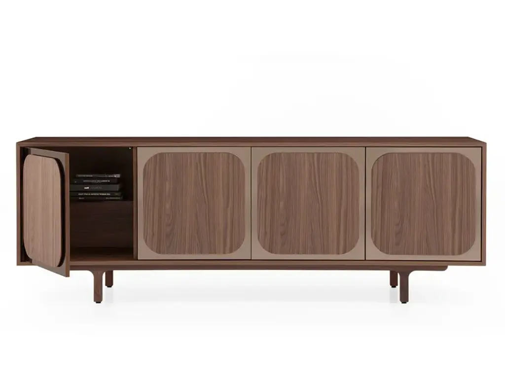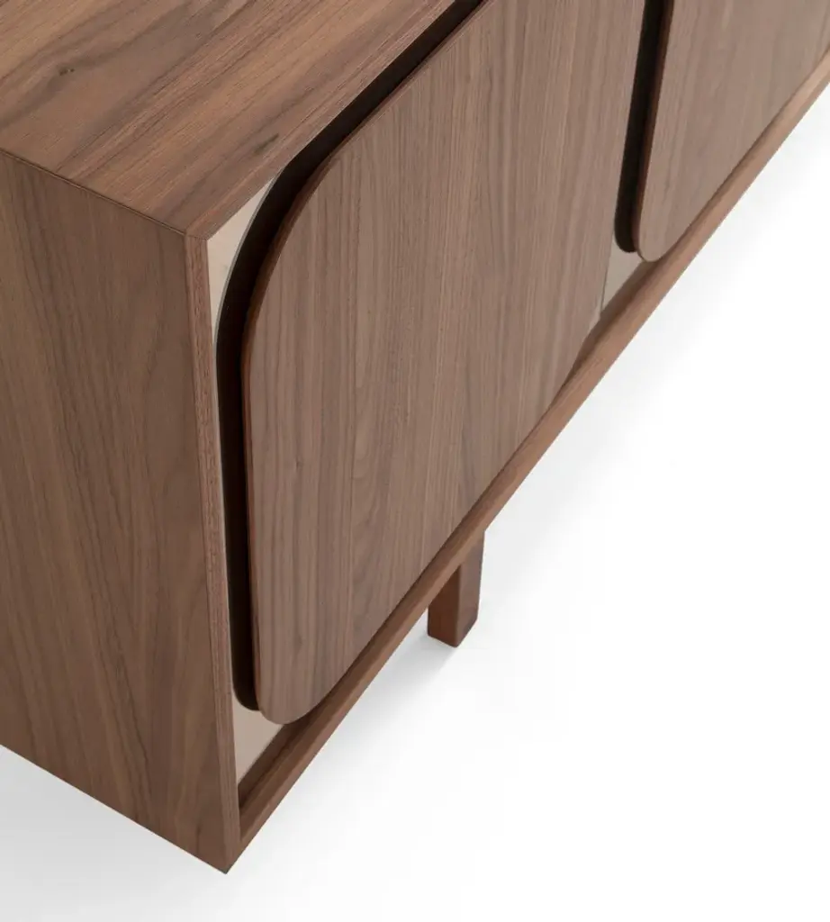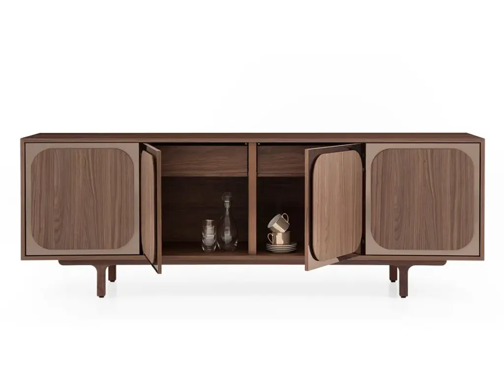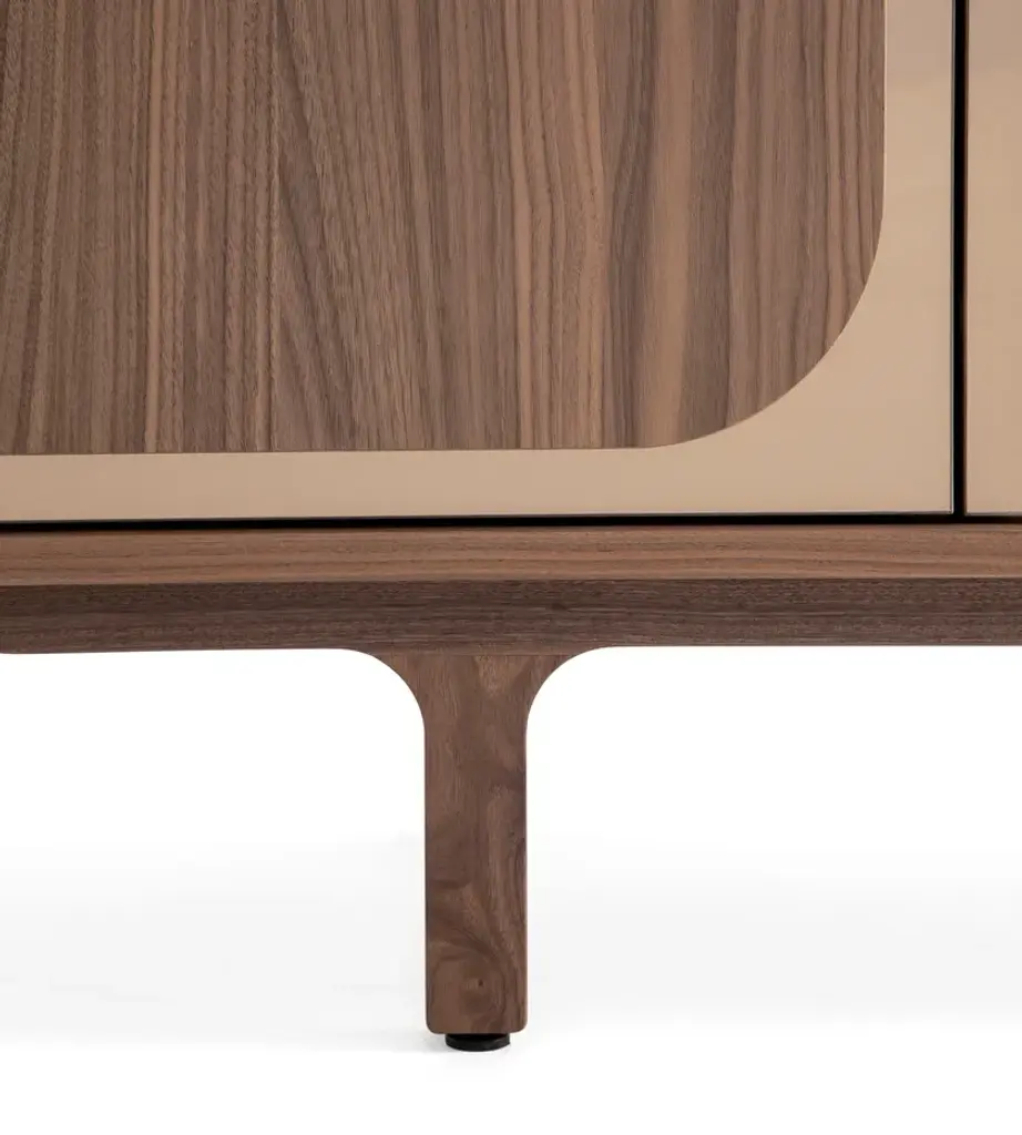 The Margarette sideboard reinvents the art of wood, blending the richness of Canaletto walnut wood into every detail. The doors, enhanced with an elegant mirror, highlight the depth and natural warmth of the wood, creating an emotional balance of textures and colors that transforms any space into a haven of authentic style.DetailsSideboard with 4 doors in MDF veneered with real Canaletto walnut wood. Doors made of bronzed mirror acrylic with an insert in Canaletto walnut wood. Base in solid Canaletto walnut wood. The sideboard internally consists of two drawers in MDF veneered with Canaletto walnut wood and two shelves in 6 mm transparent smoked glass with adjustable shelf supports. Push-pull closure mechanisms for the doors. Additional shelves available upon request. Haute Couture gets its inspiration from high fashion, where stitching, workmanship and materials are at the core of the design. Dressers are outfitted using hand-crafted leather, the furniture is embellished using precious marble, and the wood is selected on the basis of its grain. The synthesis of this collection is a modern line with a contemporary slant that is embodied in a luxury that is not overly flashy but grounded in sophistication. Timeless products made with high quality materials and handcrafted in Italy.