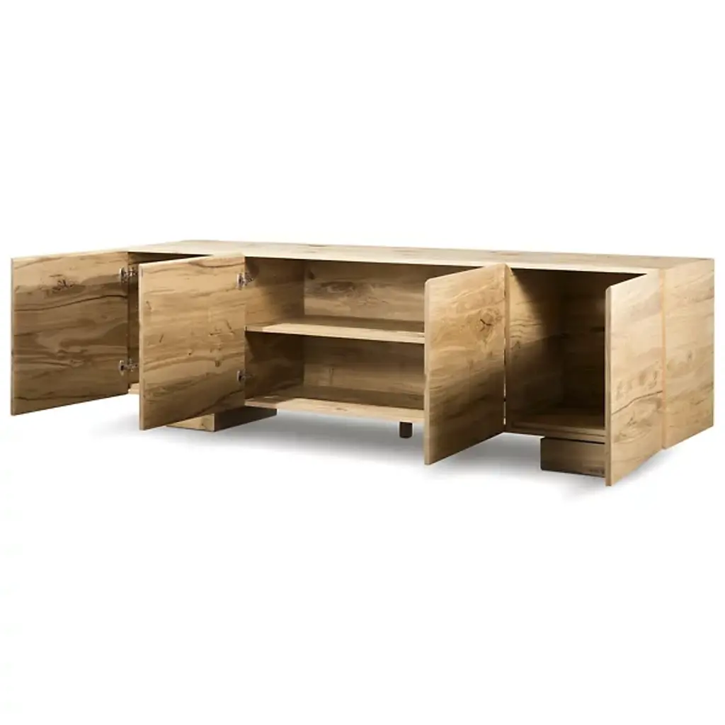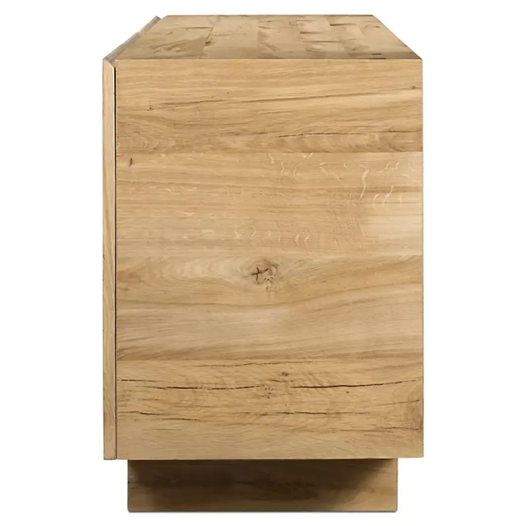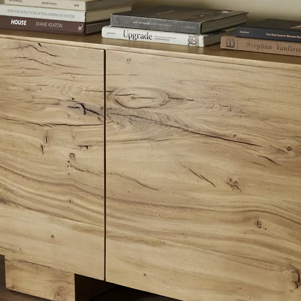 The Mariana Sideboard from Four Hands, a collaborative creation by Thomas Bina and Ronald Sasson, seamlessly blends modern minimalism with subtle Brazilian influences. It’s fashioned from natural reclaimed French oak, while its large-scale silhouette embraces simplicity, allowing the exquisite natural woodgrain to captivate. The construction incorporates three removable and adjustable shelves behind four soft-closing doors, providing a simple style and ample functionality. At the same time, the design, made in Vietnam, beautifully balances contemporary elegance with rustic modern aesthetics, celebrating the beauty of reclaimed materials.