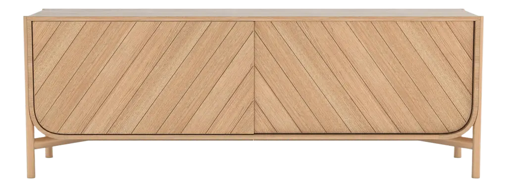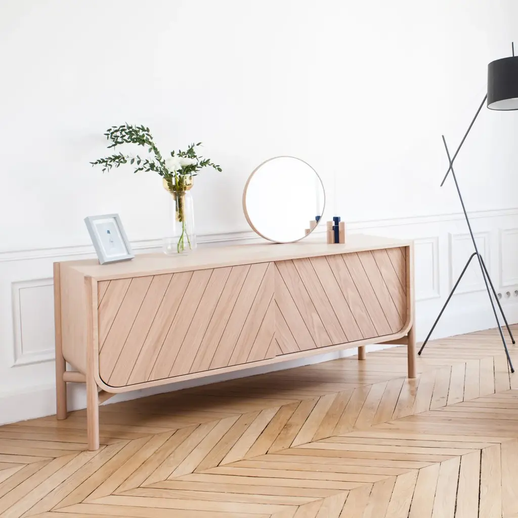 With its distinctive curve in the shape of a ship's hull and the diagonal lines of the frontispiece resembling hoisted sails, Pierre-François Dubois gives his Marius Sideboard a nautical air. Sliding doors allow access from both sides to the generous storage space inside, with one shelf spanning the expanse and a pair of handy cord outlets. From French design brand Hartô, in natural oak finish with doors to match or in contrasting light grey or petrol blue.