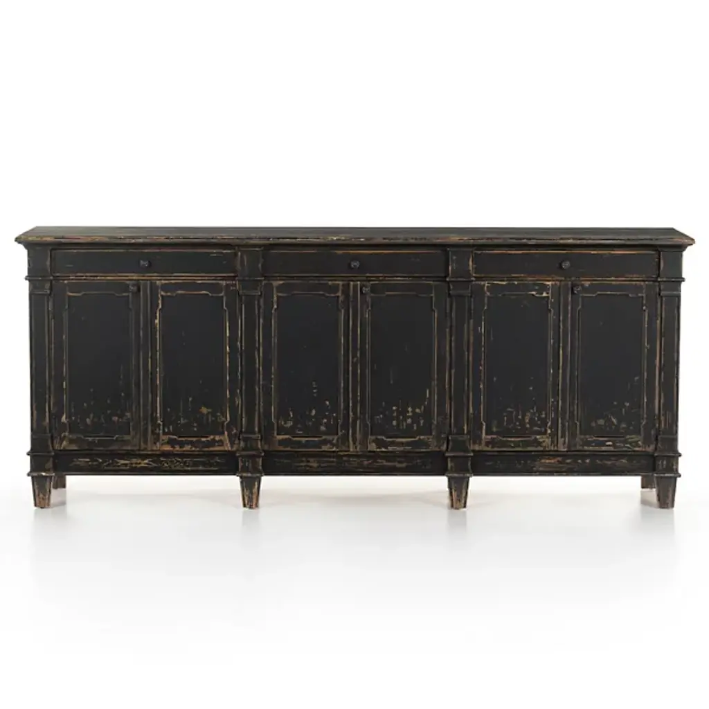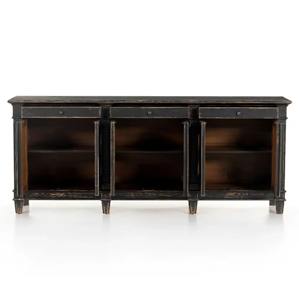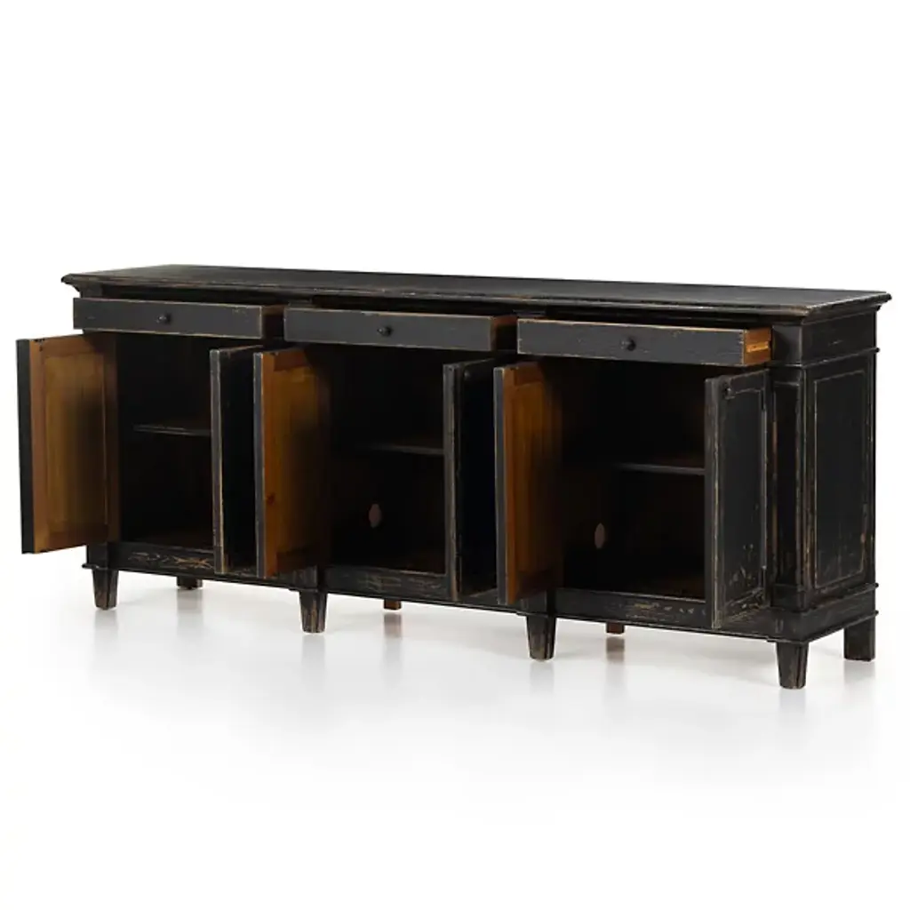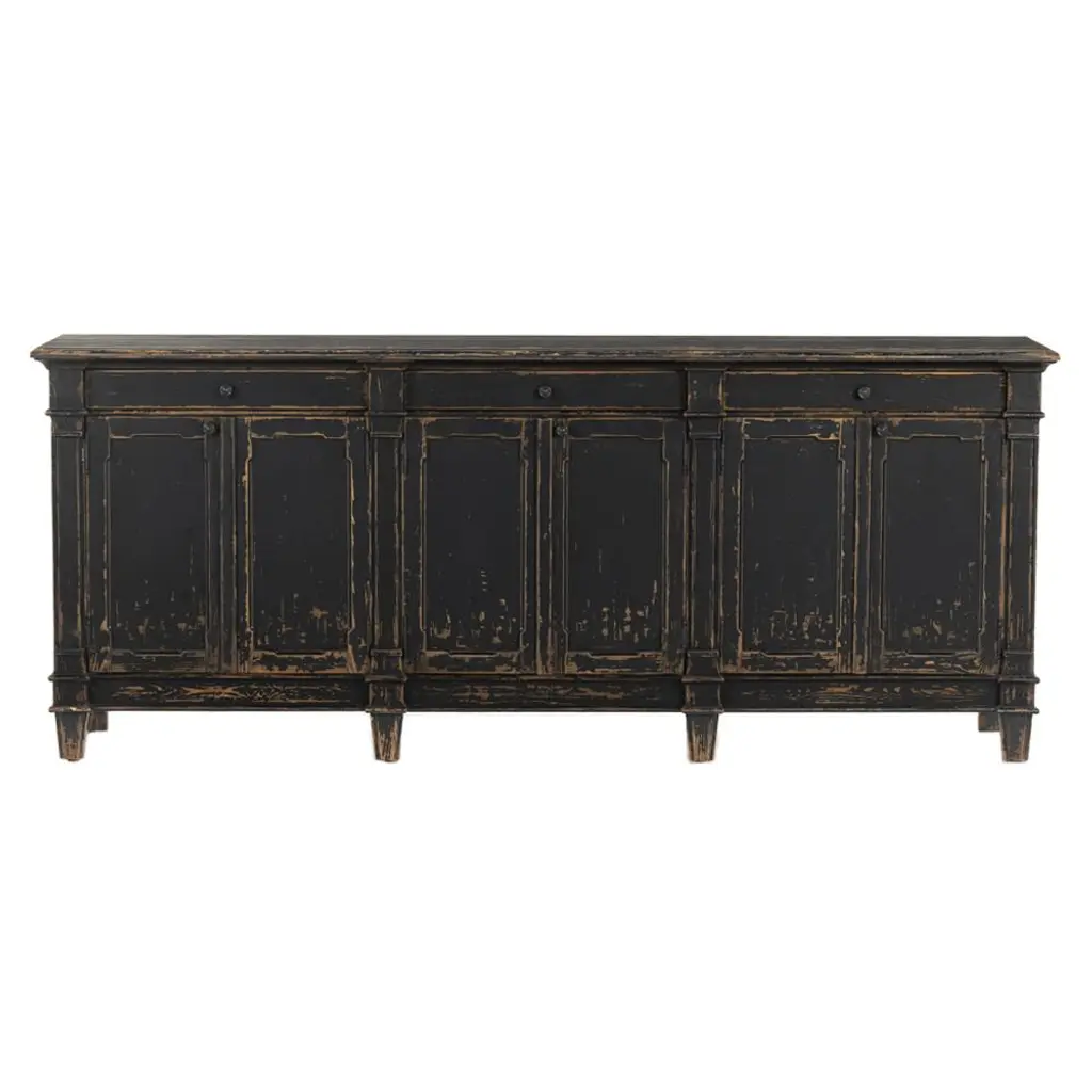 Inspired by European antiques, the Marjorie Sideboard from Four Hands features a distressed black finish with an authentic, heirloom-quality look. The piece's grand scale adds a touch of sophistication to any room while offering ample interior storage with three spacious top drawers. Perfect for organizing dining essentials or living room accessories, the sideboard also includes rear cutouts for seamless cord management, blending old-world charm with modern functionality for a truly timeless addition to your home.