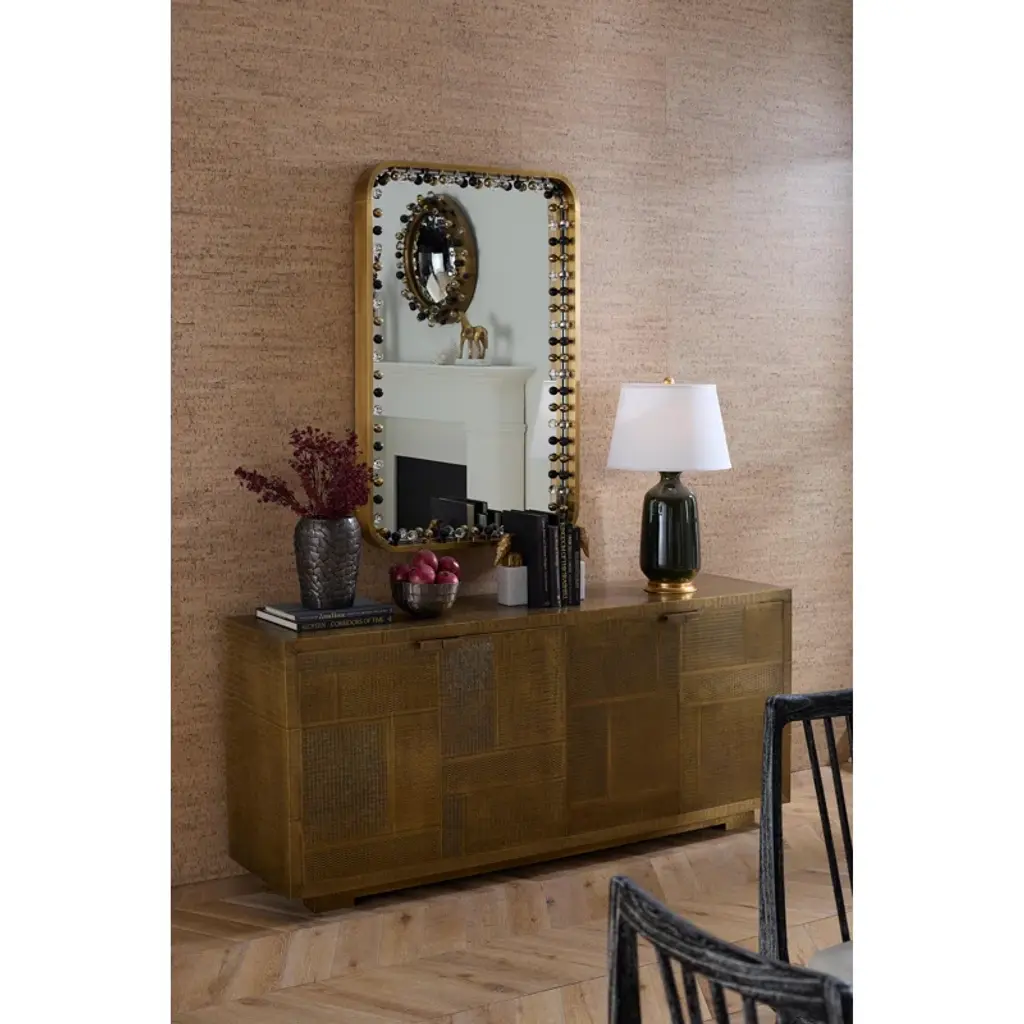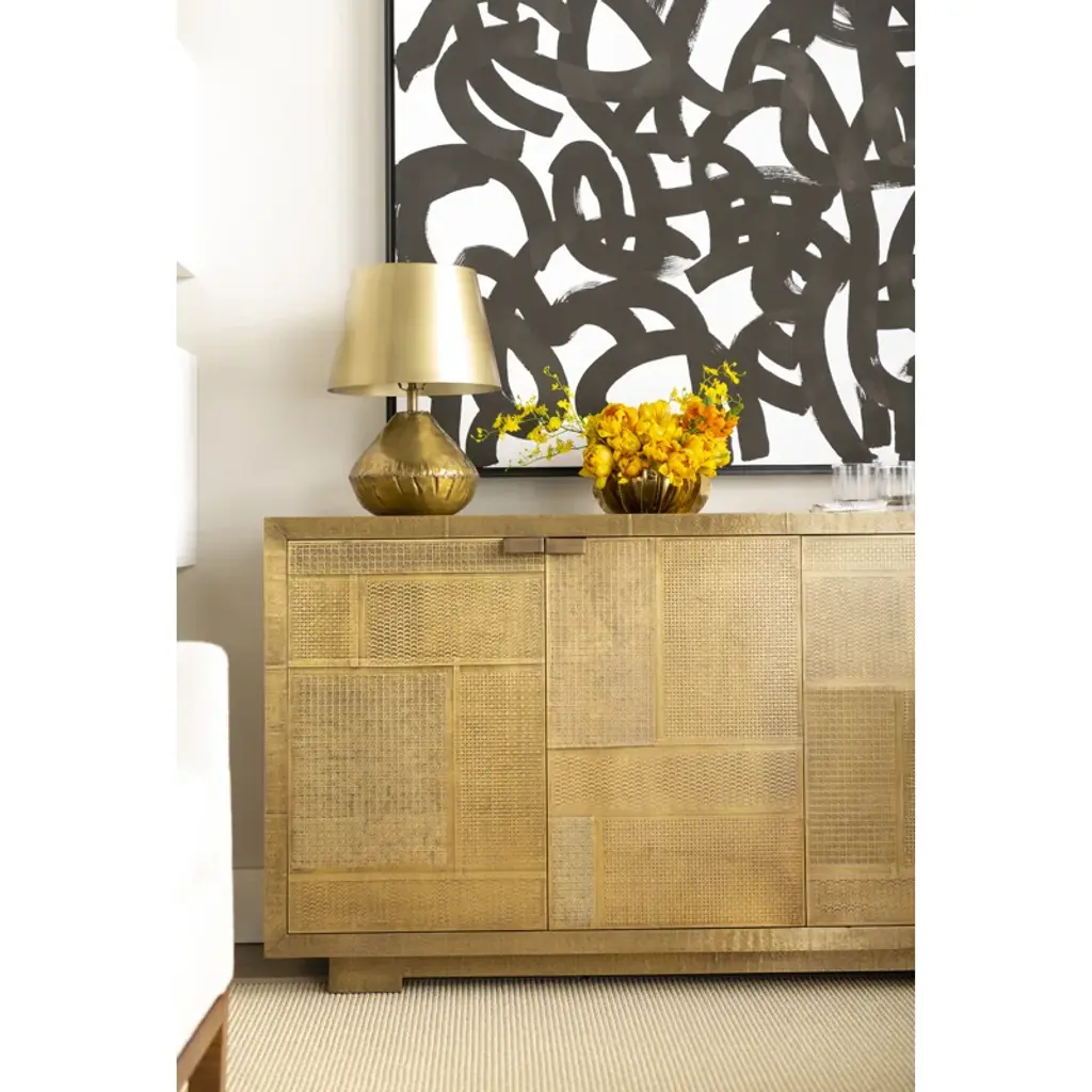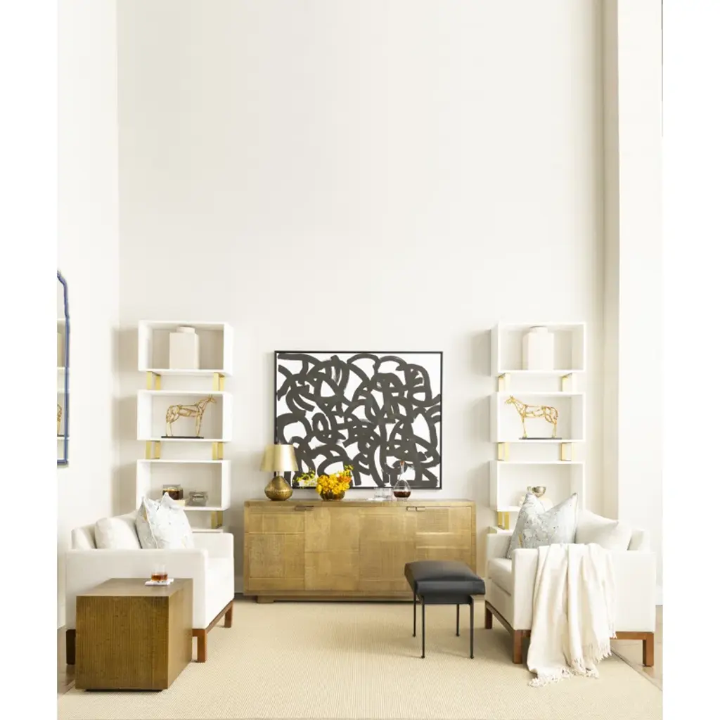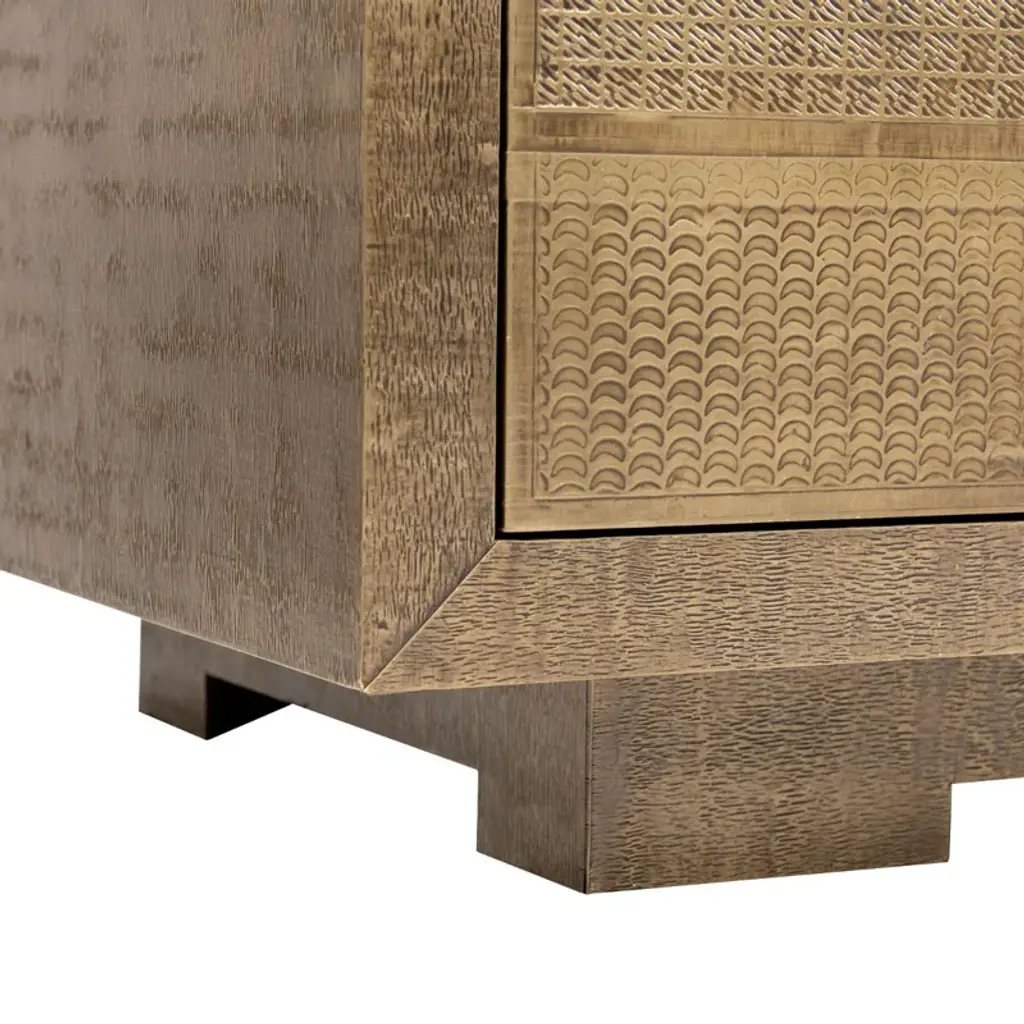 The Randers Collection is designed for a modern lifestyle. It's versatile, with drawers for storage and shelves for components, and stylishly embellished with updated mid-century abstract patterns etched and in repoussé.