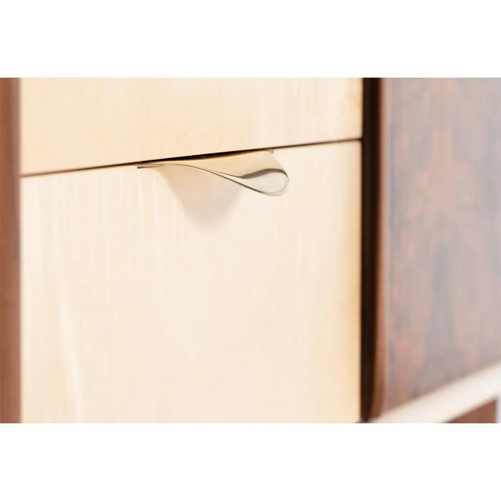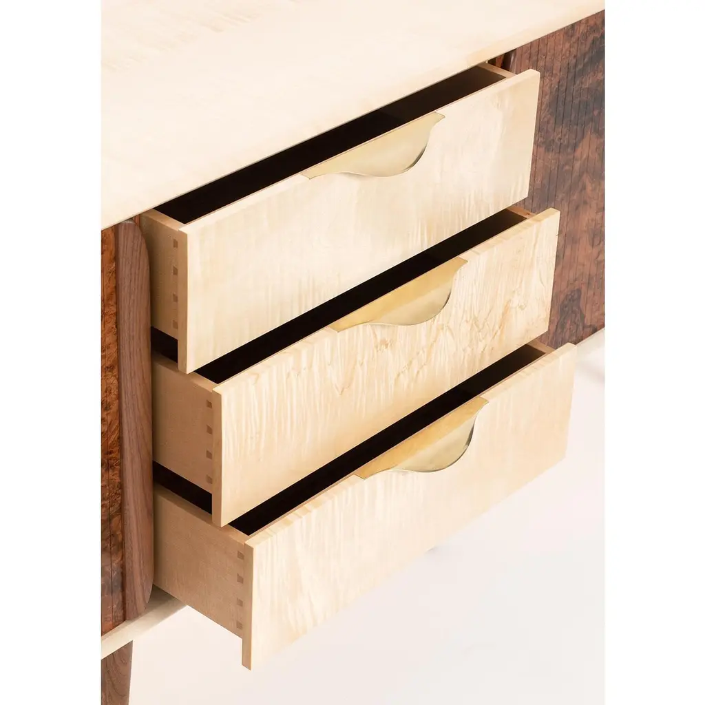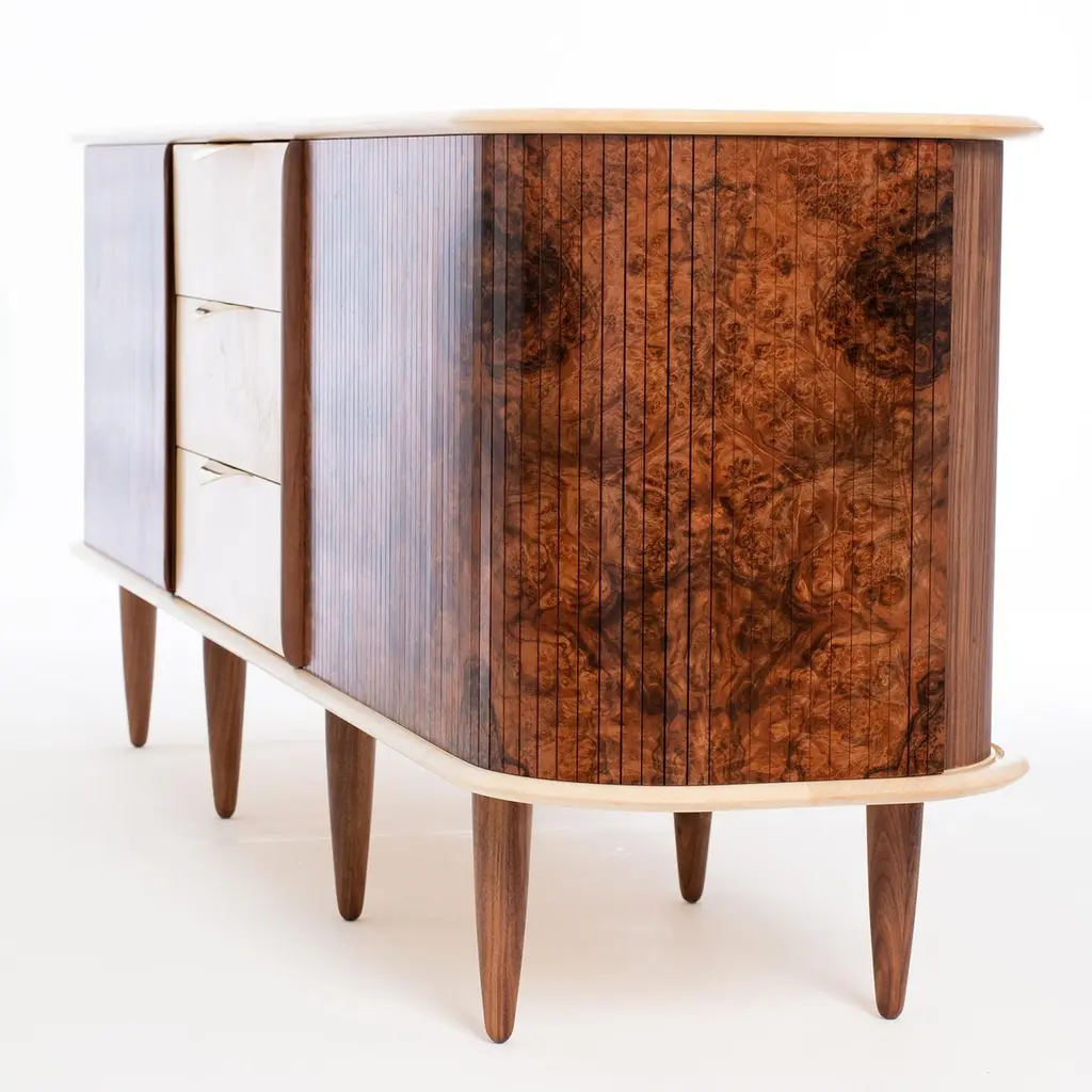 Featuring double gliding tambour doors in stunning walnut burr and solid sycamore central drawers with handcut dovetails, handmade solid brass drawer handles and soft close mechanism, this elegant two metre long sideboard is a statement piece for any room. Suitable for home or office it can be modified on request to fit bespoke requirements.The soft curved sides and silken rippled top and bottom in solid sycamore give this piece a sculptural feel and an unmistakable air of luxury.