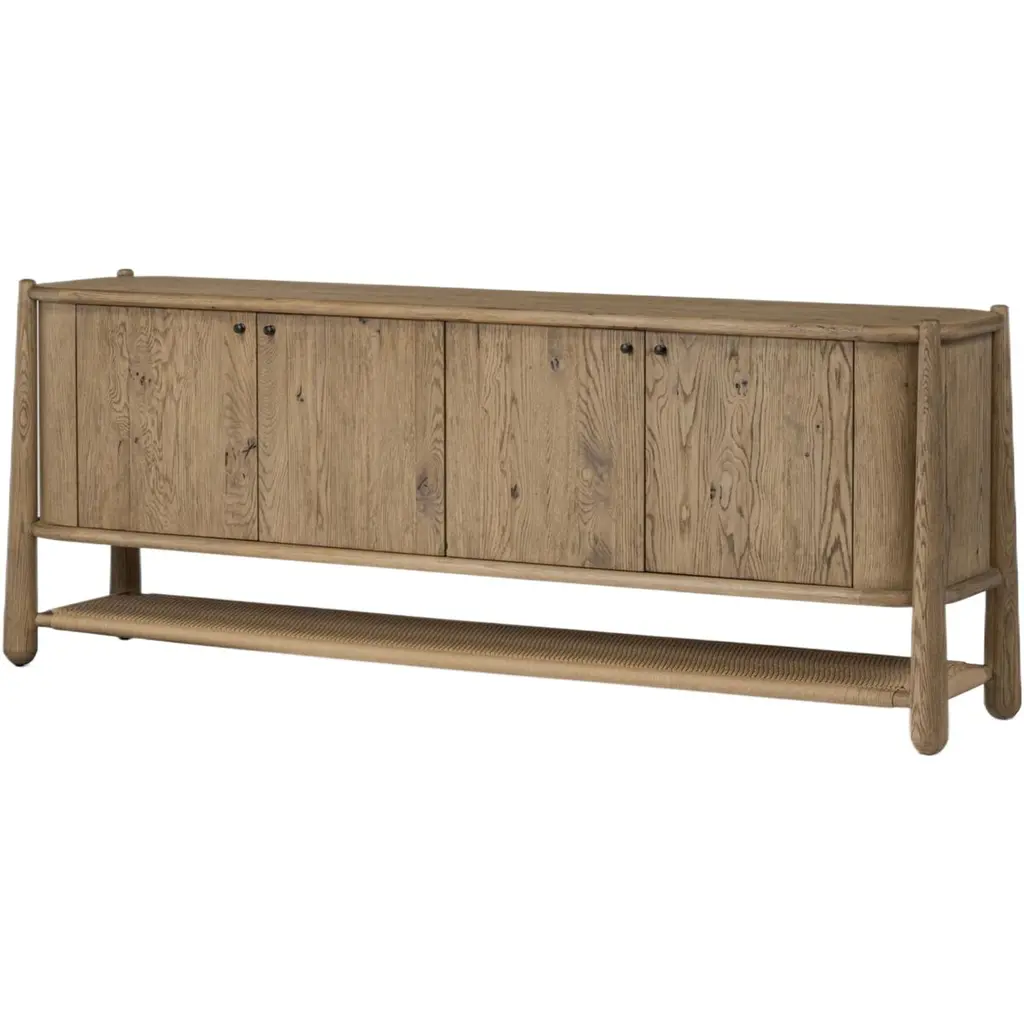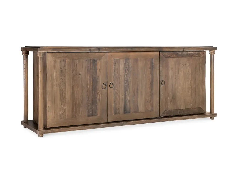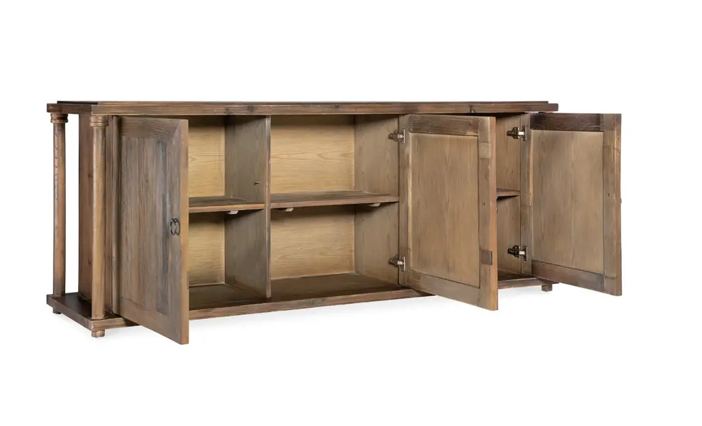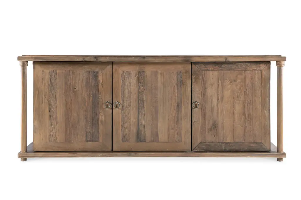 The Mainstay set is an exceptional design in architectural furniture. Built of a recycled pine and elm in a natural light brown wash, the Mainstay Sideboard Buffet is known for its wood framed pallet and signature pillars with spacious three door storage and beautiful wooden countertop. Along with the Sideboard, you will find the signature Mainstay framed in a Console and Cabinet design as well.