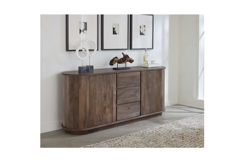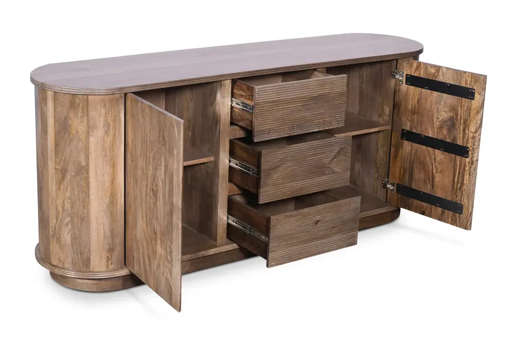 Experience the beauty and functionality of the Maude Sideboard. Crafted from solid mango wood, this thoughtfully designed storage solution features two shelf-divided cabinet areas with adjustable and removable shelves, offering ample and easily organized storage space. Its distinctive racetrack shape and plinth base give it a uniquely modern silhouette that stands out in any home with a natural wood stain finish and matte lacquer top coat to add a touch of elegance.