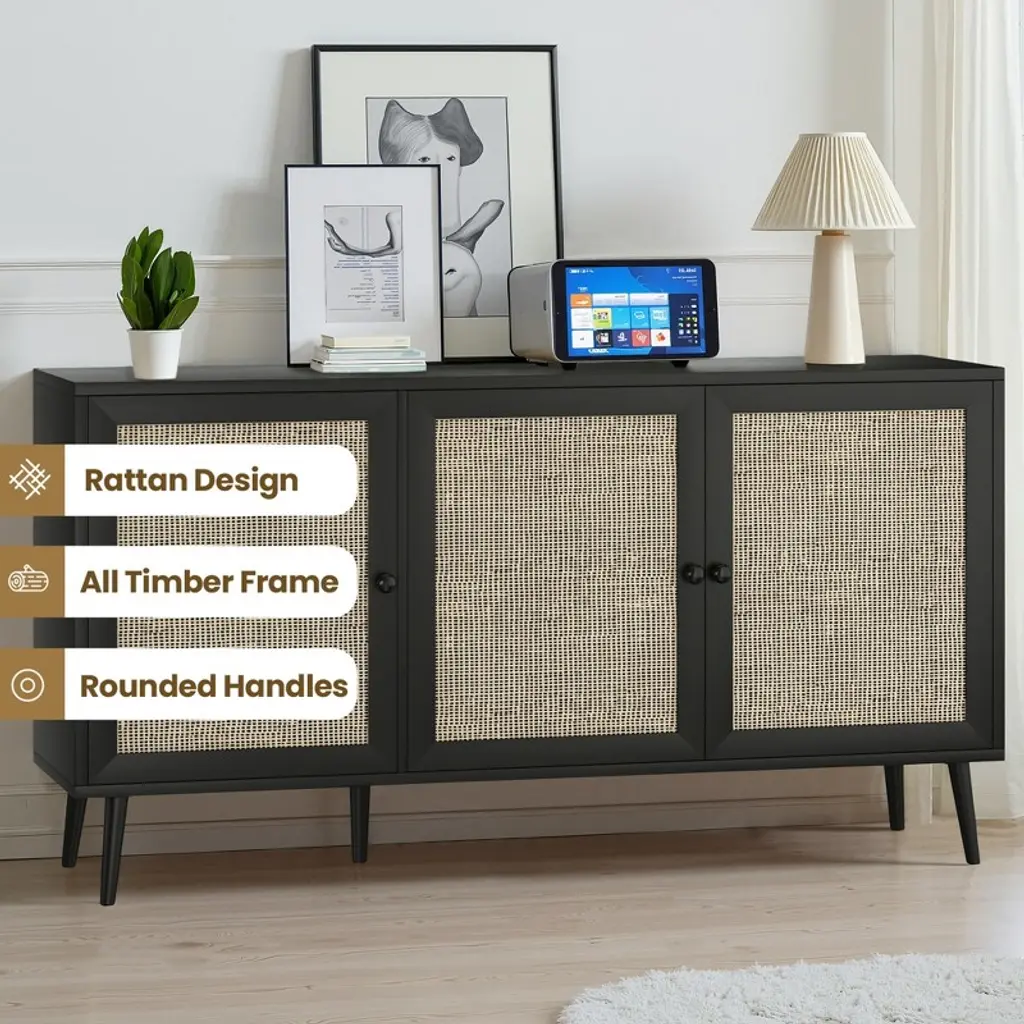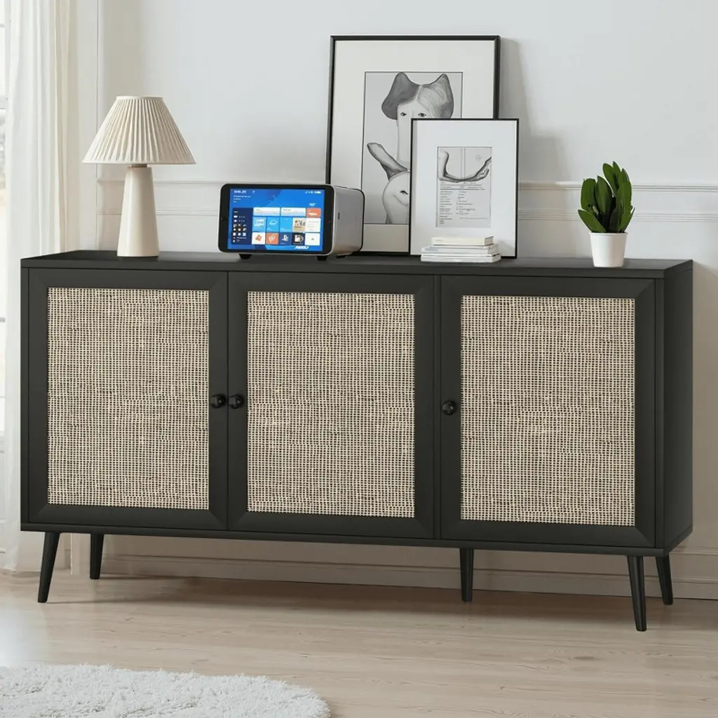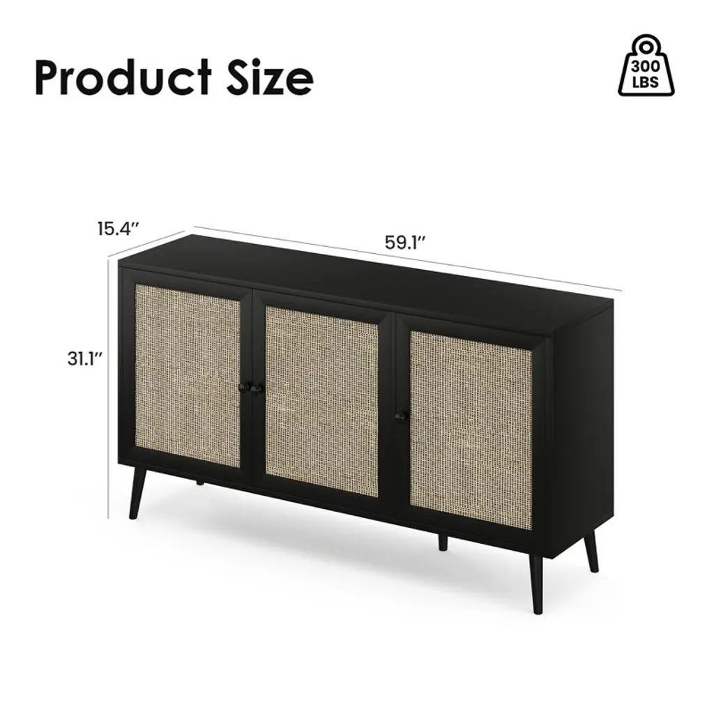 Mayeerty 59x15x31 Inch Black Modern Sideboard Buffet 3 Rattan Doors For Living Room Entryway