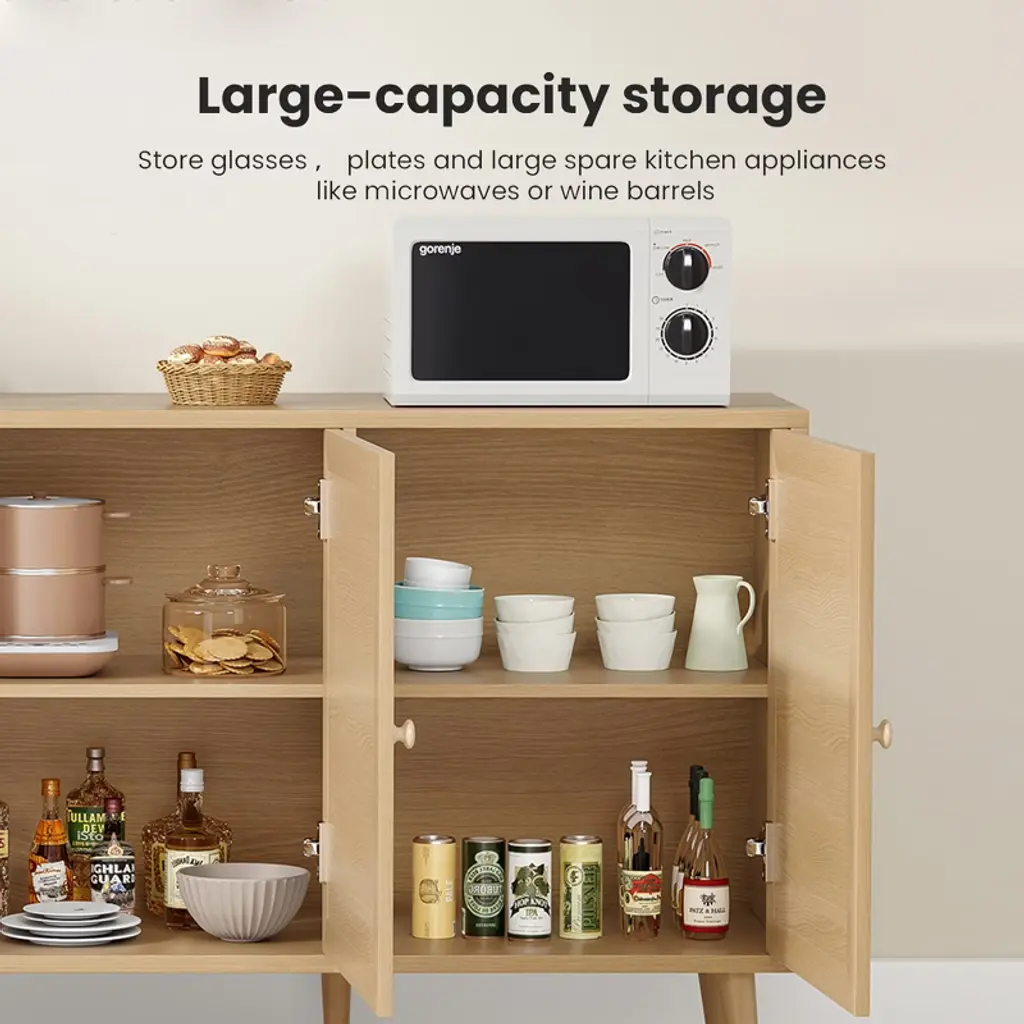 This MAYEERTY sideboard buffet cabinet features natural rattan doors with a handmade look, giving it a charming and slightly rustic appearance. It offers large storage space for books, photo albums, kitchenware, and more. Perfect for use as a dining room sideboard, kitchen cabinet, or buffet server. Made with sturdy wooden boards and thick legs, it can support over 300 lbs and includes anti-tipping components for safety.