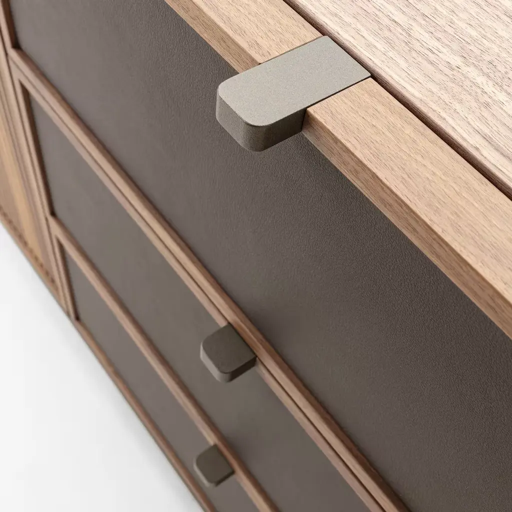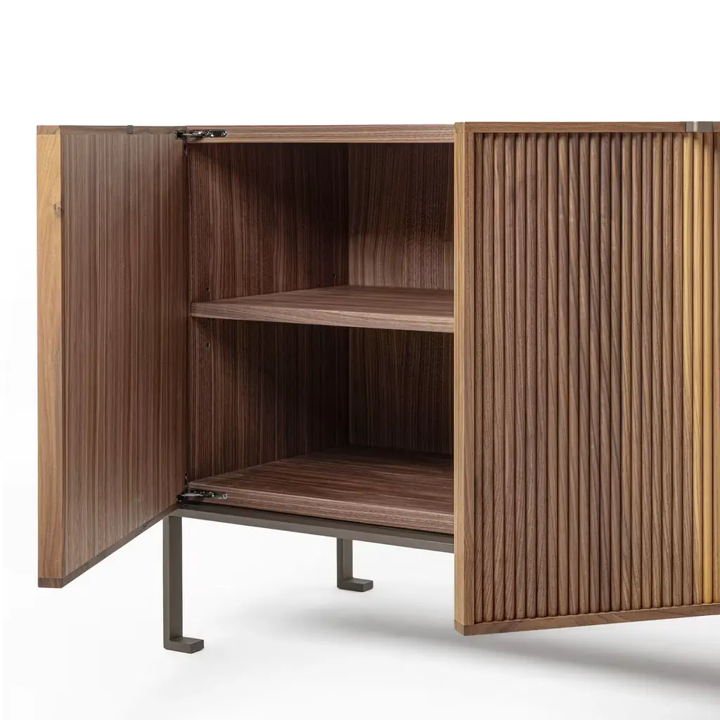 Distinguished by its Canaletto walnut wood and contemporary metal base, this storage masterpiece features a wooden top, two elegantly fluted wood doors, and three drawers adorned with plush leather fronts. Each detail is meticulously crafted to highlight artisanal craftsmanship and timeless design. Available with either three fluted doors or in a variety of wood finishes and sizes, it effortlessly combines versatility with sophisticated charm, promising to enhance any space it occupies.