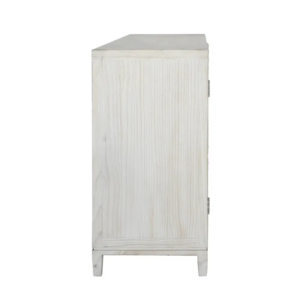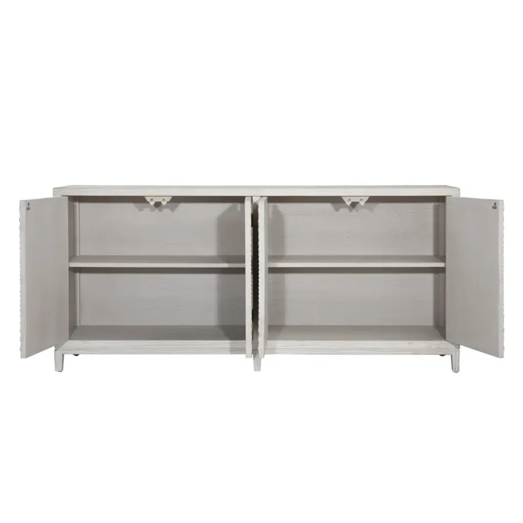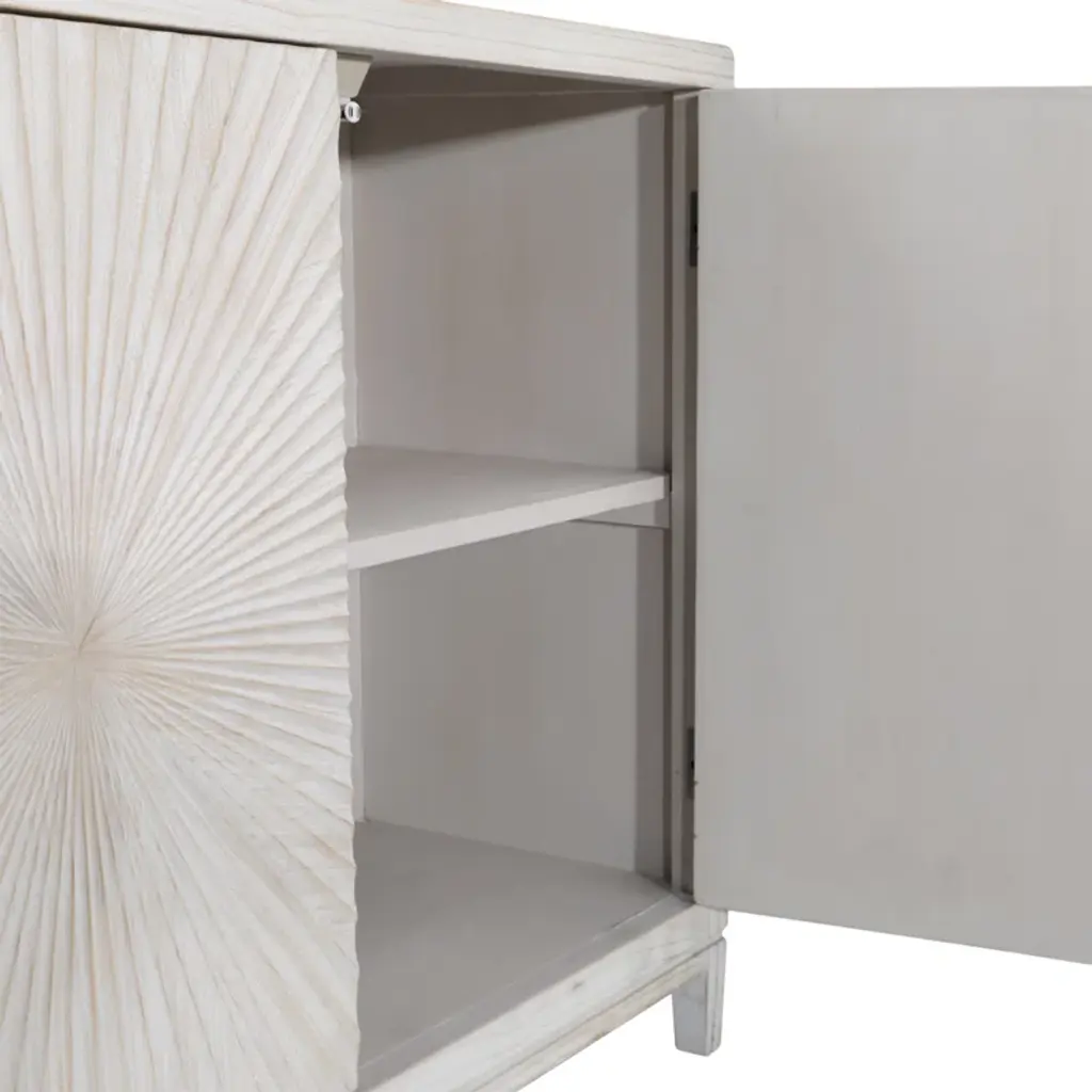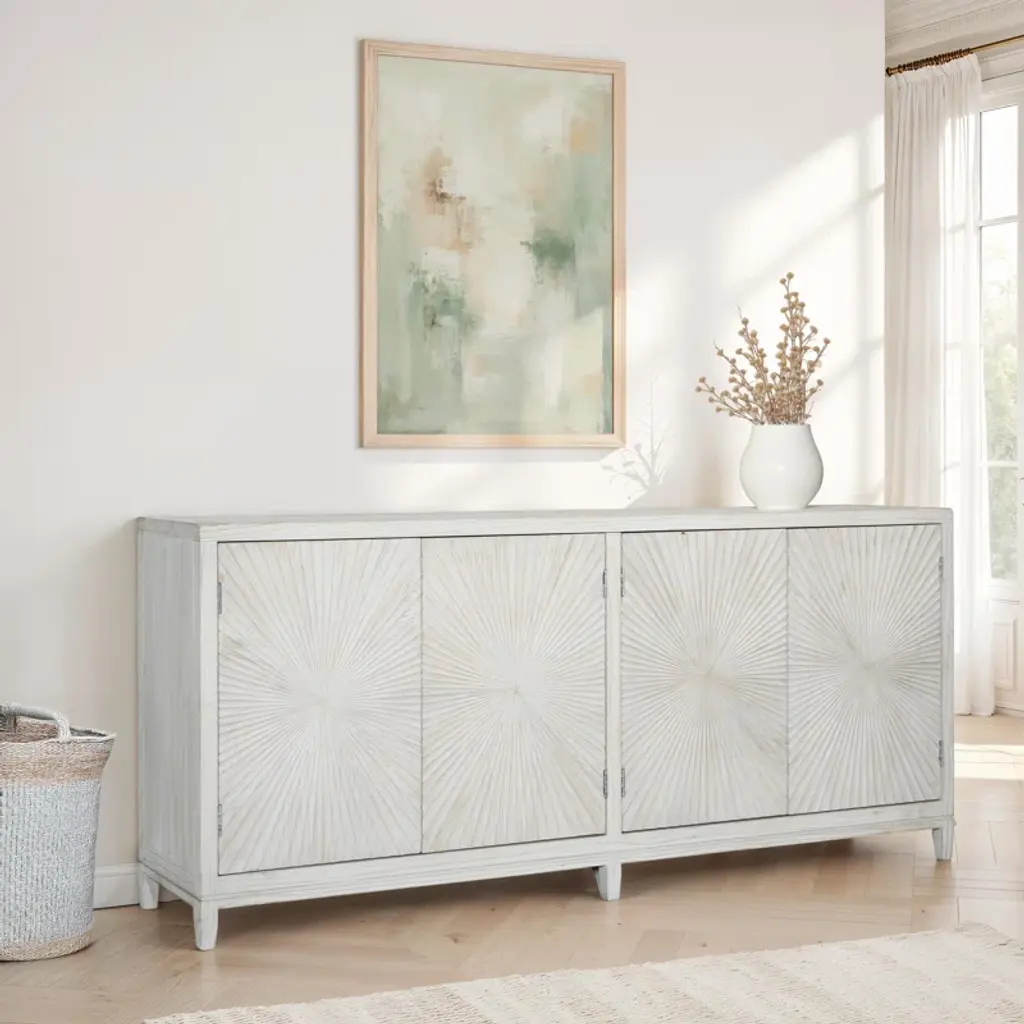 Melrose 79-Inch Pine Light Wash 4-Door Sideboard With Hand Carved Burst Pattern Door Fronts