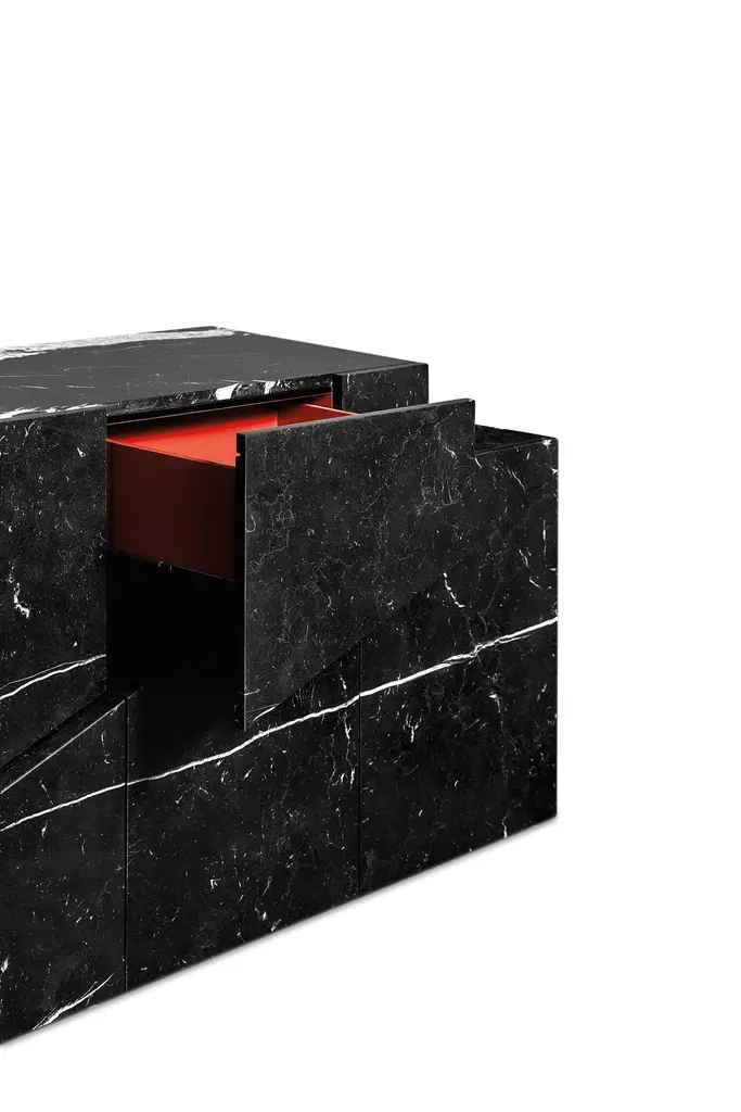 Meridiano Marble Sideboard by Ginger & JaggerDimensions: D 53 x W 200 x H 84 cm. Materials: Marble and lacquer.Finish: Exterior in Negro Marquina marble in polished finishing; interior, drawers, and shelves lacquered in NCS S 4050 R in matt finishing.This product is suitable for custom size. This product is made for living areas and interior spaces only. This product is not specified for bathrooms, spas, or humid environments. Not suitable for exteriors. Available in different finishes. Please contact us.Launched in Europe in 2012, Ginger & Jagger is a product design brand that prides itself on creating handcrafted high-end contemporary products inspired by Nature.Designed and produced in Porto, a land of craftsmen and age-old tradition, Ginger & Jagger’s Earth to Earth collection is an evocative poetic realm, where Nature’s sculptural shapes are made eternal through handcraft, with unique artisanal techniques and an outstanding blend of superb materials such as brass, silver and copper, marble and stone, and wood.The designer's compass is kept by an uncompromising desire for creative innovation balanced with the integrity of the materials, the artisanal techniques employed, and the brand's very own narrative element.The artisanal techniques availed range from brass casting, wood, and marble marquetry, hand-hammered metals, and hand-sculpted marble.Striving towards sustainability. Ginger & Jagger supports organizations worldwide, with contributions indexed to the products crafted every year.