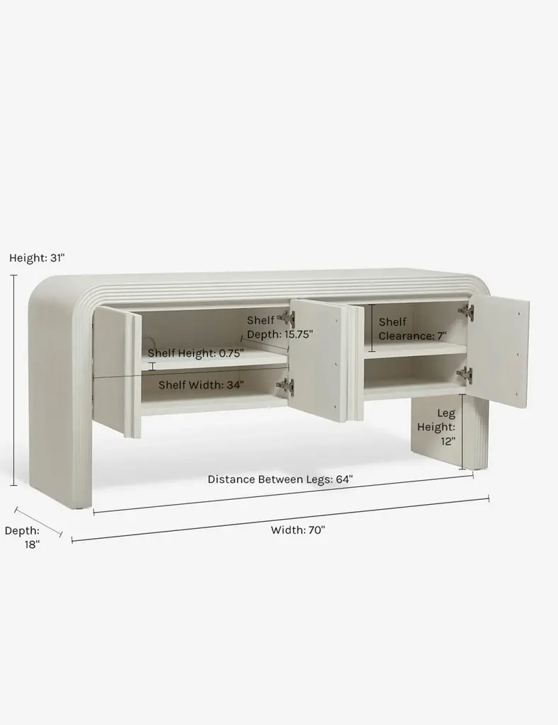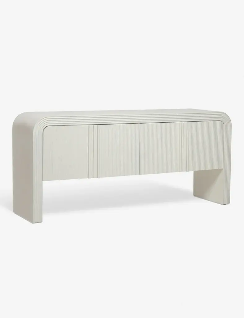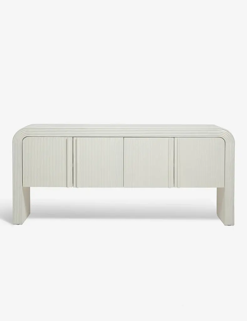 The Merrit sideboard features a deco-inspired woodwork construction that pairs crisp, curving lines with ridged detailing and carved door pulls. With rear cutouts and spacious cabinet storage, it's versatile enough to work as a media console or sideboard. This piece is from our exclusive Sarah Sherman Samuel collaboration and features all the trademarks of her warm, edited style.
