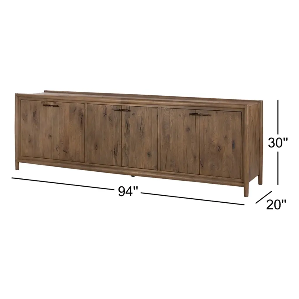 Crafted from reclaimed pine wood, this 84" long 4-door sideboard showcases the beauty of its natural texture in a minimalist design. It features two intentional wood cutouts that add to its natural charm. Available in two beautiful finishes, you can choose from a two-tone light warm wash color with grey wash door panels, or a warm medium brown to add a statement to your dining space.