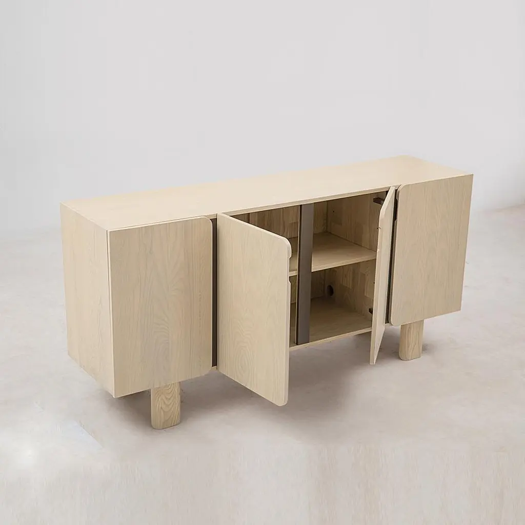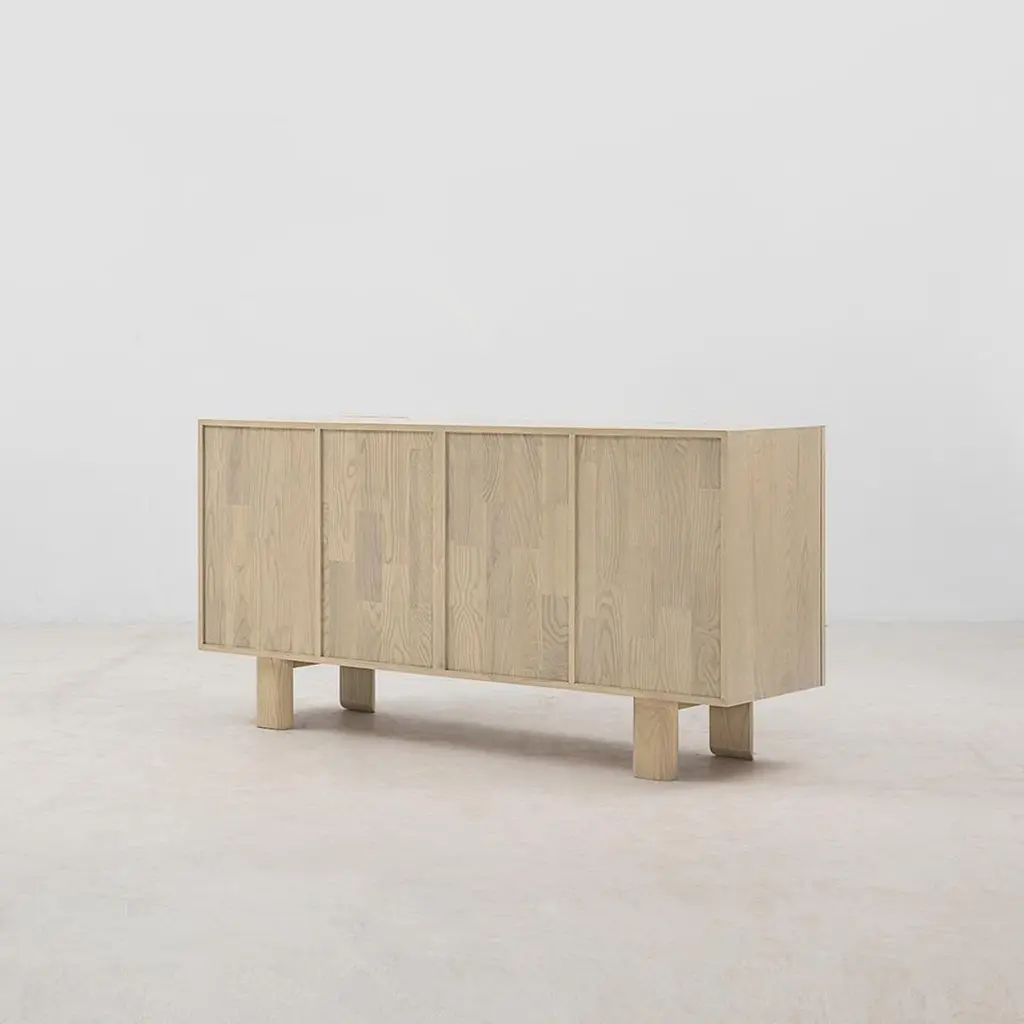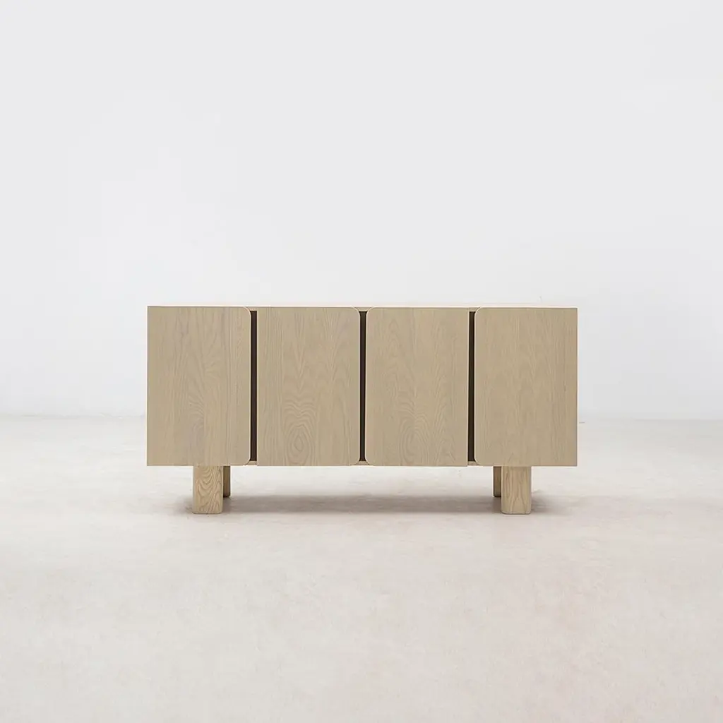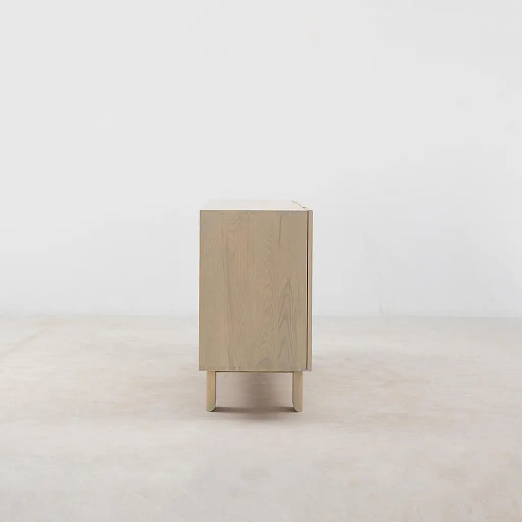 Solid White Ash, rounded corners, soft close doors, and leather details make for a delightful combination in the Mesa Sideboard. Slim and elegant legs gently taper to the ground for a balanced and easygoing silhouette. Wire management details come standard with this piece, including a leather clasp to cleanly gather loose wires together. The Mesa Collection centers around gently floating tops and elegantly tapered legs. The wood joinery is exposed in all its beautiful intricacy, highlighting the beauty of the traditional craftsmanship inherent in each solid wood piece.Maria Yee is a California contemporary furniture design studio established in 1988 with a focus on wellness, material, and craft. Maria, the studio's eponymous founder, began her design journey in the early 1980s in Beijing, where she studied classical Chinese joinery with a master craftsman who restored furniture for the Forbidden City. Over the course of three decades, she would redefine and reengineer the joinery techniques, operate her own factories, and nurture her own design studio. All elements matter at Maria Yee – from responsibly managing forests, fostering new growth to ecologically produced luxurious leathers to meticulously hand forged metal pulls. The brand works hard to sustainably source quality materials and to apply insistently honed techniques to breathe new life into classical craftsmanship.