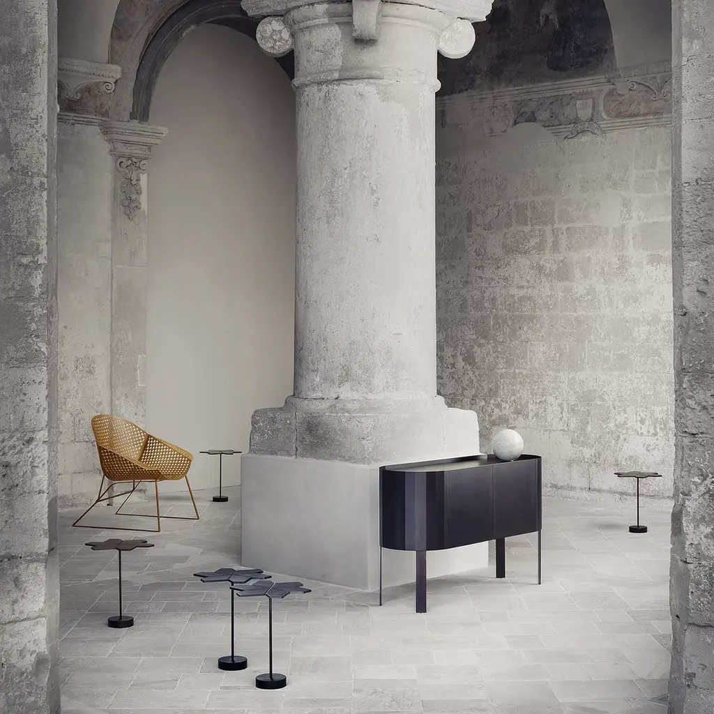 This low sideboard boasts a unique design composed of clean, essential lines. Entirely crafted of steel with a black copper finish, it features two doors curved and slightly cut on the sides. The interior features one steel shelf with MDF core. Available also with honey copper or ash iron finish.