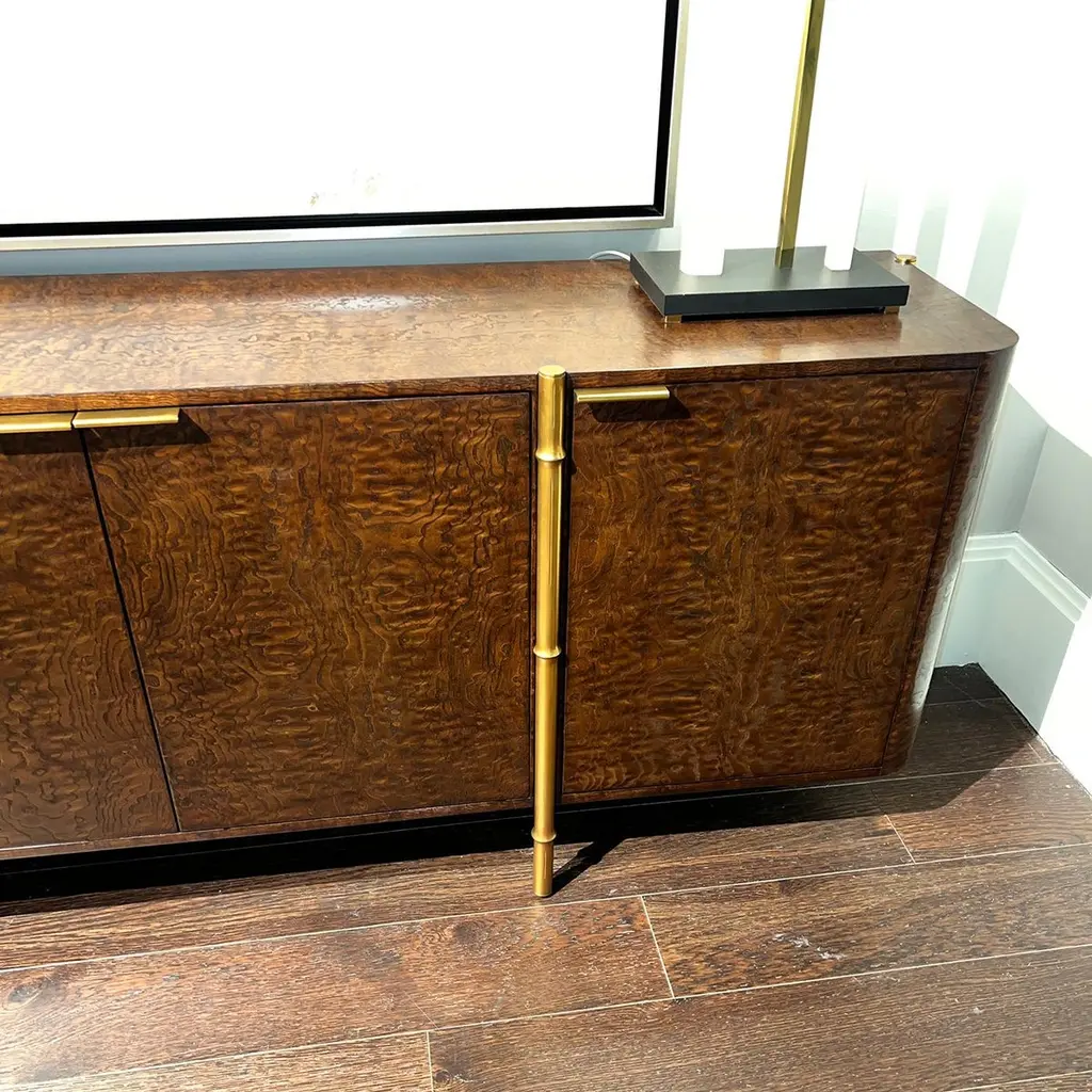 Burl Wood Sideboard, which seamlessly combines contrasting finishes for a sophisticated touch. Featuring a luxurious pyramid brown Tamo ash veneer and an organic metal base, this piece is designed to be a striking focal point in any dining space.Contrasting finishes of pyramid brown and satin brass create a stylish and modern look. The Tamo ash veneer exudes luxury, while the organic metal base adds an industrial chic.Dimensions: 86" W x 18" D x 32" H