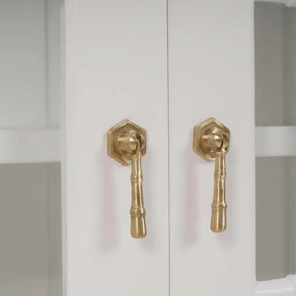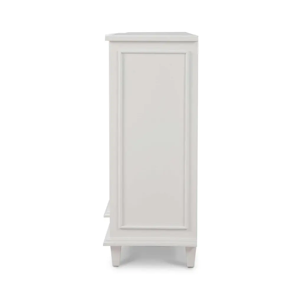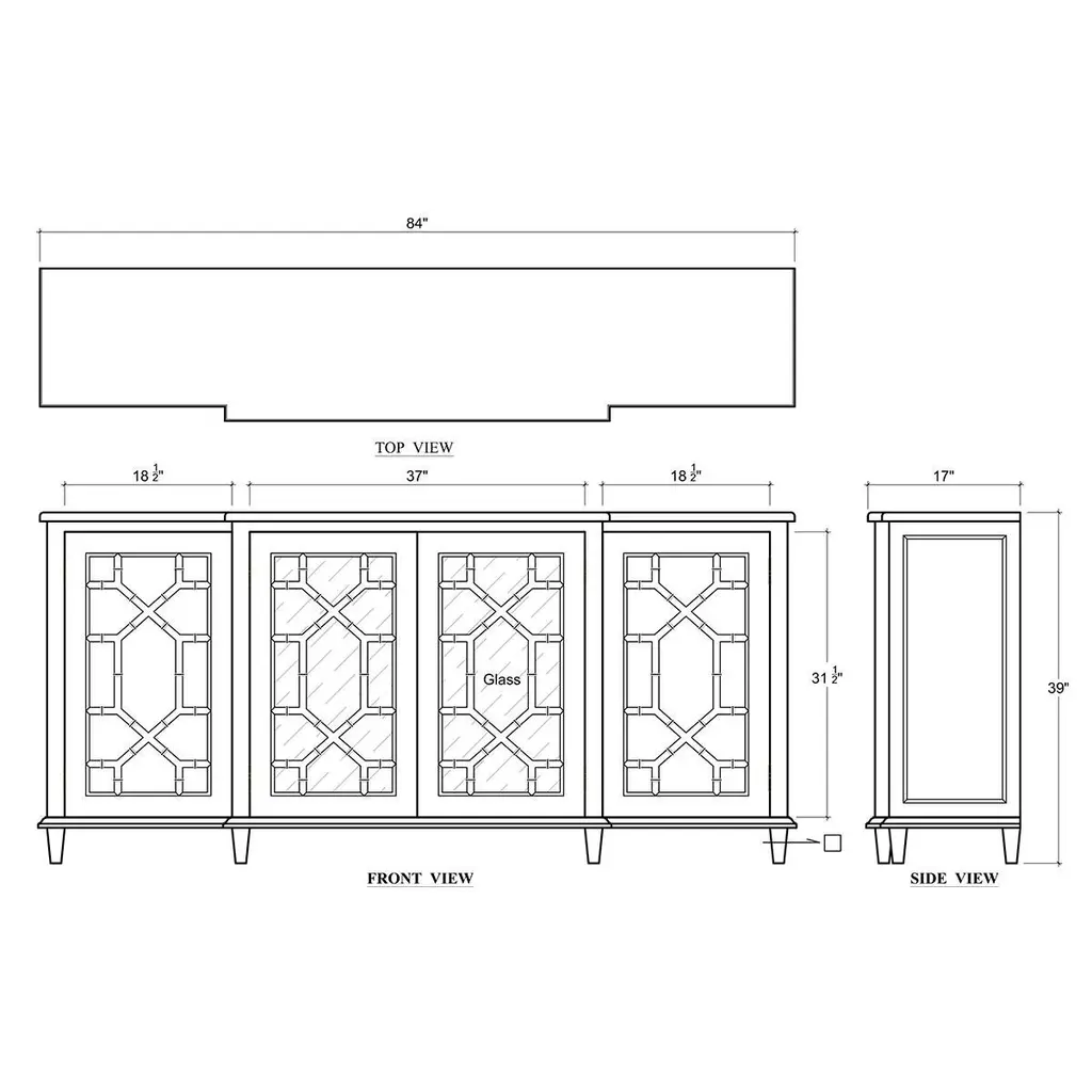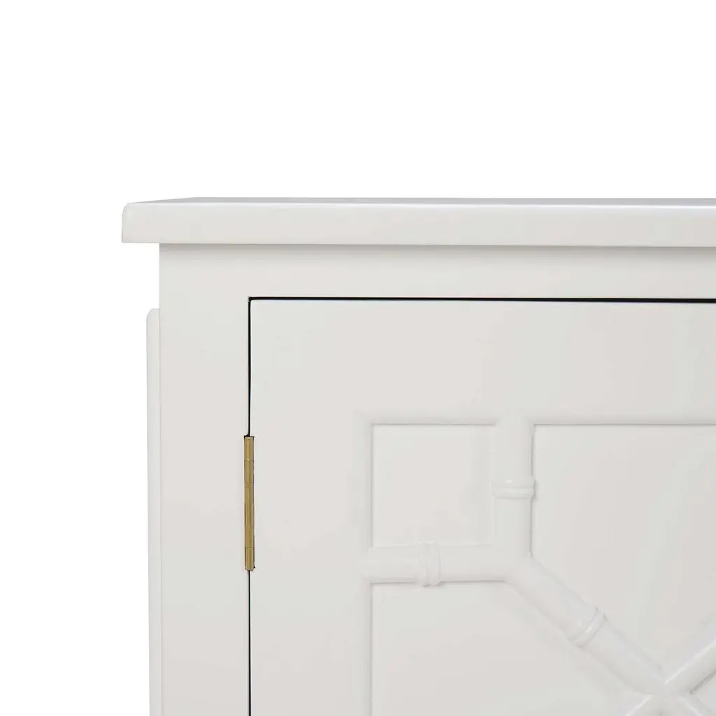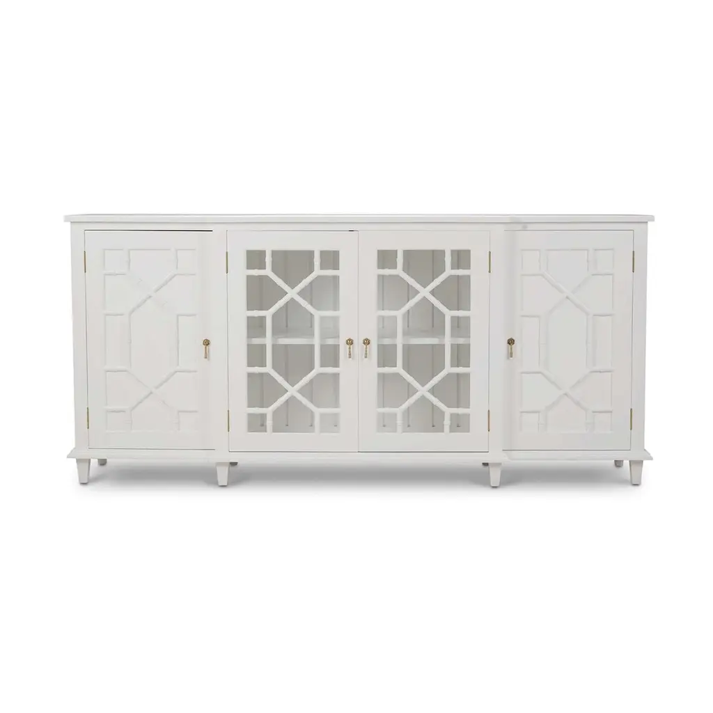 Perfectly balancing style and functionality, Classic Regency designs, and mid century modern elegance, this piece is a stunning addition to any home decor.The breakfront credenza, finished in our True White hand-painted finish, has four doors, two with faux bamboo fretwork and the central doors with glass panes. With brass drop handle pulls and raised on short, square tapered legs.Dimensions: 84" W x 17" D x 39" H