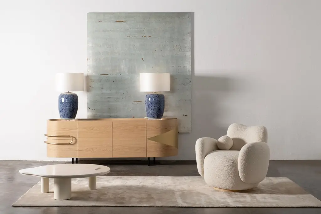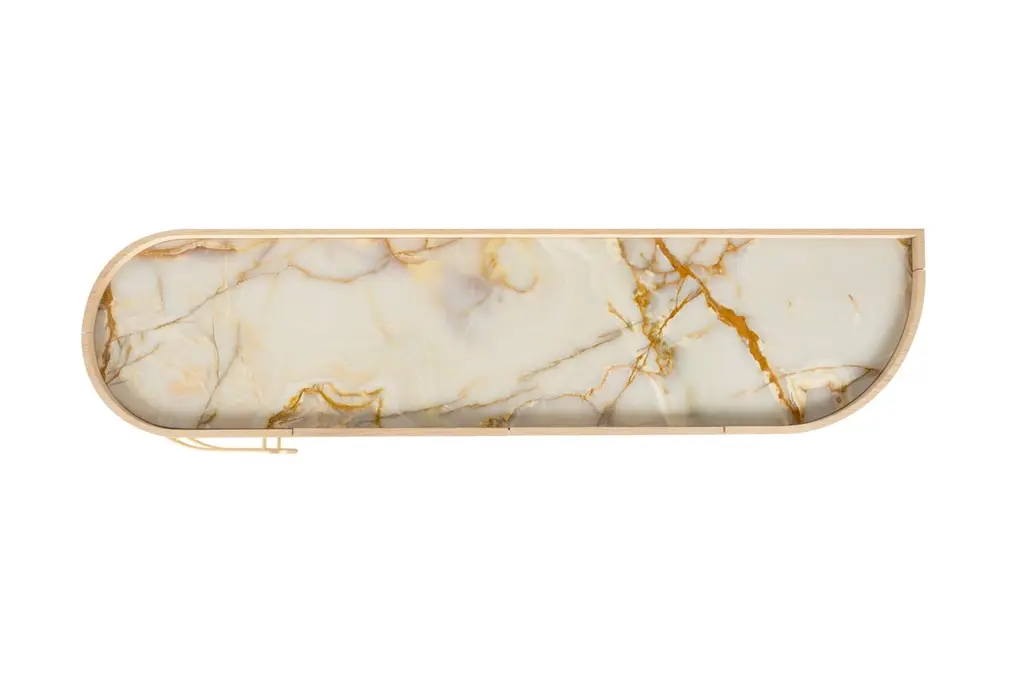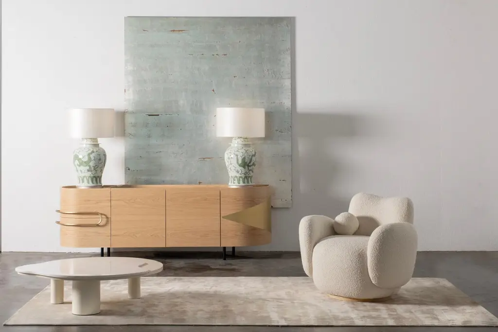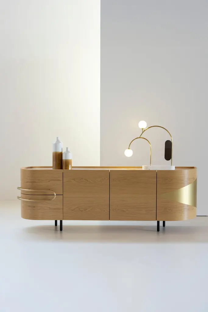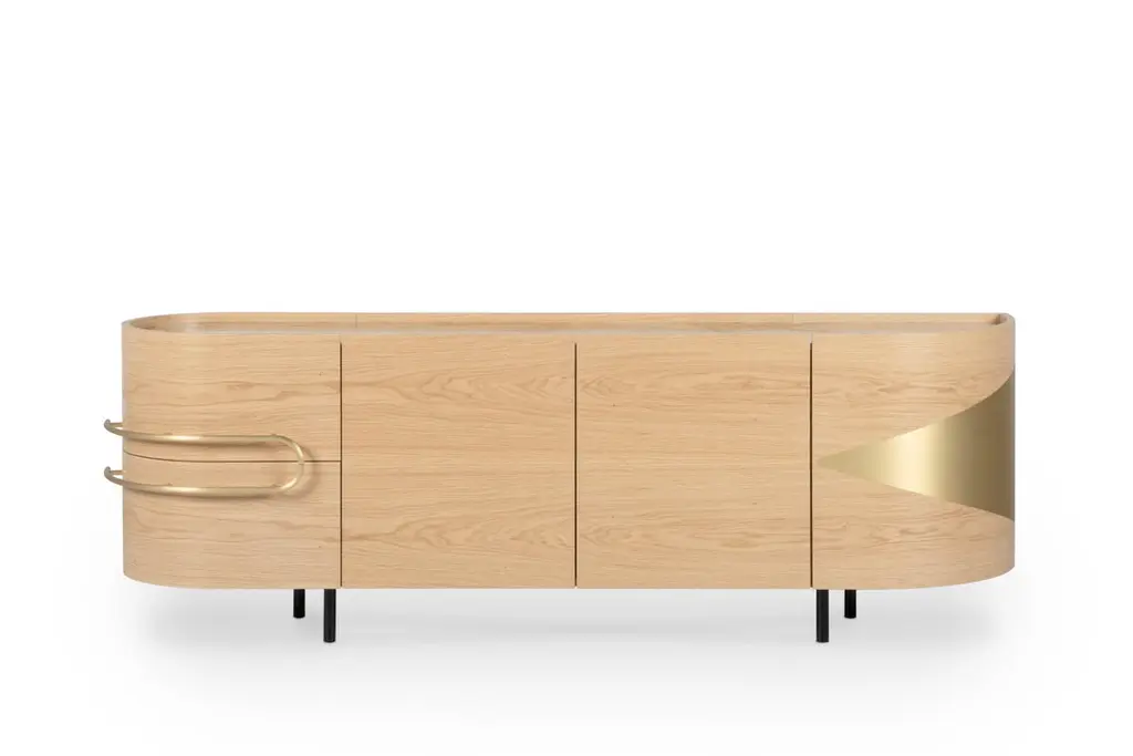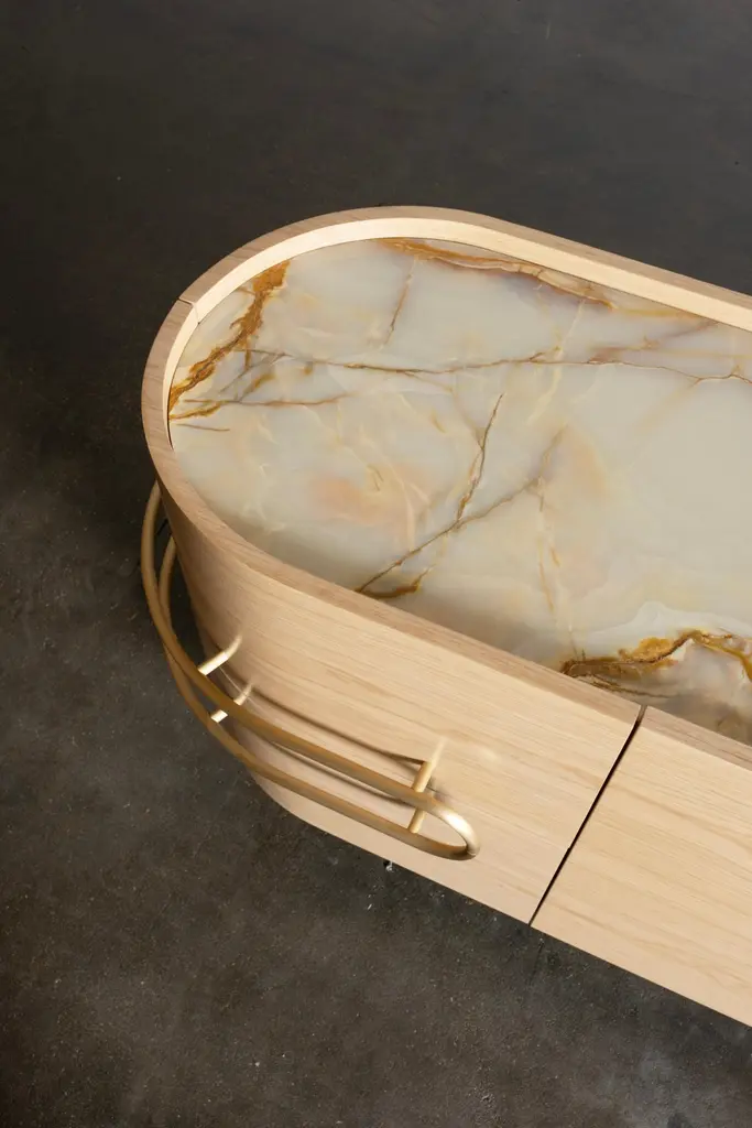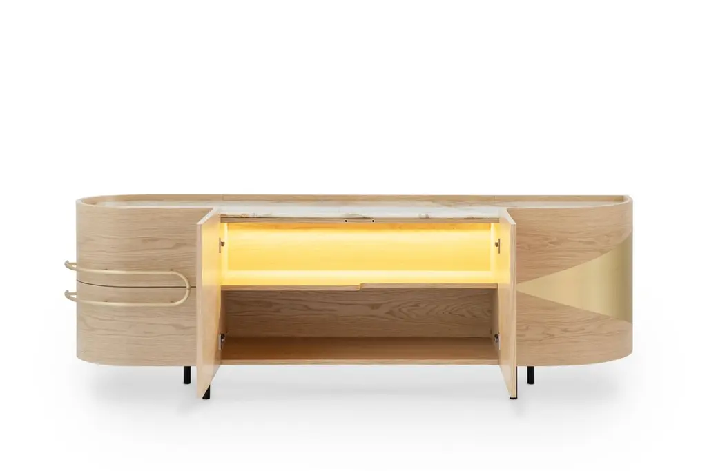Olival Sideboard, Contemporary Collection, Handcrafted in Portugal - Europe by Greenapple.The Olival stone sideboard draws inspiration from the sacred symbolism of the ancient Greek olive tree, embodying its enduring significance. Featuring an exquisite stone top and elegant brass accents, this piece is a statement of refined artistry. Thoughtfully crafted with heirloom quality and timeless design in mind, the Olival stone sideboard is a work of art meant to become a cherished part of any home's history, passed down through generations.The Olival sideboard stands out with its beautiful polished Light Green Onyx top in light green tones.Crafted from wood, its asymmetrical oblong shaped structure is finished in natural white American oak veneer with open-pore and matte varnish.The veneer is anti-fungal and vermin-free, ensuring longevity and preservation.The sideboard features drawers and shelf compartments, offering ample storage space. Interior LED lighting activates upon door opening, subtly illuminating the interior. Handles and inlay details are crafted from brushed brass with a matte varnish, while legs are lacquered in satin black.The Olival Sideboard can be customized in terms of dimensions, materials and finishes.Olival Sideboard Material CodesFI007 Lacquered, Black, SatinWD027 American Oak, Stained Open-pore, Varnished, Natural White Oak, MatteST086 Light Green Onyx, Polished, Light Green, GlossME030 Brass, Brushed, Varnished, Brushed-Brass, MatteEL001 Interior LED lightingHandcrafted in Portugal - Europe by GreenappleUnique by design, Crafted by peopleGreenapple transforms contemporary spaces into exclusive narratives of design and craftsmanship. From custom-made furniture to bespoke interiors, each creation is a timeless work of art, shaped by master artisans who honor centuries-old techniques.Founded in 2005 by Sérgio Rebola and Rute Martins, Greenapple has earned global recognition among high-end clientele and leading design firms. While Rute designs each unique piece, Sérgio ensures uncompromising quality from design to production and from production to your home. We provide a seamless experience, offering short production lead times, worldwide delivery within 7 to 10 days, and white-glove service upon request.For U.S. clients, we can handle all customs clearance, cover duties, and offer white-glove service as well upon request.TV Stand, Media Console, TV Console, Media Cabinet, TV Table, TV Unit
