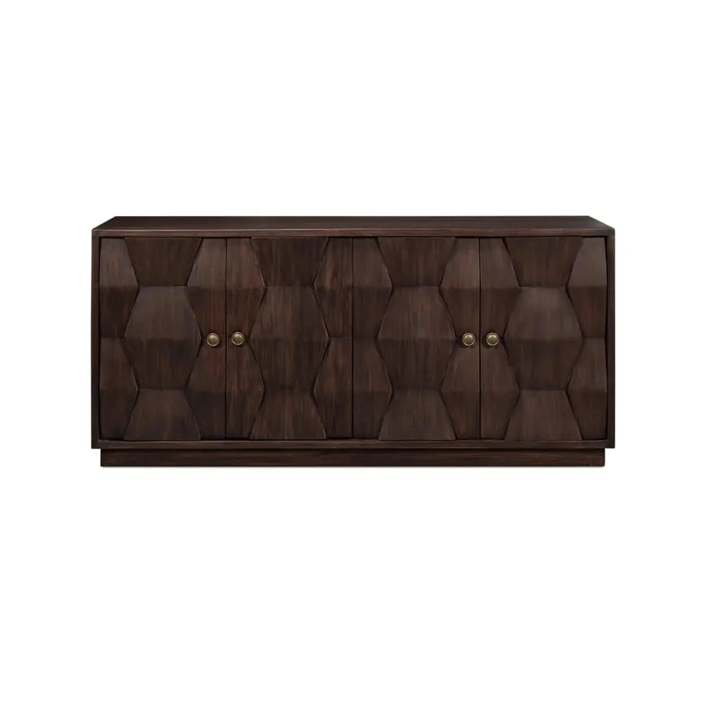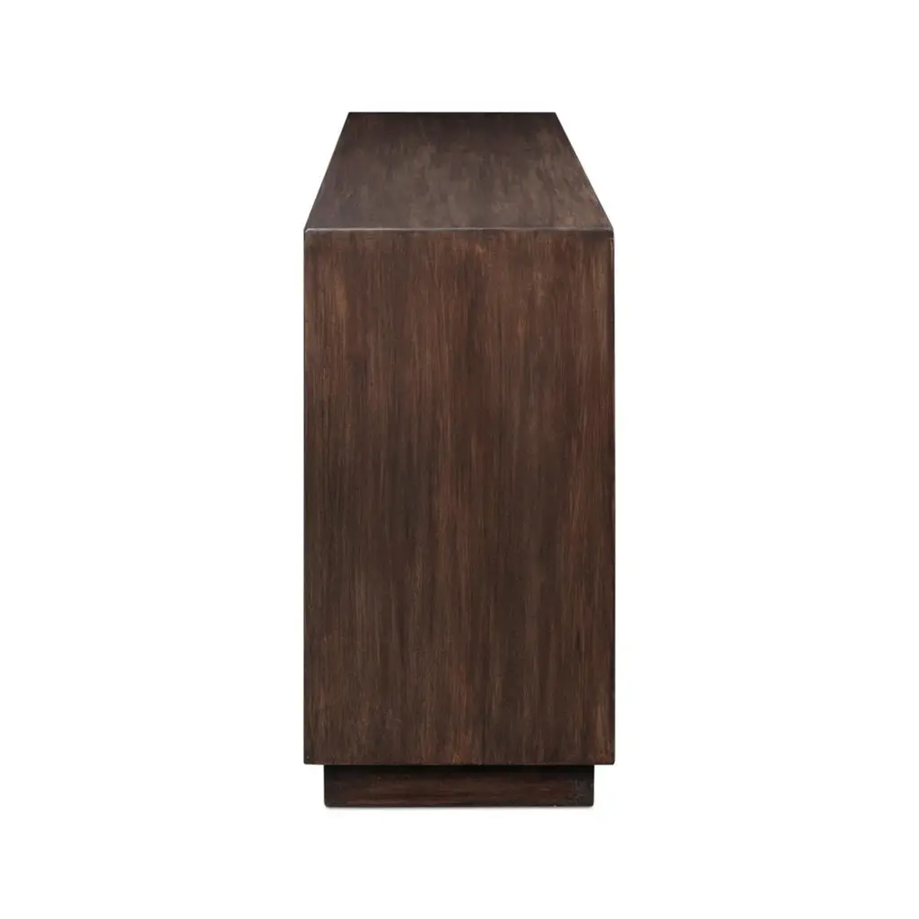 Inspired by classic Brutalism Architecture with an unusual interlaced pattern. The four-door sideboard cabinet has a warm brown finish to the bold mango wood frame. The interior is fitted with removable shelves. Raised on a square plinth base.Dimensions: 74" W x 18" D x 34" H