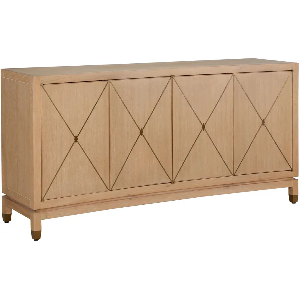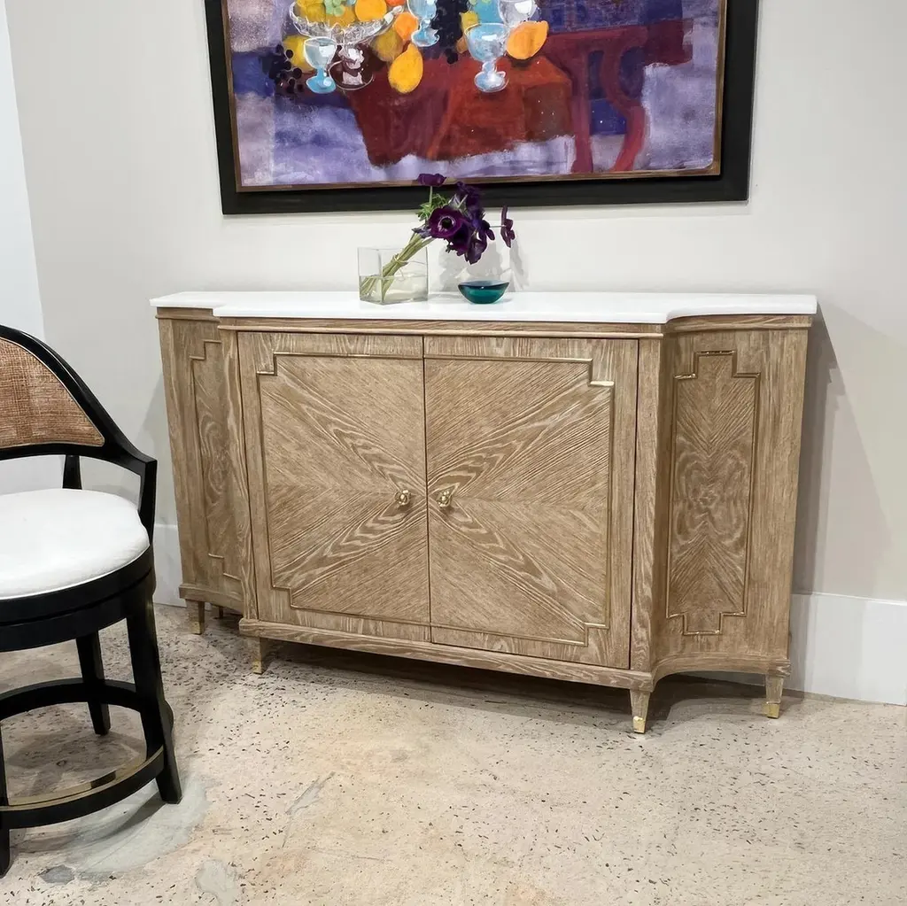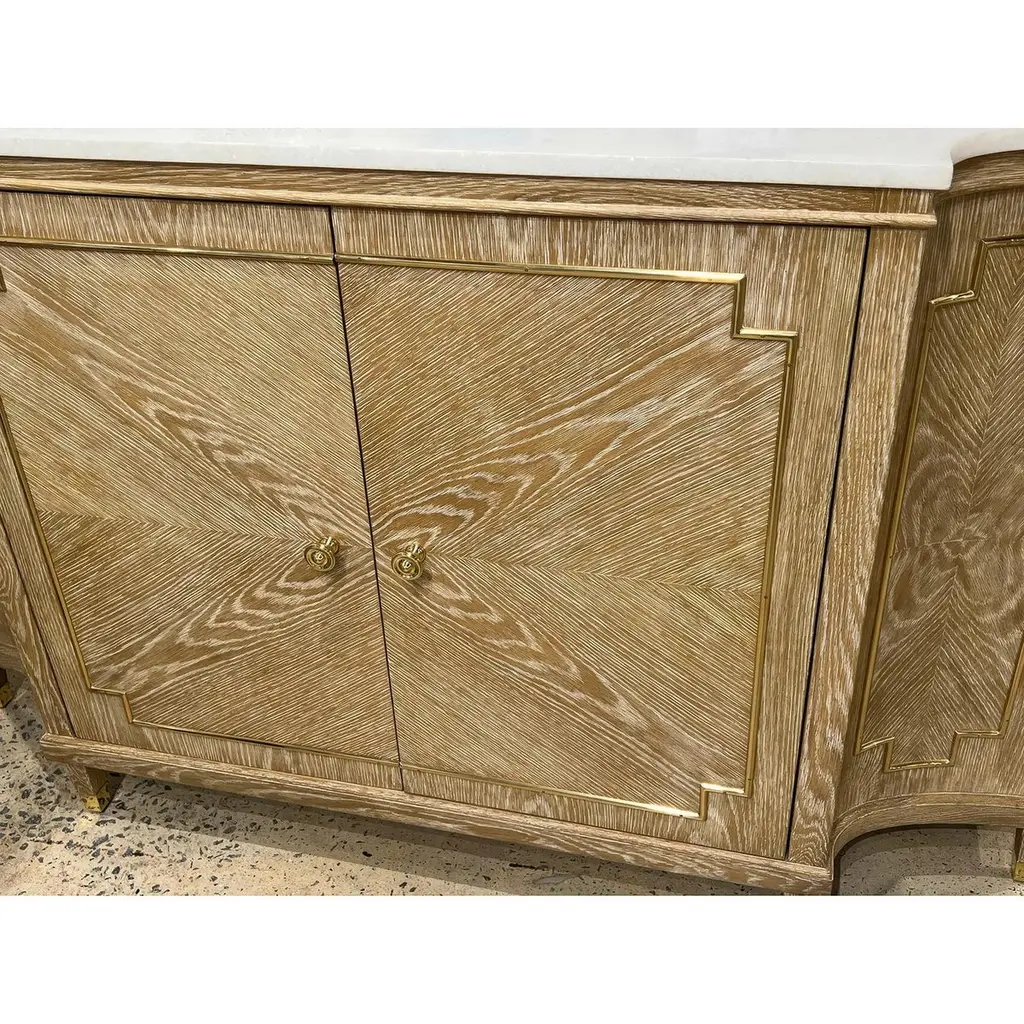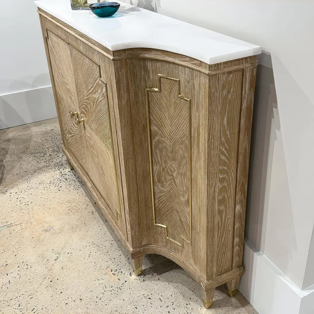 The oak sideboard transforms premium oak veneers into a striking sunburst pattern across its facade. The light cerused finish highlights the wood's natural grain, while geometric panel details and brass accents add architectural sophistication. A luxurious white marble top crowns the piece, creating a perfect balance of durability and style.The sideboard's incurved end panels and tapered legs with brass sabots reflect classic design. Behind the cupboard doors, generous storage space adapts to various needs, while the marble surface provides an elegant platform for serving or display, making it equally suited for formal dining rooms or contemporary living spaces.Dimensions: 64" W x 13" D x 38" H