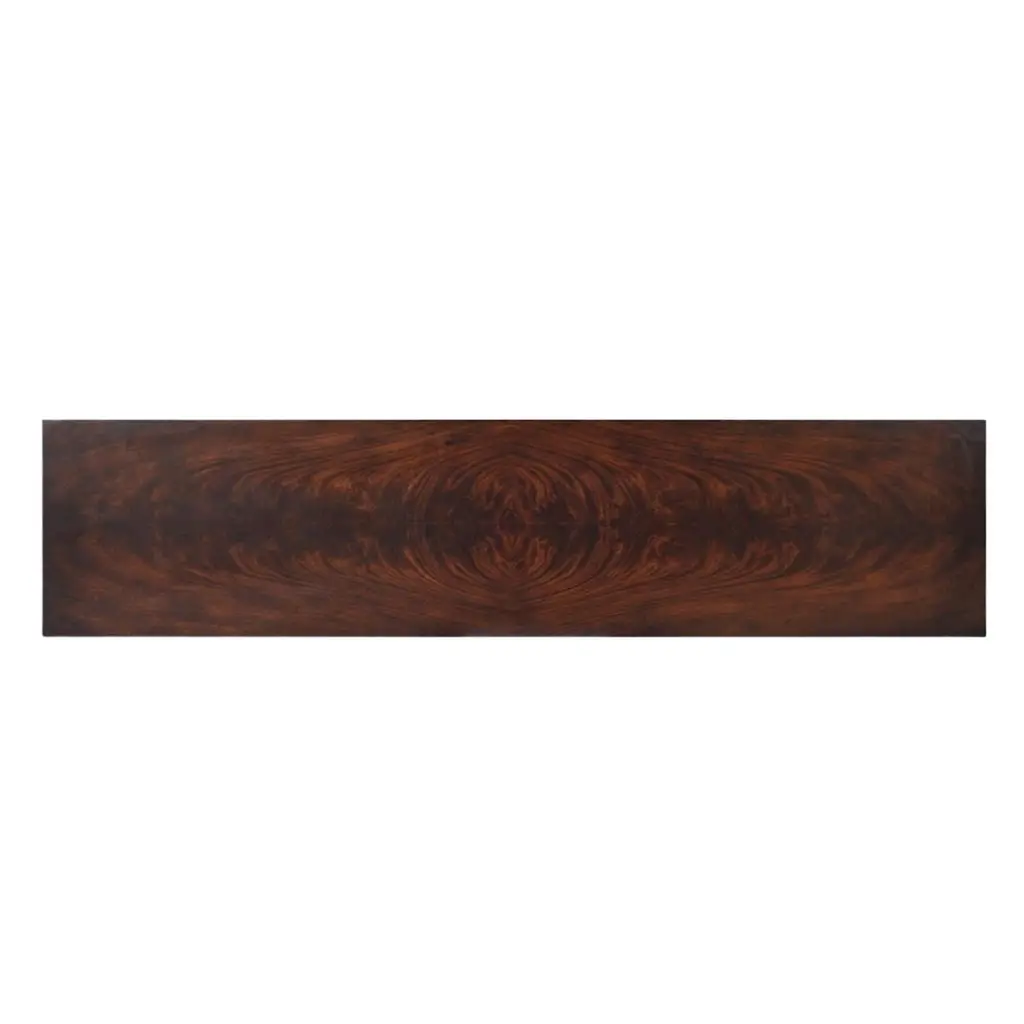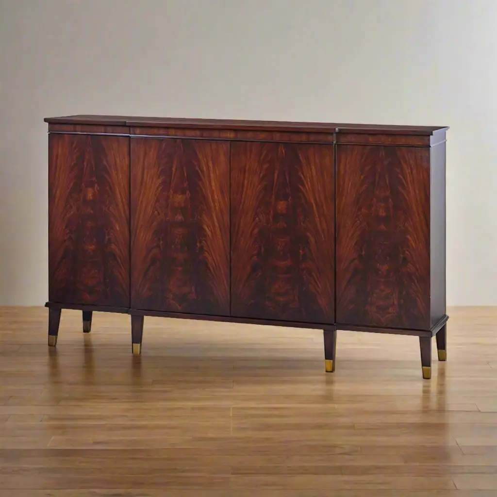 A perfect blend of elegance and functionality. Designed to be a statement piece, this sideboard is sure to elevate your home décor.With a clean edge breakfront, it exudes a sleek and sophisticated mid-century charm. Equipped with four doors that open to reveal generous interior storage and shelving, providing ample space for all your dining essentials and more. 🏡Crafted with a Syrup finish on Mahogany crotch veneer and solids, ensuring durability and a rich, luxurious appearance. Raised on tapered legs with brass ferrules add a touch of refined elegance to this versatile piece.Dimensions: 72" W x 19" D x 43" H