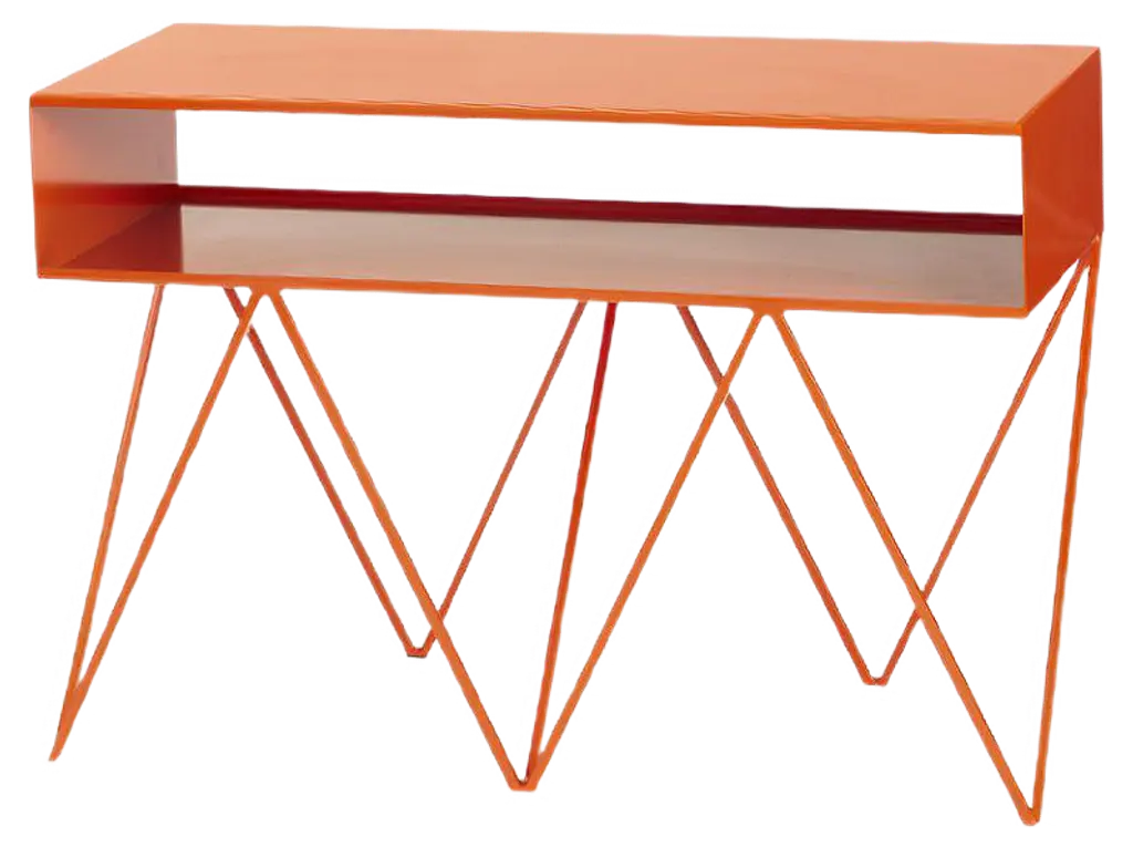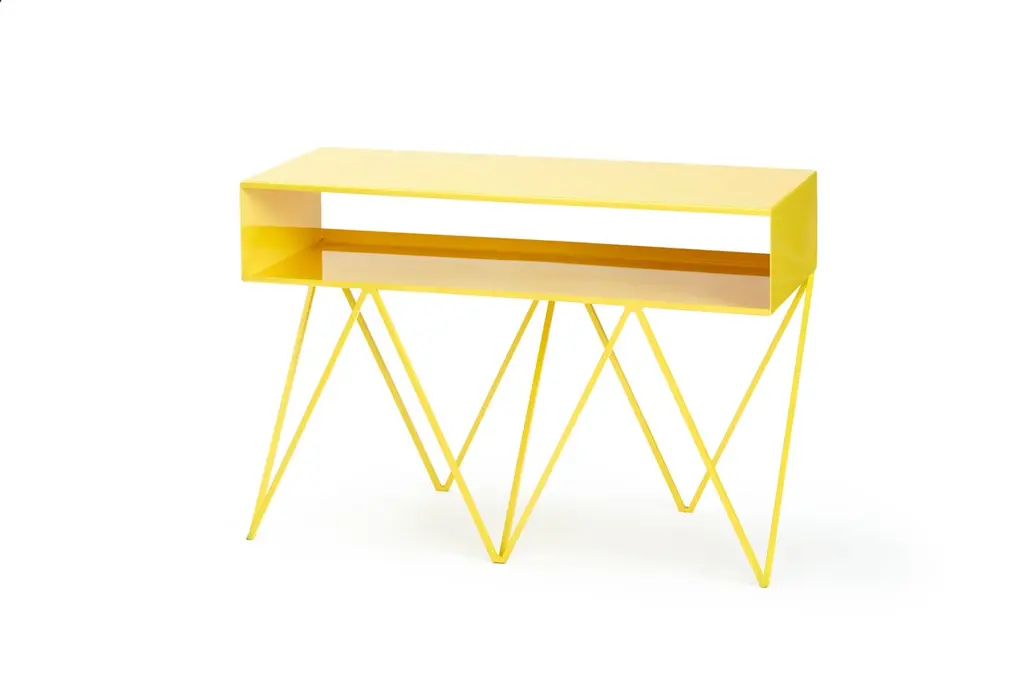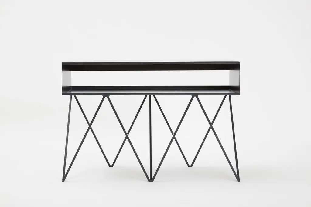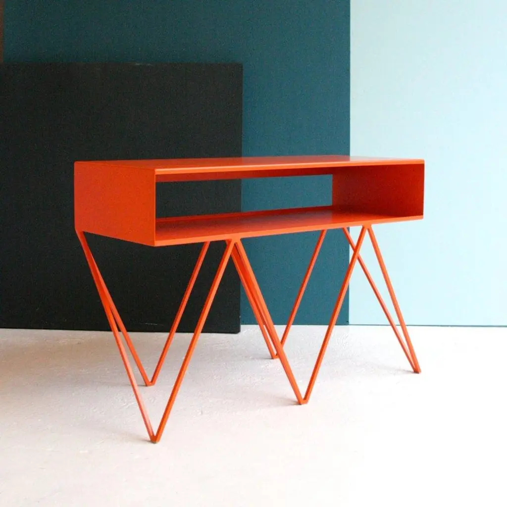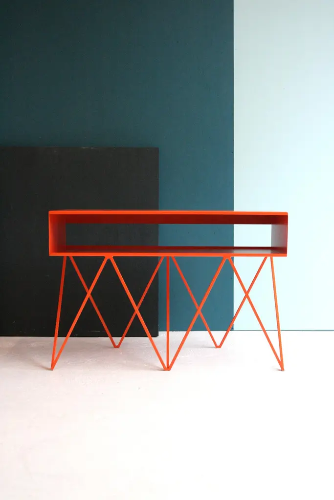 The sculptural low steel sideboard Robot Too is great as a media/AV stand. The slim pigeonhole shelf on top has a half-open back to allow for wiring and leads. Playful and elegant in design, the Robot Too is made to last with fully welded, solid steel construction and a powder-coated finish. Available in fifteen powder coated colors. .All & new products are manufactured in Britain in small batches. They have plenty of character as every weld is different. The result is a collection of furniture that celebrates those little imperfections that make objects beautiful.Measurements: 90cm wide, 37cm deep, 61cm high. 17cm shelf height.Mirka & JoZig-zag-legs/ Registered design. Community design registration number: 002391813-0001.