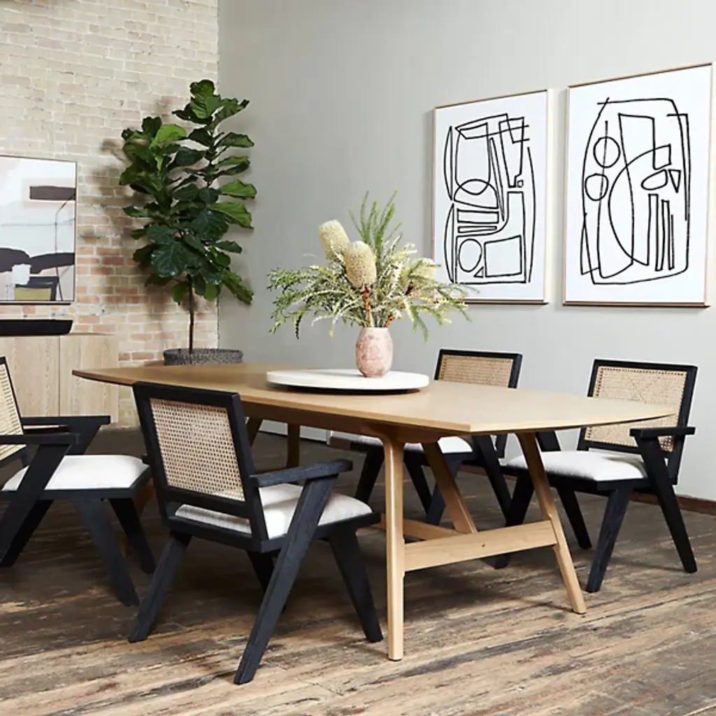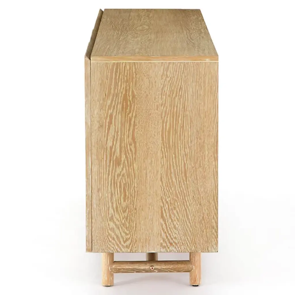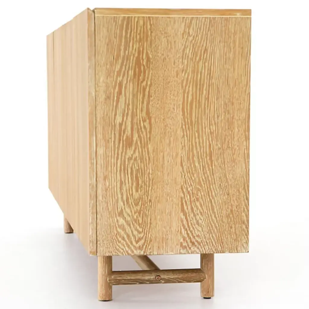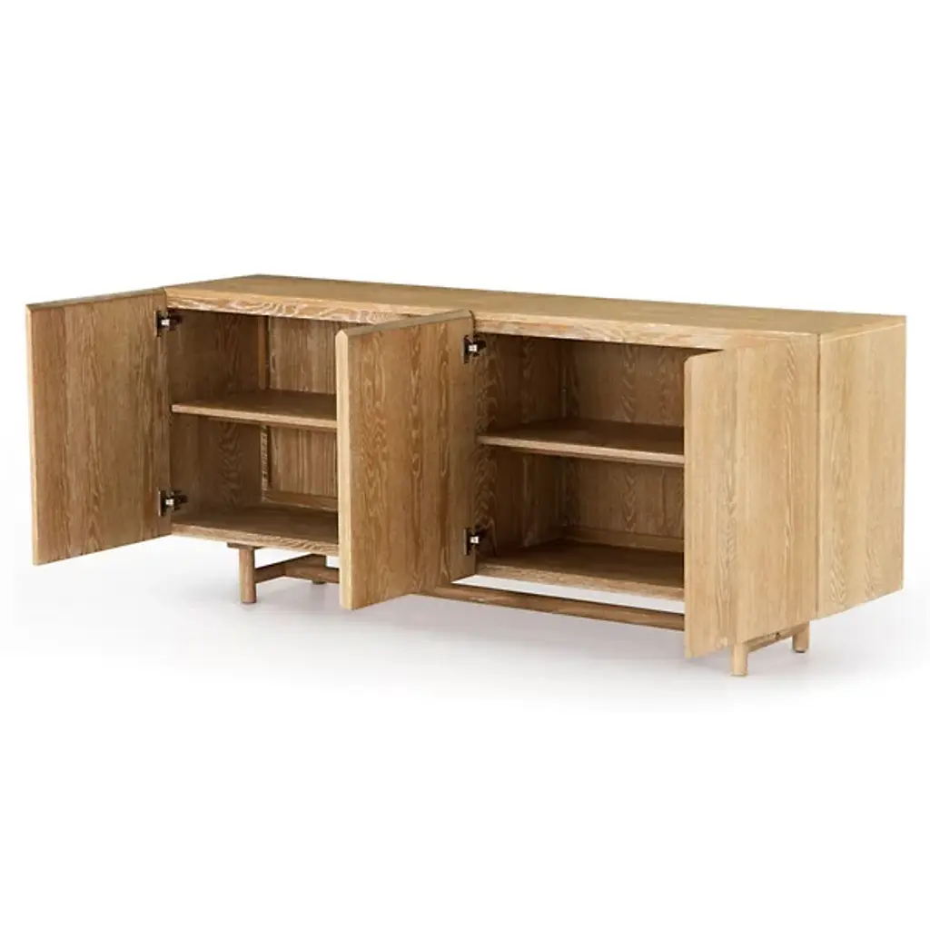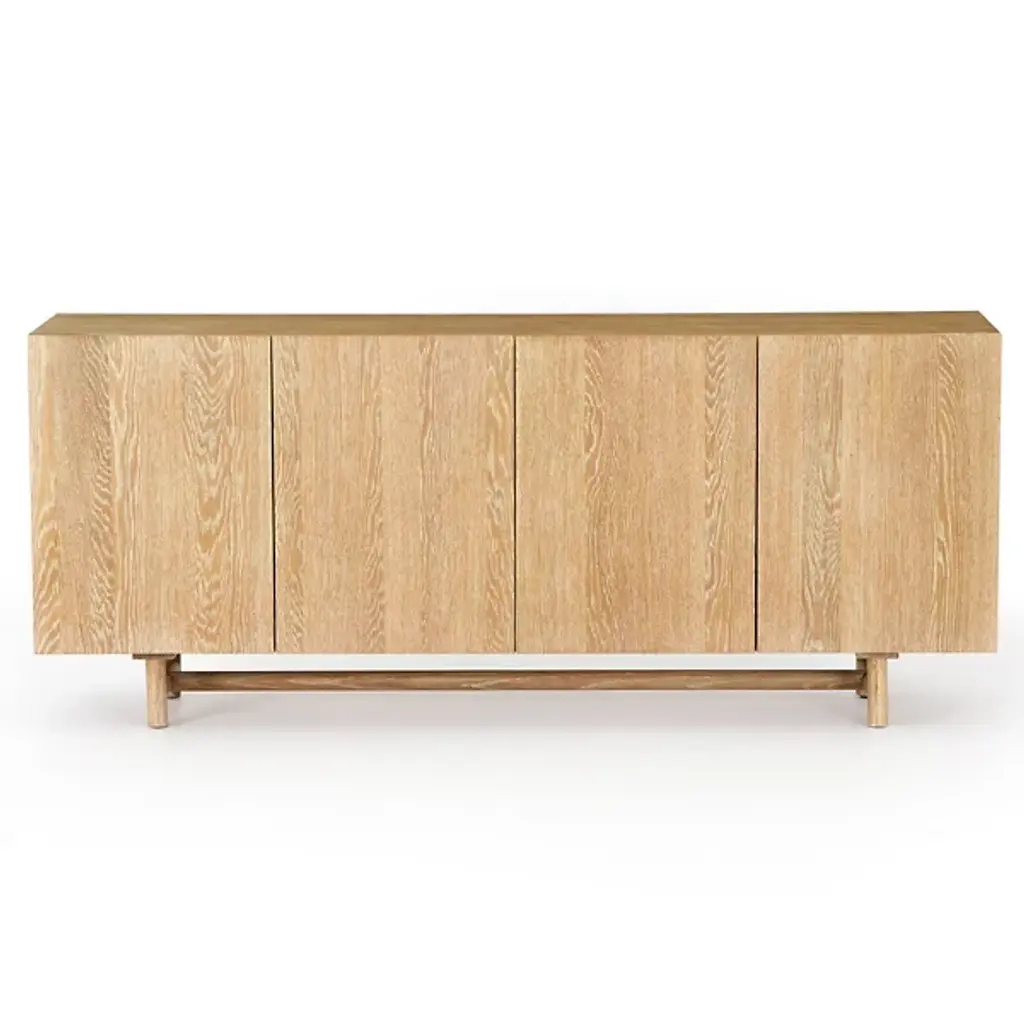 The Mika Dining Sideboard from Four Hands beautifully combines rustic charm with modern design. Crafted from white-washed oak, the piece showcases stunning wood grain and a matte finish that adds a contemporary touch. A low stretcher adds architectural interest, giving the sideboard a refined yet simple style. Perfect for dining or living spaces, it offers both visual appeal and practical functionality, making it an elegant addition to any room with a blend of rustic warmth and modern sophistication.
