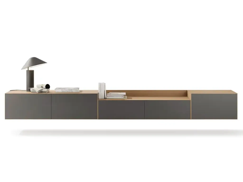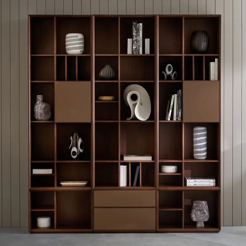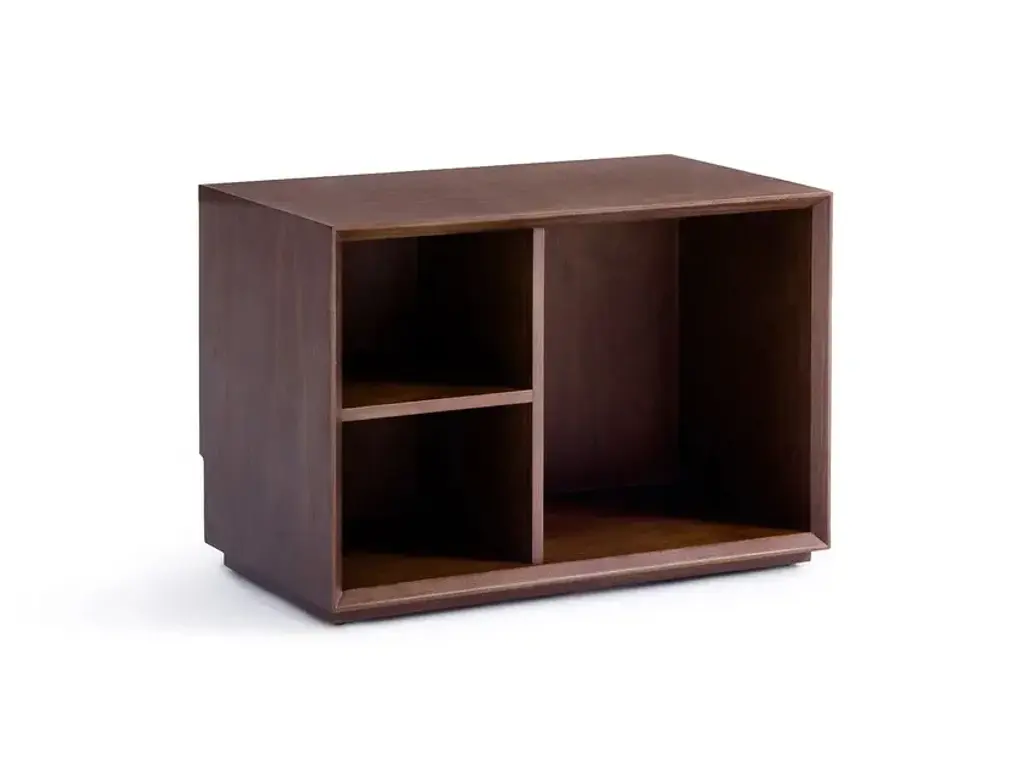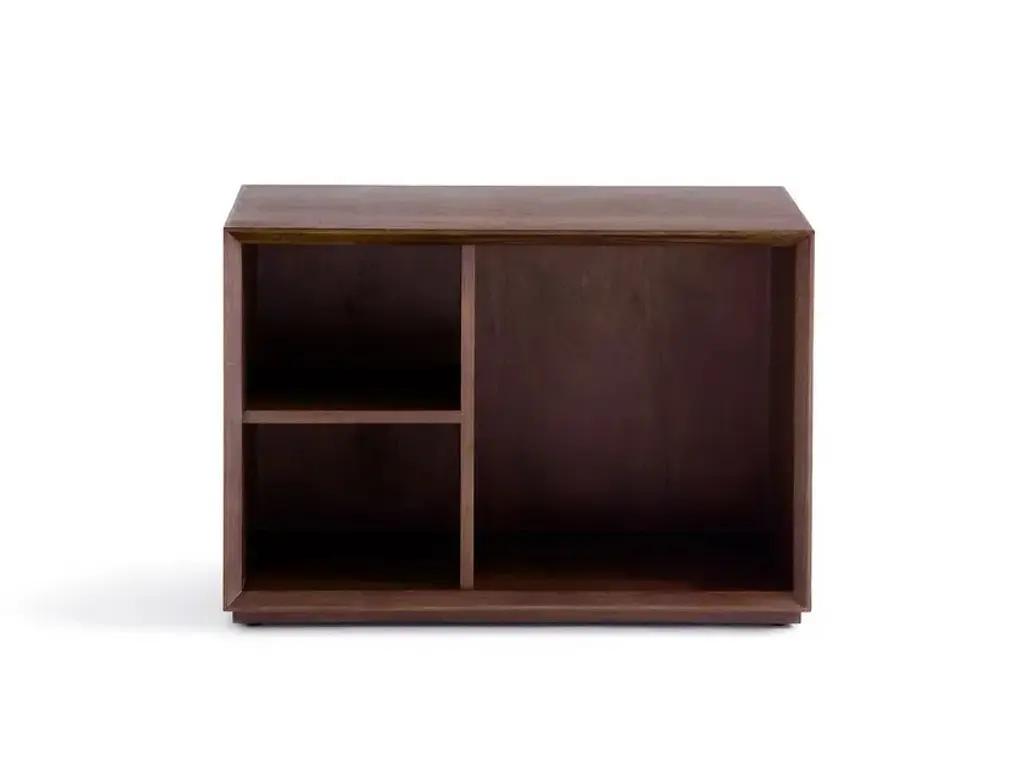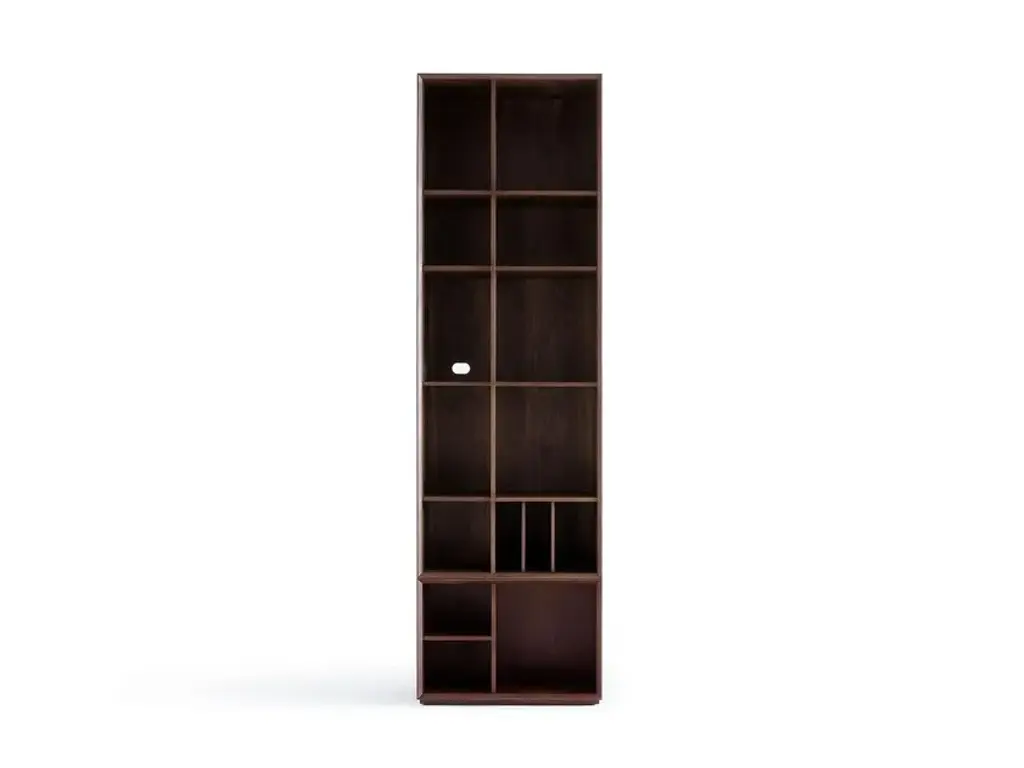 Taken from the Mikube modular storage system, this wall-mounted element is designed to be used on its own or with other modules from the range, to create a XXL bookcase, for example. This shelf made of FSC® walnut veneered MDF has 5 niches. Its edges have a 45° cut. Version with drawers available.Made of MDF with FSC® walnut veneer, nitrocellulose finishFixed shelves
