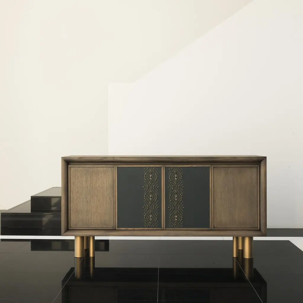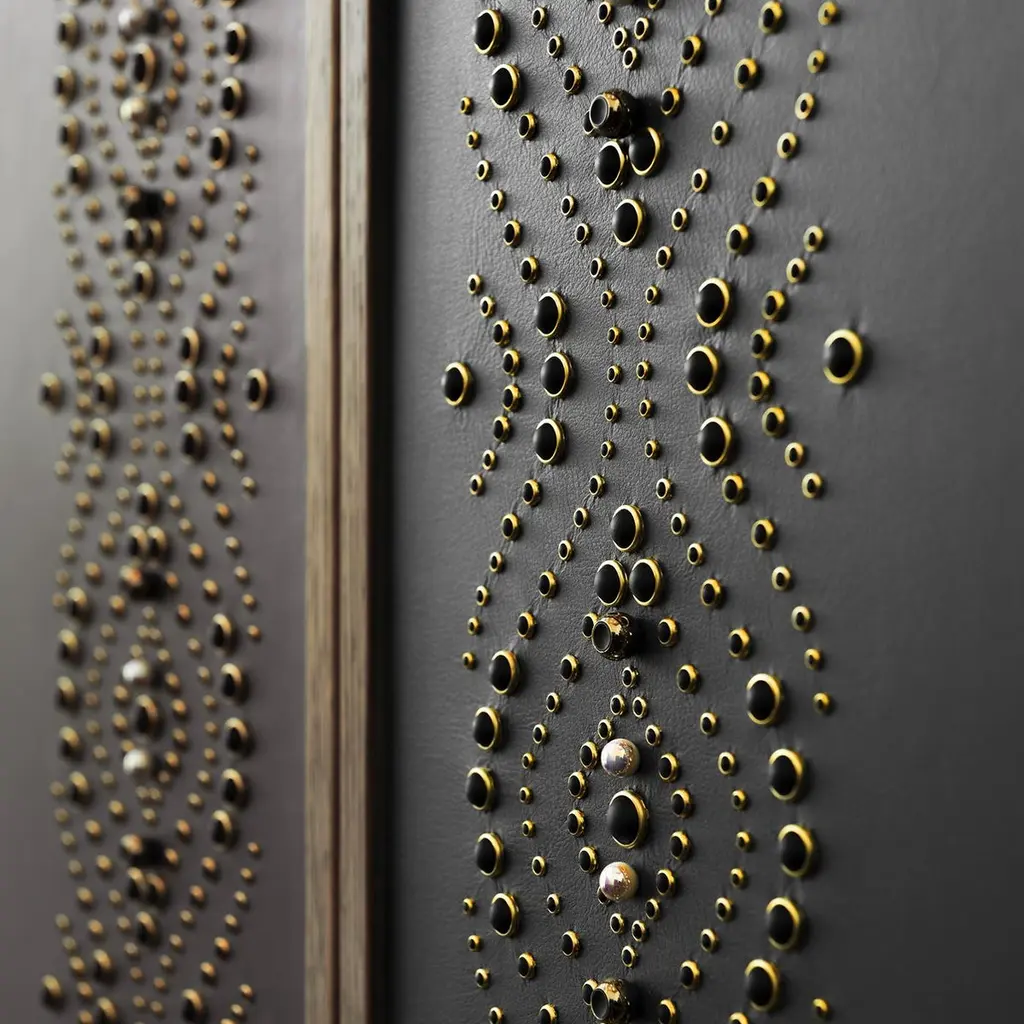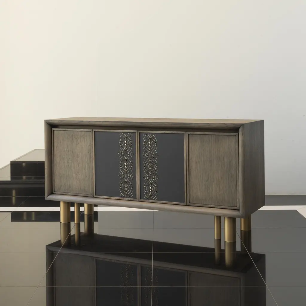 From Chiara Provasi's Couture Collection, the Mila Geometric Tattoo Sideboard is an exploration of the intersection between furniture, fashion and art. The sideboard is handcrafted in oak with a cool gray finish and placed upon six metal feet in a bronze tone. The two central cabinet faces are then covered in supple leather and accented with beads and studs.
