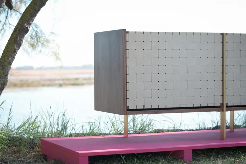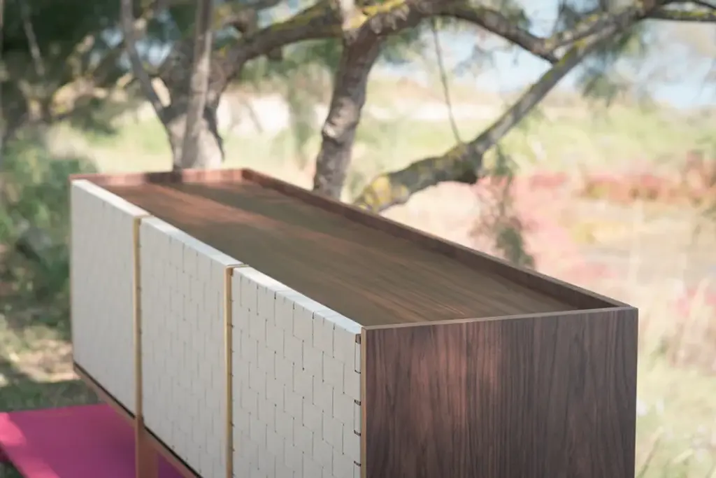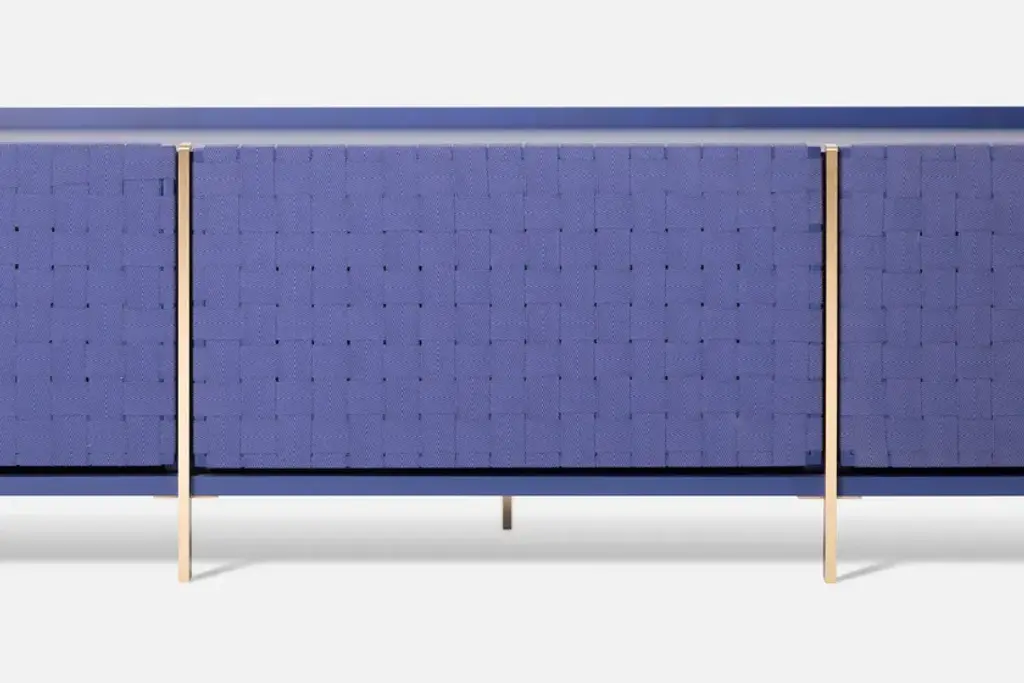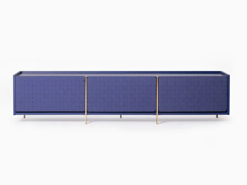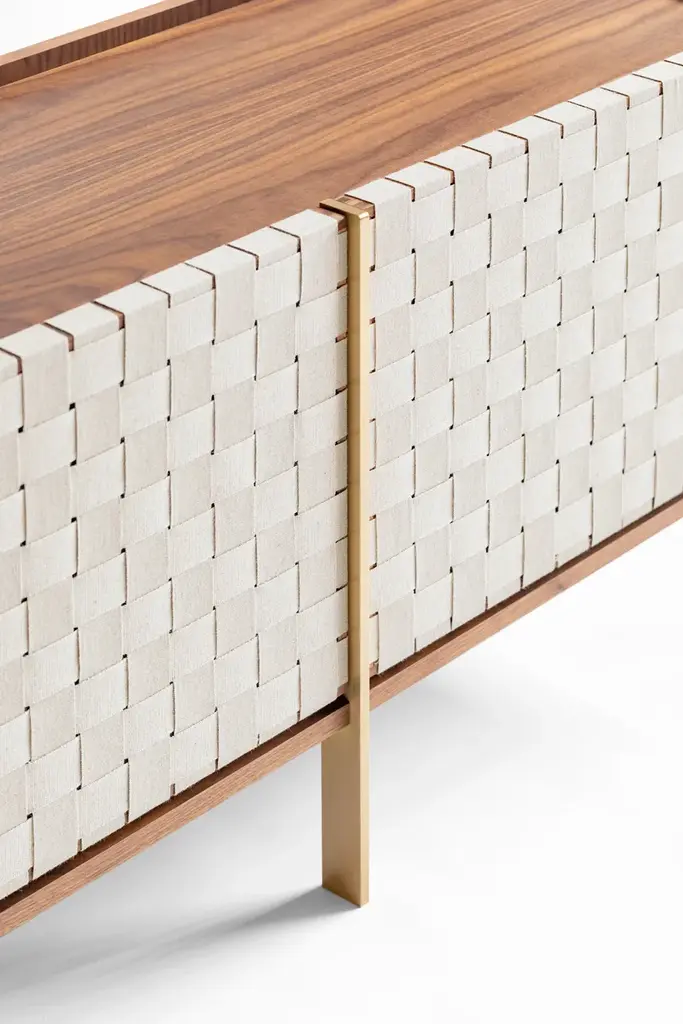 Milla is a sideboard in wood and front in ribbon.“Fashion is not an ornament, it is architecture. It isn’t enough that a dress be beautiful, It has to be built like a building, because like a building it is the materialisation of an idea.” Roberto Capucci – La ricerca della regalità.In MILLA – the cabinet designed for MEDULUM by Milanese designer Filippo Protasoni – a simple ribbon of natural-fibre fabric transforms into a decoration and untangles its weave – at once both clean and geometric, tactile and textural – along the front doors of the piece of furniture, with their smooth black walnut surfaces. A delicate realisation once again proposes theweave understood in its primordial form, with the threads intersecting on the frame individually, by hand, with the spaces which gradually fill up until they become surfaces, the textural contrast in the dialogue between the fabric and the wood is emphasised by the presence of slender support points made of brass: structural elements with a sleek and refined linearity emerge gleaming as they reflect sparks of light. Like pins in a dress.The coming together of two giants of Italian know-how creates an unexpected and surprising dialogue. A piece of furniture which weaves together the profound culture of the fabric of the Italian fashion industry and the strong manufacturing expertise which sets apart the furniture sector.Like the skilfully woven weft of a tailormade piece of attire, in MILLA the fabric strip lies at the centre of the design: it defines its spaces and interprets them, becoming the narrative voice. The idea takes shape and becomes architecture; it is not just cloth, but rather a thought.MATERIALSVeneered wood, solid wood, ribbon, varnished satin brass.FINISHES03 Italian walnut02 canaletto walnut01 oakL lacquered finishesC6 Blue rigid grosgrain ribbonC7 Ecru rigid grosgrain ribbon