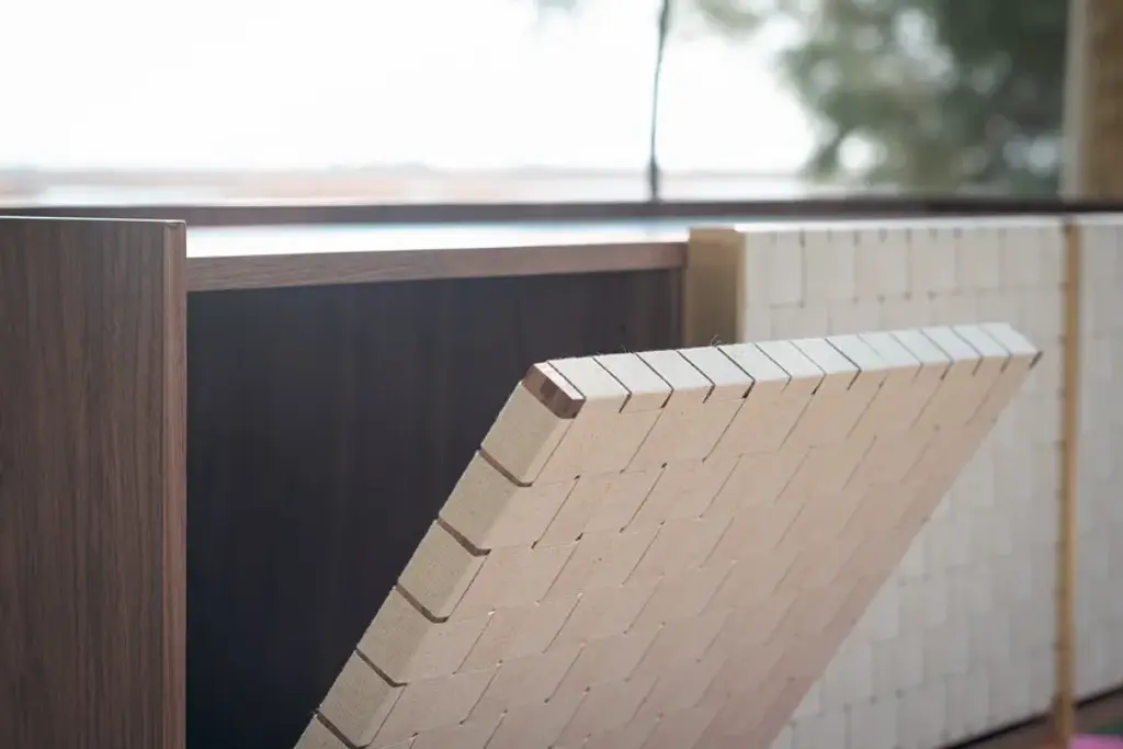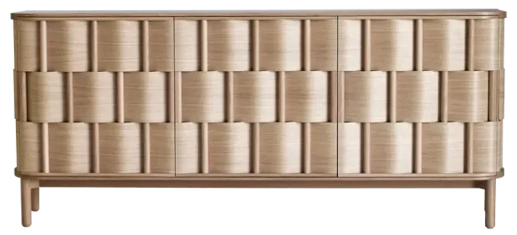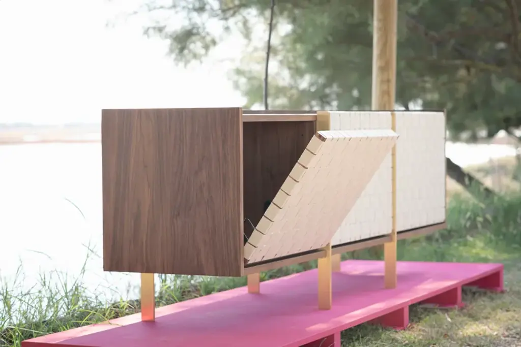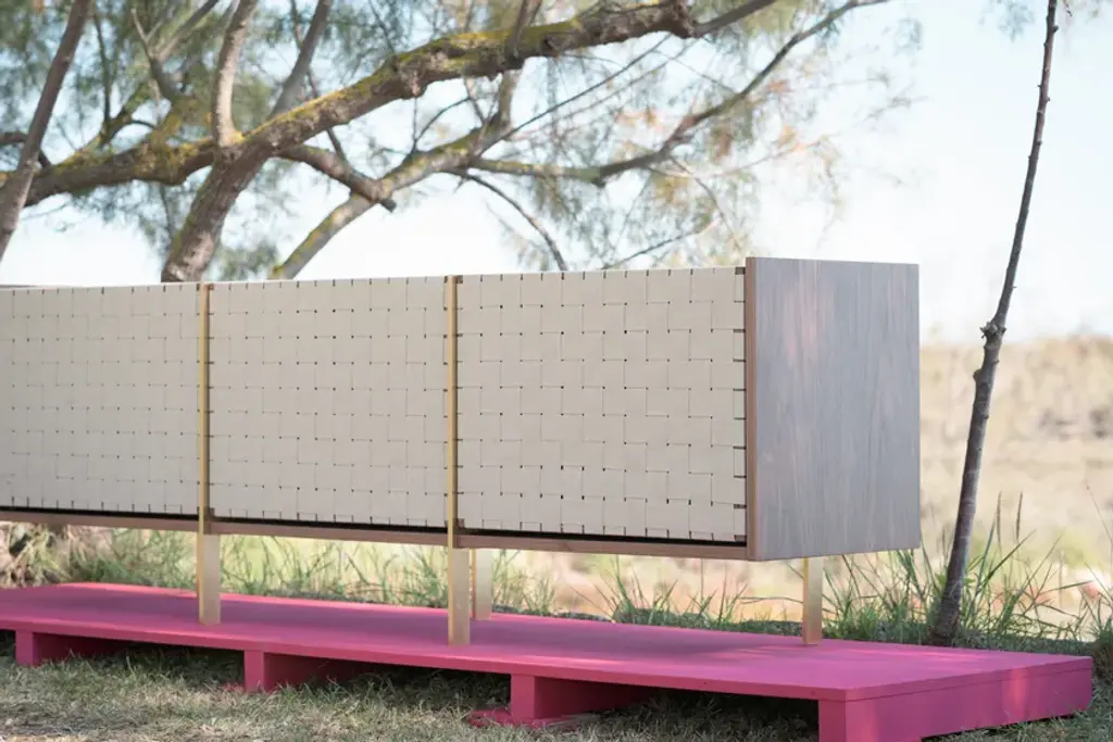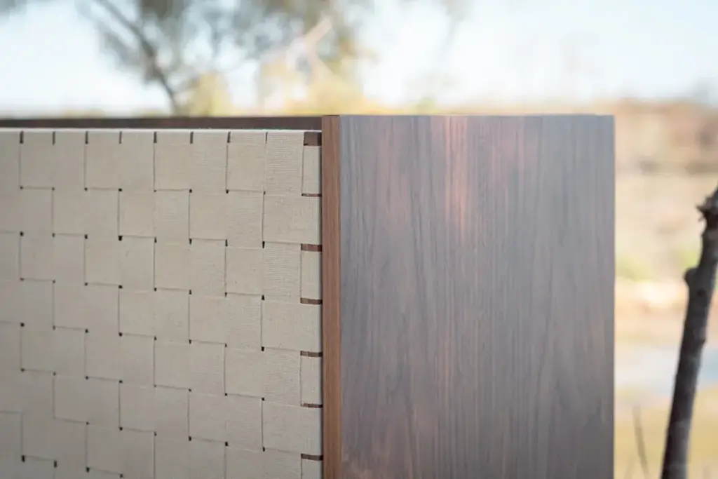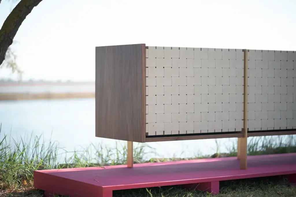 Milla is a sideboard in wood and front in ribbon.“Fashion is not an ornament, it is architecture. It isn’t enough that a dress be beautiful, It has to be built like a building, because like a building it is the materialisation of an idea.” Roberto Capucci – La ricerca della regalità.In MILLA – the cabinet designed for MEDULUM by Milanese designer Filippo Protasoni – a simple ribbon of natural-fibre fabric transforms into a decoration and untangles its weave – at once both clean and geometric, tactile and textural – along the front doors of the piece of furniture, with their smooth black walnut surfaces. A delicate realisation once again proposes theweave understood in its primordial form, with the threads intersecting on the frame individually, by hand, with the spaces which gradually fill up until they become surfaces, the textural contrast in the dialogue between the fabric and the wood is emphasised by the presence of slender support points made of brass: structural elements with a sleek and refined linearity emerge gleaming as they reflect sparks of light. Like pins in a dress.The coming together of two giants of Italian know-how creates an unexpected and surprising dialogue. A piece of furniture which weaves together the profound culture of the fabric of the Italian fashion industry and the strong manufacturing expertise which sets apart the furniture sector.Like the skilfully woven weft of a tailormade piece of attire, in MILLA the fabric strip lies at the centre of the design: it defines its spaces and interprets them, becoming the narrative voice. The idea takes shape and becomes architecture; it is not just cloth, but rather a thought.MATERIALSVeneered wood, solid wood, ribbon, varnished satin brass.FINISHES03 Italian walnut02 canaletto walnut01 oakL lacquered finishesC6 Blue rigid grosgrain ribbonC7 Ecru rigid grosgrain ribbon