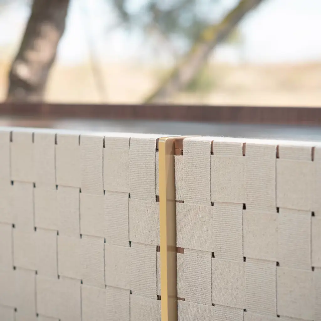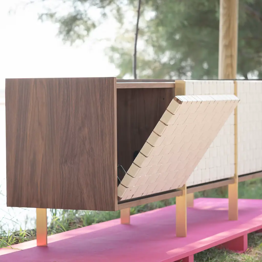 A timeless and elegant design characterized by a simple and refined aesthetic, the Milla Sideboard is masterfully handcrafted according to traditional techniques. Distinguished by a rigid ecru grosgrain ribbon used to create a braided front decor, it is fashioned of Canaletto walnut wood, enriched with metal details.