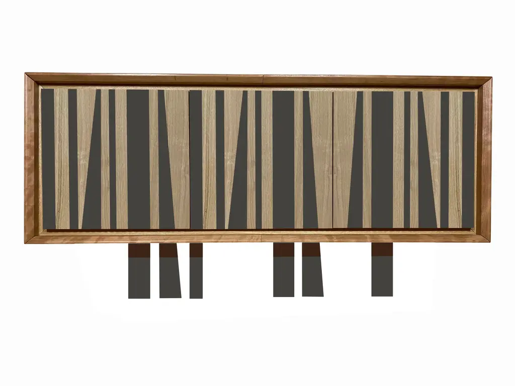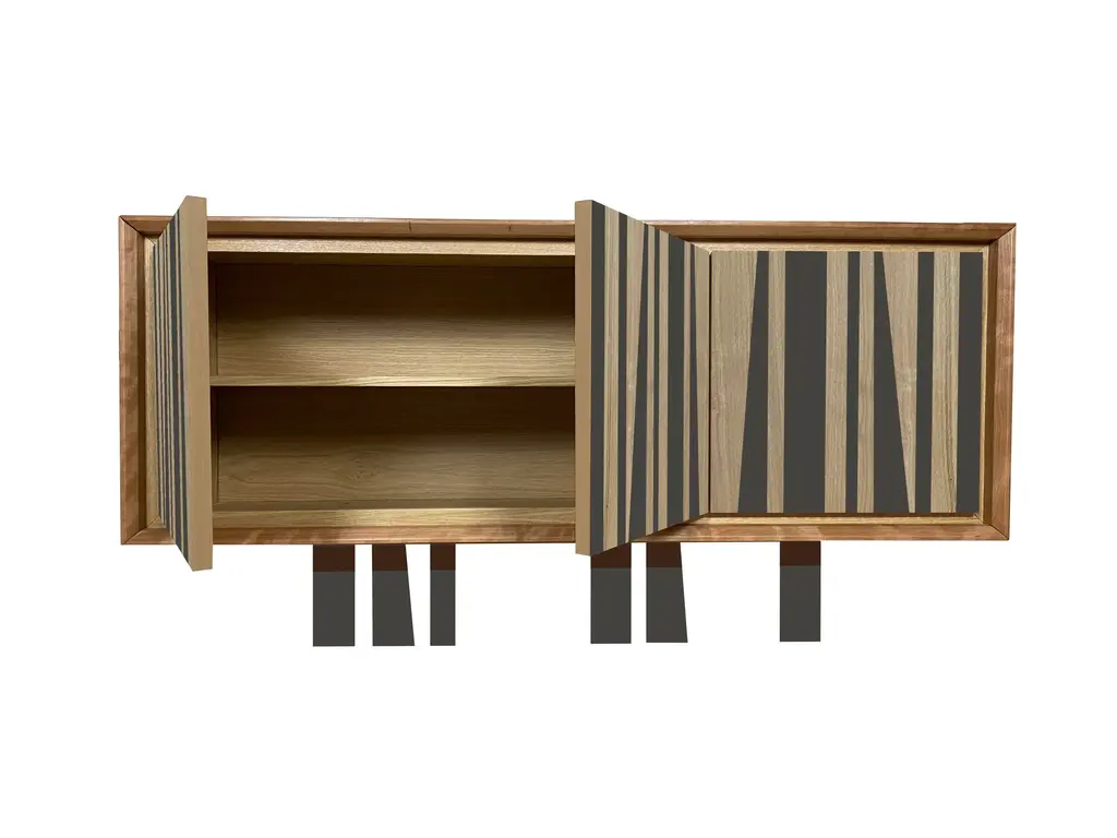 "Millepiedi" belief by Mascia Meccani for Meccani Design, 2023. Room in oak and cherry cherry with ebanized parts, three doors and two internal shelves. Autograph signature of the author, date and label of the company. Dimensions 160 x 50 x h 80 cm. Labeled by Maker