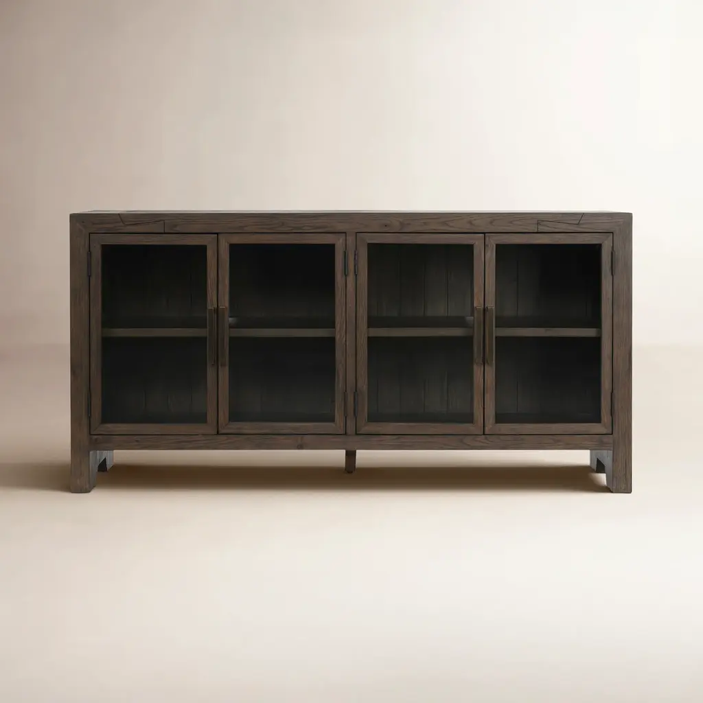 Put your everyday valuables on full display with the Millie Sideboard from Four Hands offers an inspired mix of rustic, modern, and contemporary styles. A solid oak frame supports its roomy interior and offers a mix of fixed and adjustable shelves, allowing for customizable display options behind the clear glass door panels. A hidden storage drawer provides practical storage for flatware or cords, while cord management cutouts ensure a tidy appearance to the sides. With tempered glass doors and two removable, adjustable shelves, this sideboard combines pure functionality with an elegant, retro-style design.