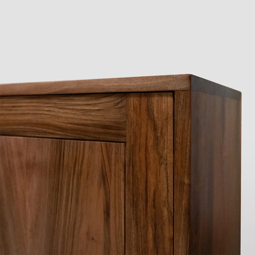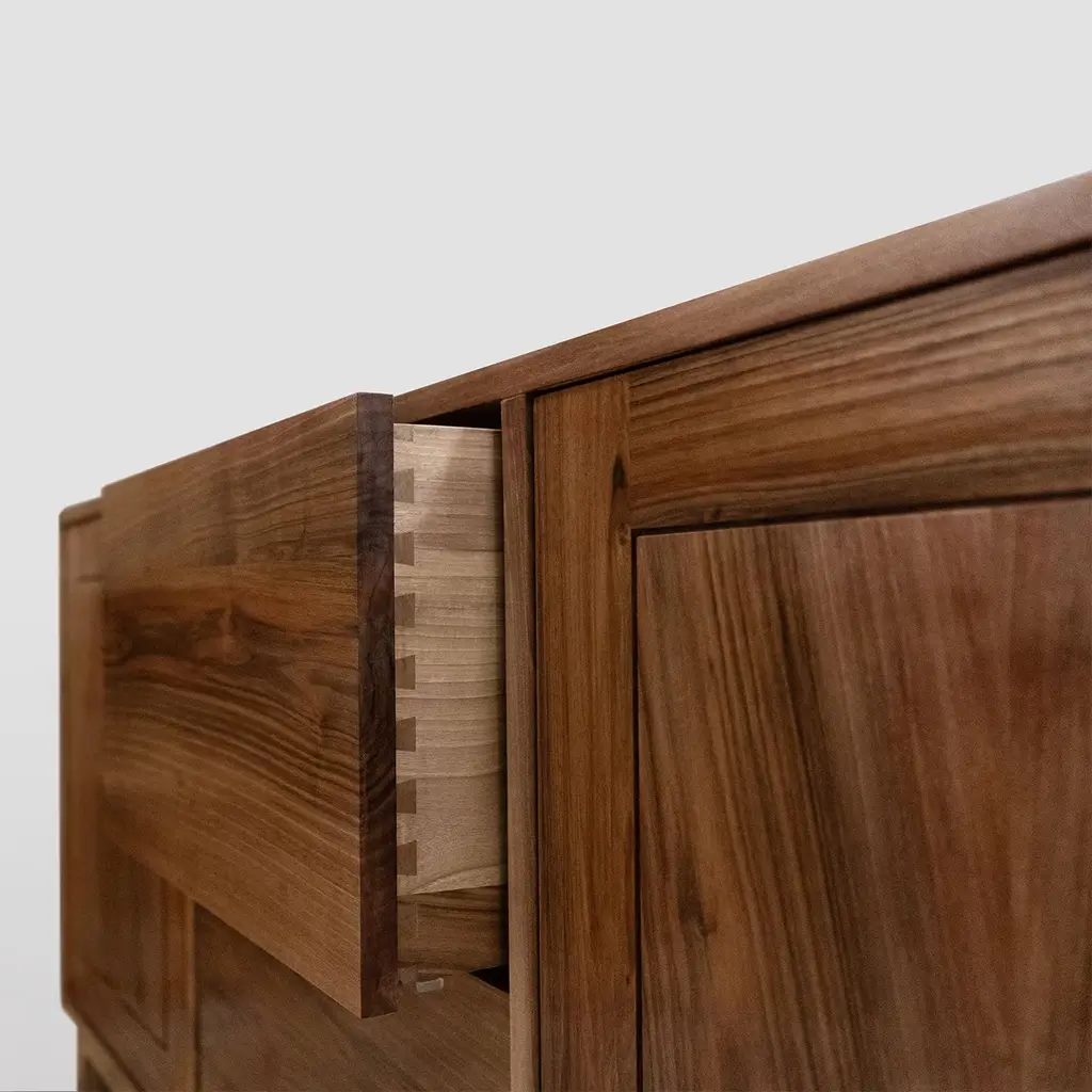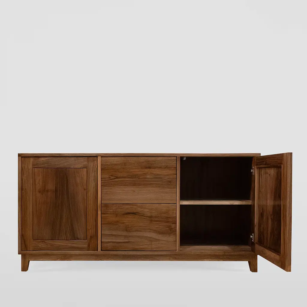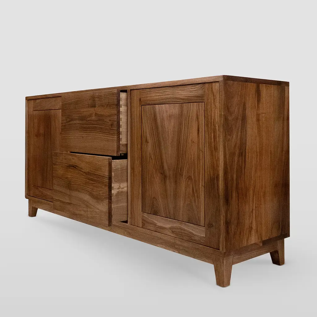 The Minimalist Walnut Sideboard epitomizes the harmonious blend of timeless elegance and contemporary functionality. Crafted from premium walnut, this exquisite furniture piece showcases clean lines and balanced proportions, making it perfect for modern and sophisticated interiors. Designed with practicality in mind, the sideboard features a central section comprising two spacious drawers with smooth, flush fronts. Flanking the central drawers are two additional compartments, each equipped with a solid walnut shelf. The cabinet doors exhibit a refined frame structure, with a central walnut panel that remains flush with the frame, creating a seamless, sleek appearance. The sideboard's doors open smoothly thanks to metal hinges equipped with a "push and pull" system, featuring soft-close Blumotion technology for enhanced usability. The piece rests on slightly angled wooden legs, which support a sturdy frame structure, contributing to its overall stability. Hand-polished with care, the finish highlights the natural beauty of the walnut, revealing intricate grain patterns unique to each piece. This sideboard not only offers ample storage but also serves as a striking statement in any room.