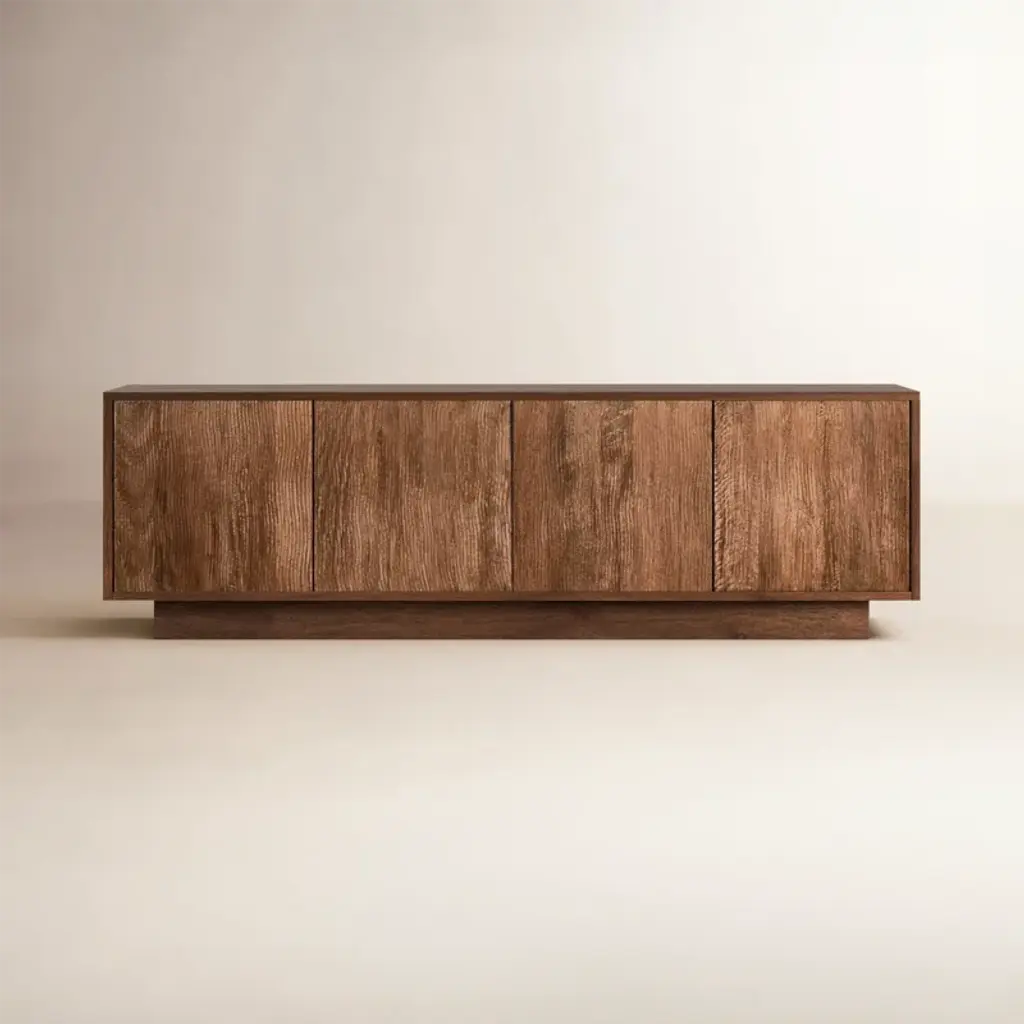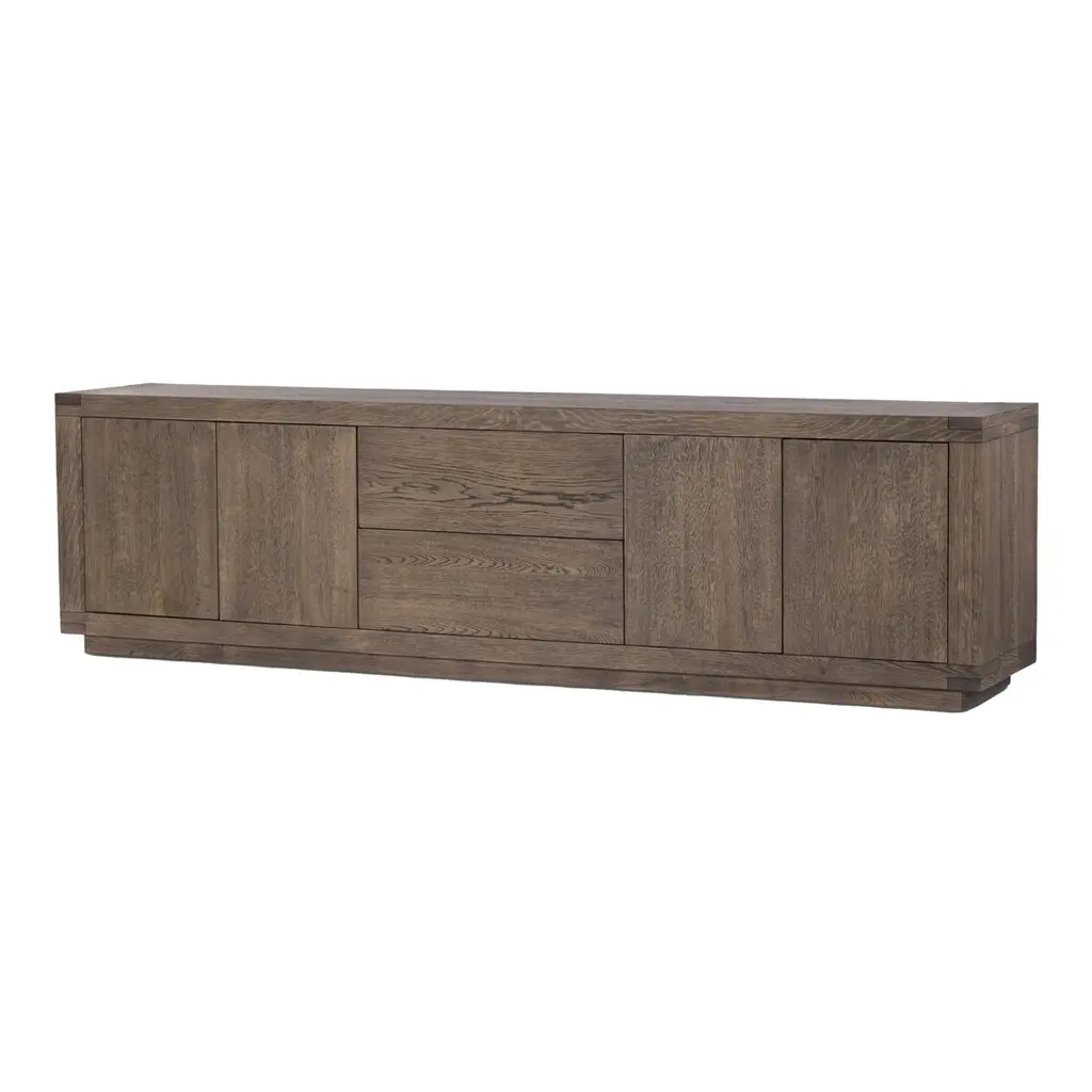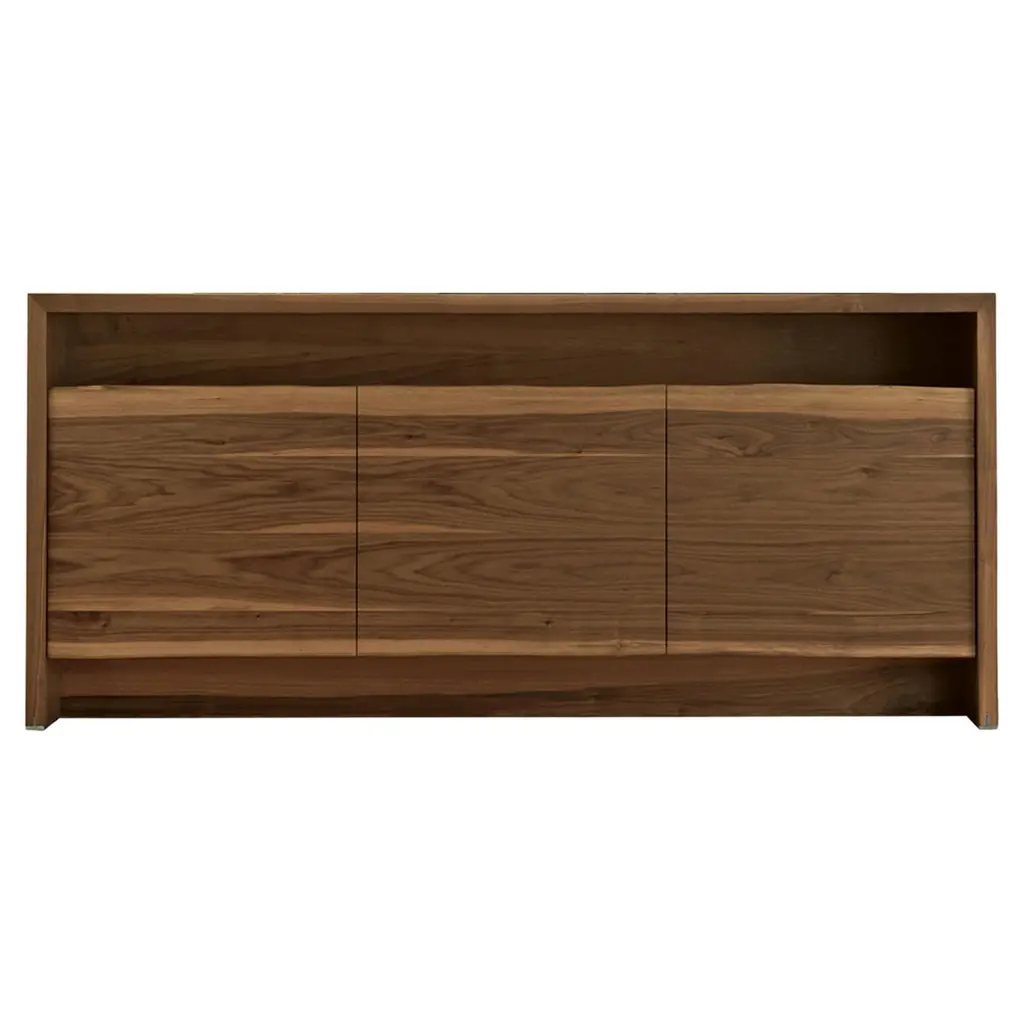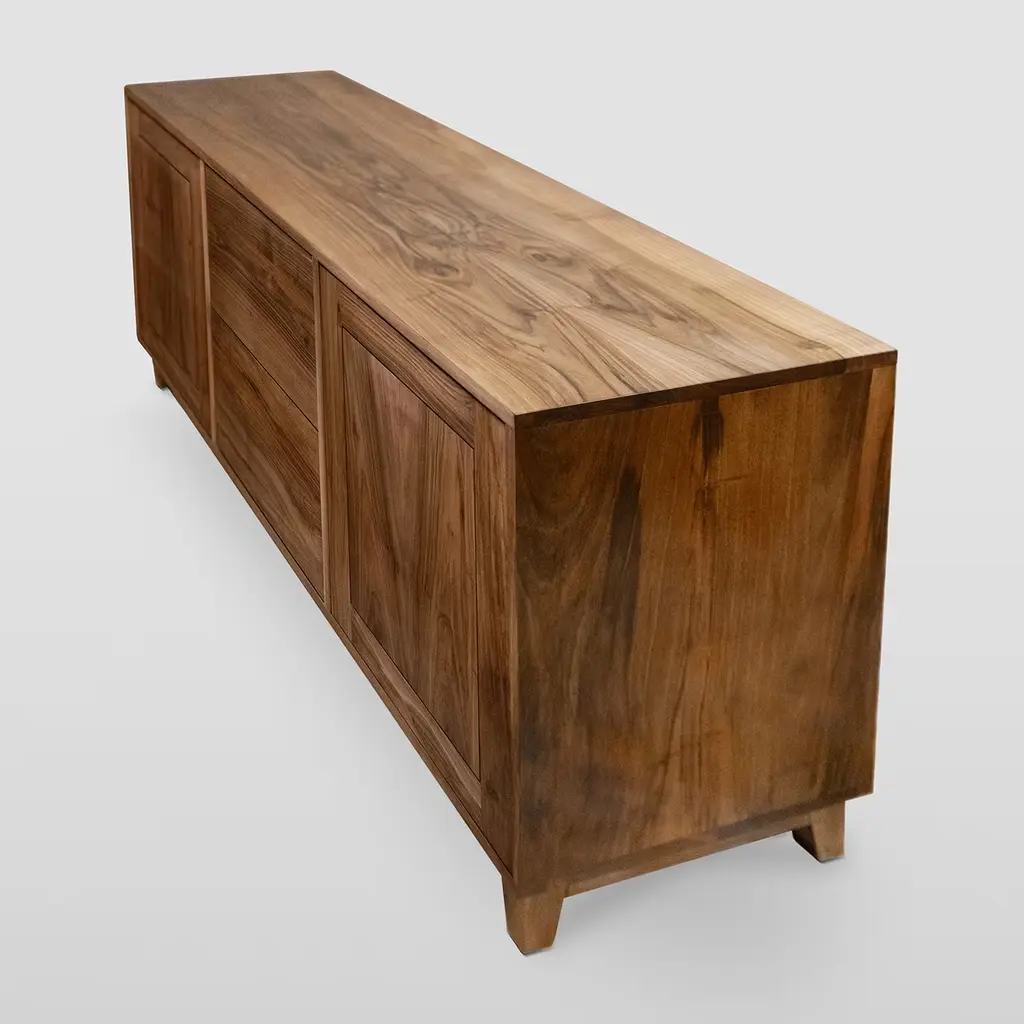 The Minimalist Walnut Sideboard epitomizes the harmonious blend of timeless elegance and contemporary functionality. Crafted from premium walnut, this exquisite furniture piece showcases clean lines and balanced proportions, making it perfect for modern and sophisticated interiors. Designed with practicality in mind, the sideboard features a central section comprising two spacious drawers with smooth, flush fronts. Flanking the central drawers are two additional compartments, each equipped with a solid walnut shelf. The cabinet doors exhibit a refined frame structure, with a central walnut panel that remains flush with the frame, creating a seamless, sleek appearance. The sideboard's doors open smoothly thanks to metal hinges equipped with a "push and pull" system, featuring soft-close Blumotion technology for enhanced usability. The piece rests on slightly angled wooden legs, which support a sturdy frame structure, contributing to its overall stability. Hand-polished with care, the finish highlights the natural beauty of the walnut, revealing intricate grain patterns unique to each piece. This sideboard not only offers ample storage but also serves as a striking statement in any room.