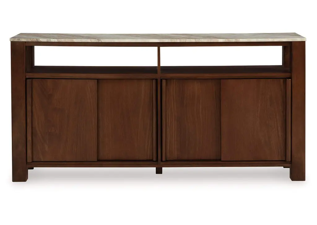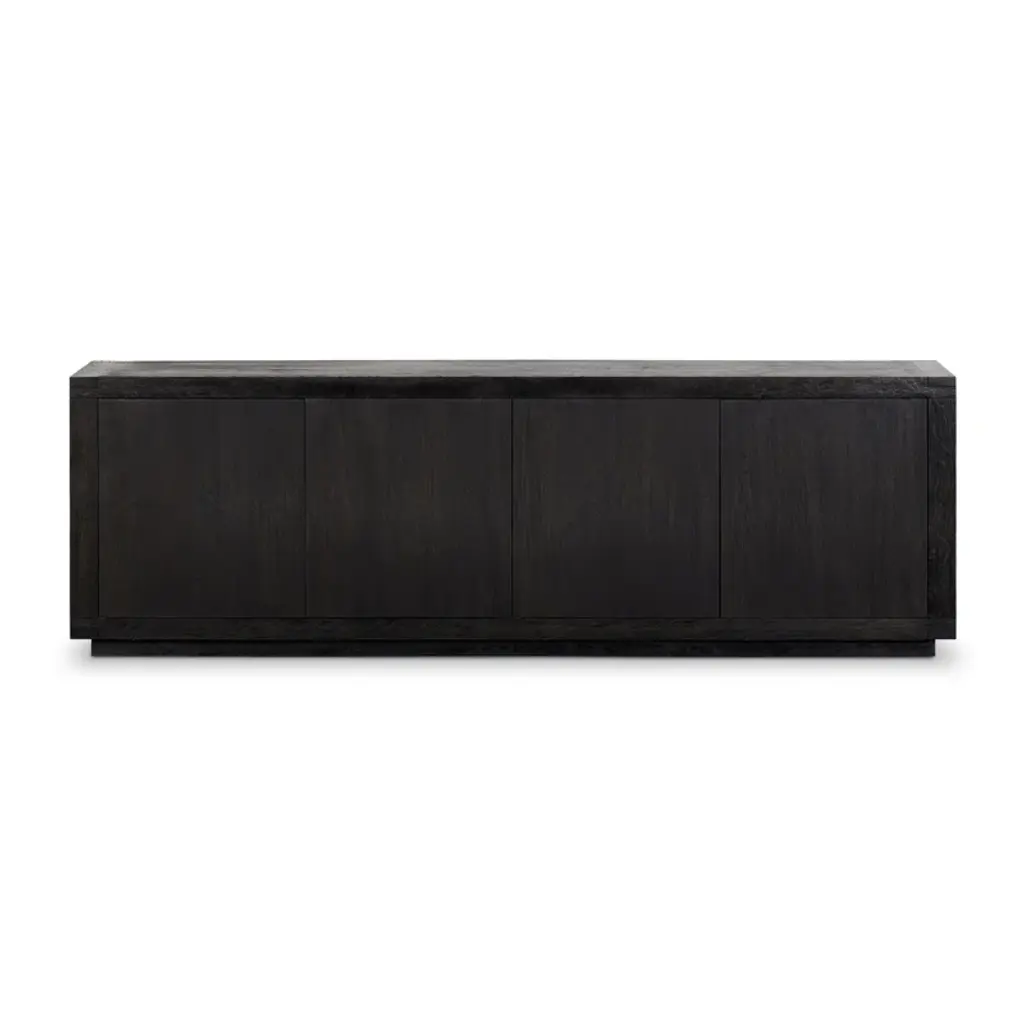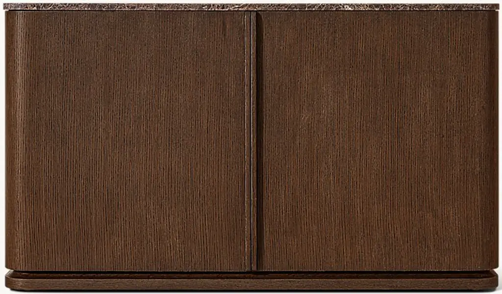 This sophisticated sideboard is crafted from solid mahogany. Its two side doors are characterized by a warm coffee finish, contrasting with the stunning natural finish of its three central drawers. Topped with a Dark Emperador marble top, the Minou Sideboard brings instant depth to your home with its refined pairing of textures and tones.