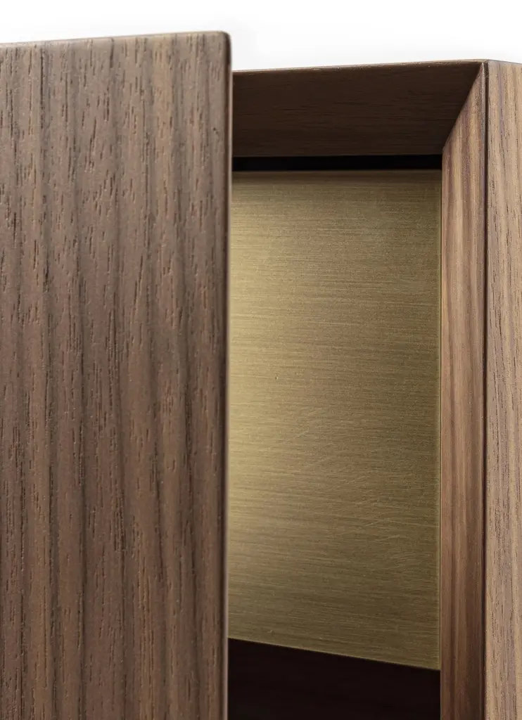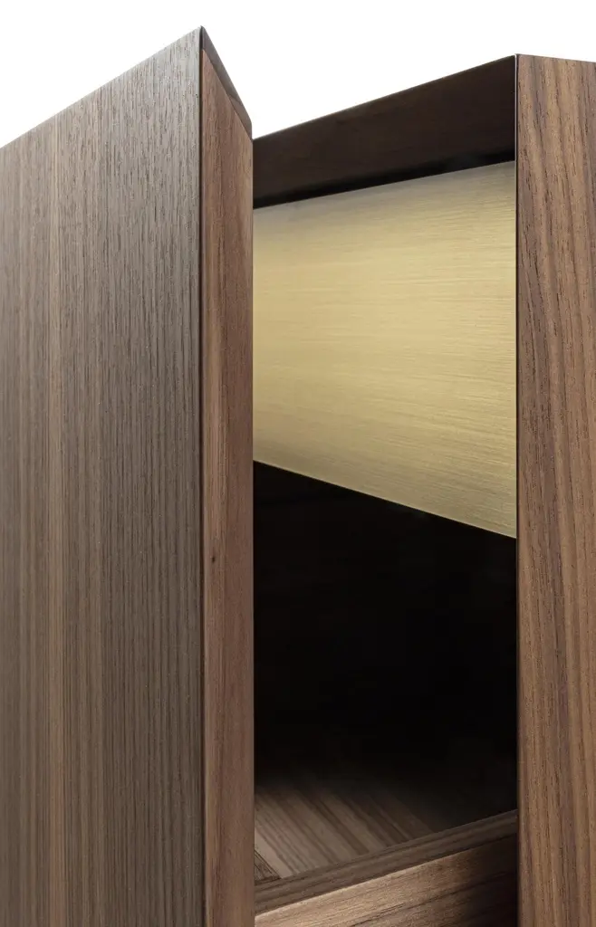 A modern vibe envelops this vintage sideboard. The leg’s elements elude the gaze of the observer and give the upper part a vertical momentum and a satisfying elegance.This piece of exceptional work can sit well against a wall but has a desire to be in the spotlight and to take its place in the center of a lounge ready to serve as a support for mixing spirits.The metal parts reflect light creating a lifting effect while the wooden upper part is available in Opaque Brown Canaletto Walnut or in Opaque Black Open Pore Striped Oak, both variants are capable of giving a dreamy effect to Mirage sideboard.