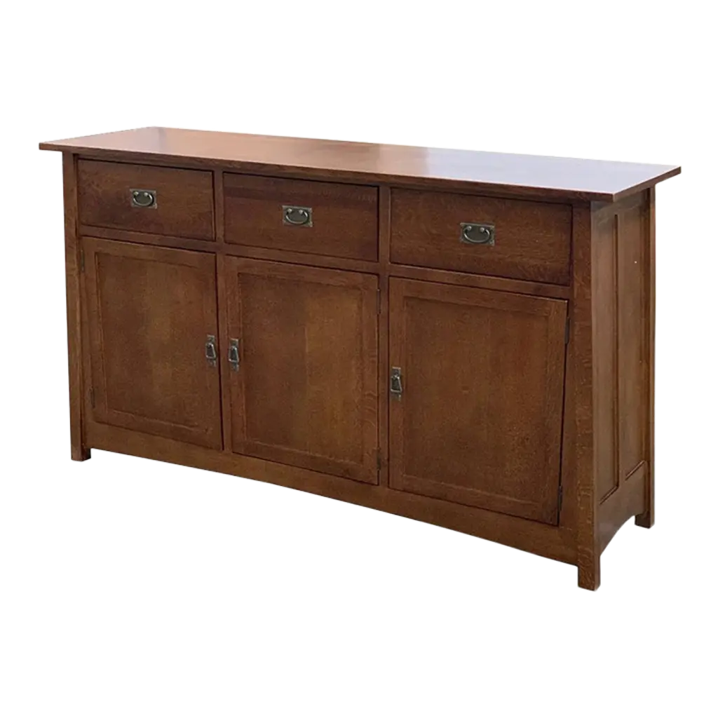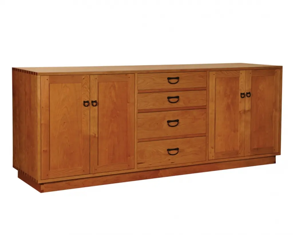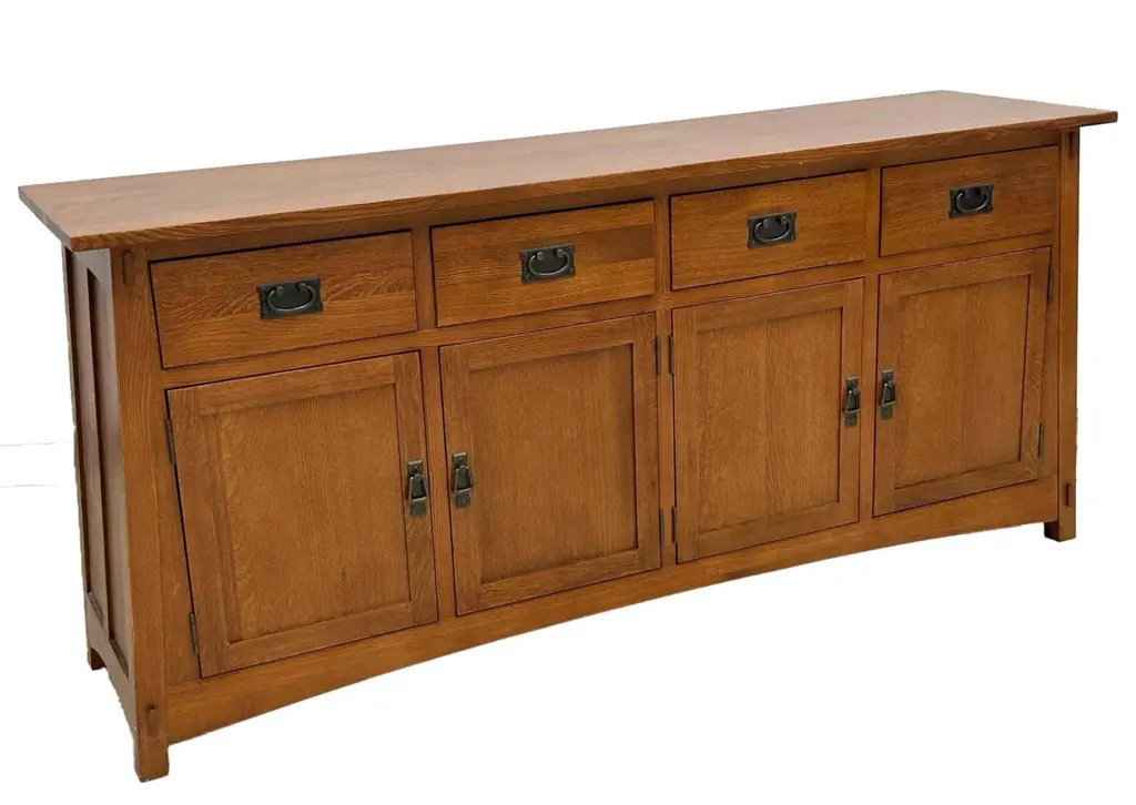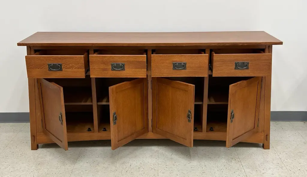 Our Mission / Arts & Crafts style furniture is made with attention to detail and expertise like that of 100 year old Stickley. Quarter Sawn White Oak with Michael's Cherry Stain. This is a medium-light brown stain that shows off the highlights in the grain. Mortise and Tenon joinery and solid wood construction Drawers feature dovetail drawer fronts and metal glides Removable shelf behind each cabinet doors Plenty of storage and display space with 4 drawers and 4 cabinet doors on the sideboard. This piece features many fine Mission and Arts & Crafts style design features. Dimensions: Overall: 74W x 19.75D x 31H Drawer: 13.75W x 14.5D x 3.5H Sideboard - side cabinet (above shelf): 17W x 16.5D x 7.5H Sideboard - side cabinet (below shelf): 17W x 16.5D x 8.5H Sideboard - middle cabinets (both 2 are the same) above shelf: 16.5W x 16.5D x 7.5H Sideboard - middle cabinets (both 2 are the same) below shelf: 16.5W x 16.5D x 8.5H