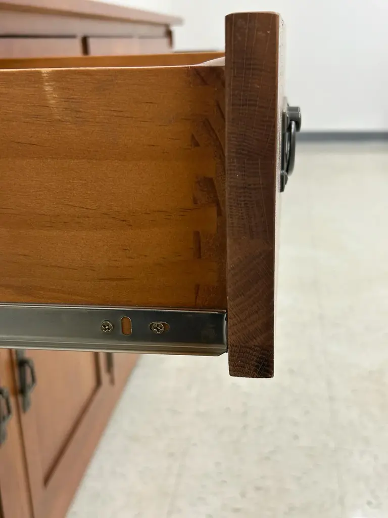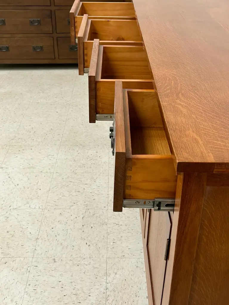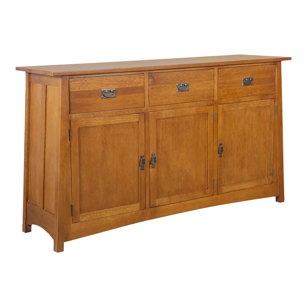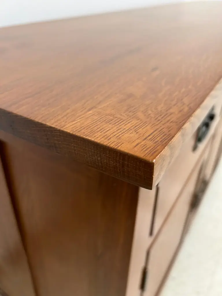 Our Mission / Arts & Crafts style furniture is made with attention to detail and expertise like that of 100 year old Stickley. Quarter Sawn White Oak with Michael's Cherry Stain. This is a medium-light brown stain that shows off the highlights in the grain. Mortise and Tenon joinery and solid wood construction Drawers feature dovetail drawer fronts and metal glides Removable shelf behind each cabinet doors Plenty of storage and display space with 4 drawers and 4 cabinet doors on the sideboard. This piece features many fine Mission and Arts & Crafts style design features. Dimensions: Overall: 74W x 19.75D x 31H Drawer: 13.75W x 14.5D x 3.5H Sideboard - side cabinet (above shelf): 17W x 16.5D x 7.5H Sideboard - side cabinet (below shelf): 17W x 16.5D x 8.5H Sideboard - middle cabinets (both 2 are the same) above shelf: 16.5W x 16.5D x 7.5H Sideboard - middle cabinets (both 2 are the same) below shelf: 16.5W x 16.5D x 8.5H