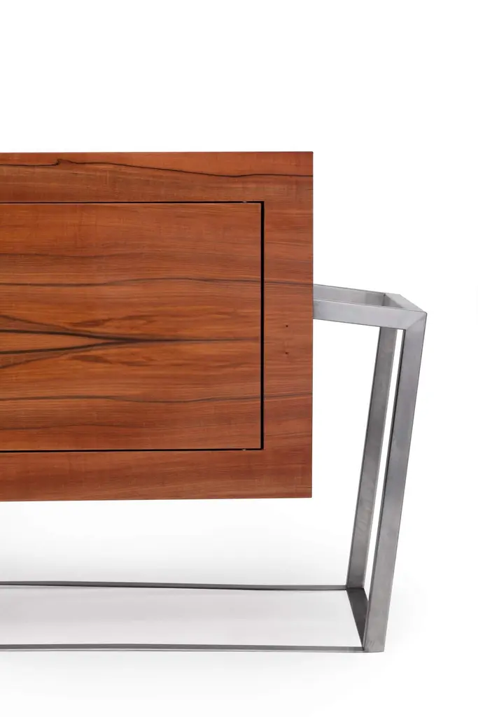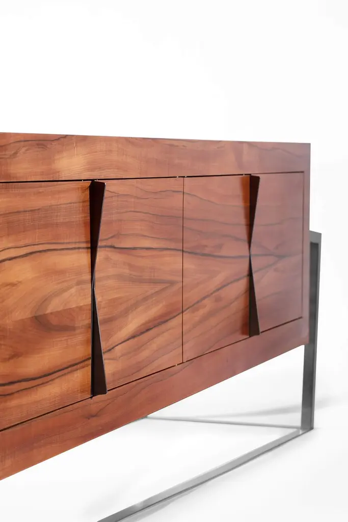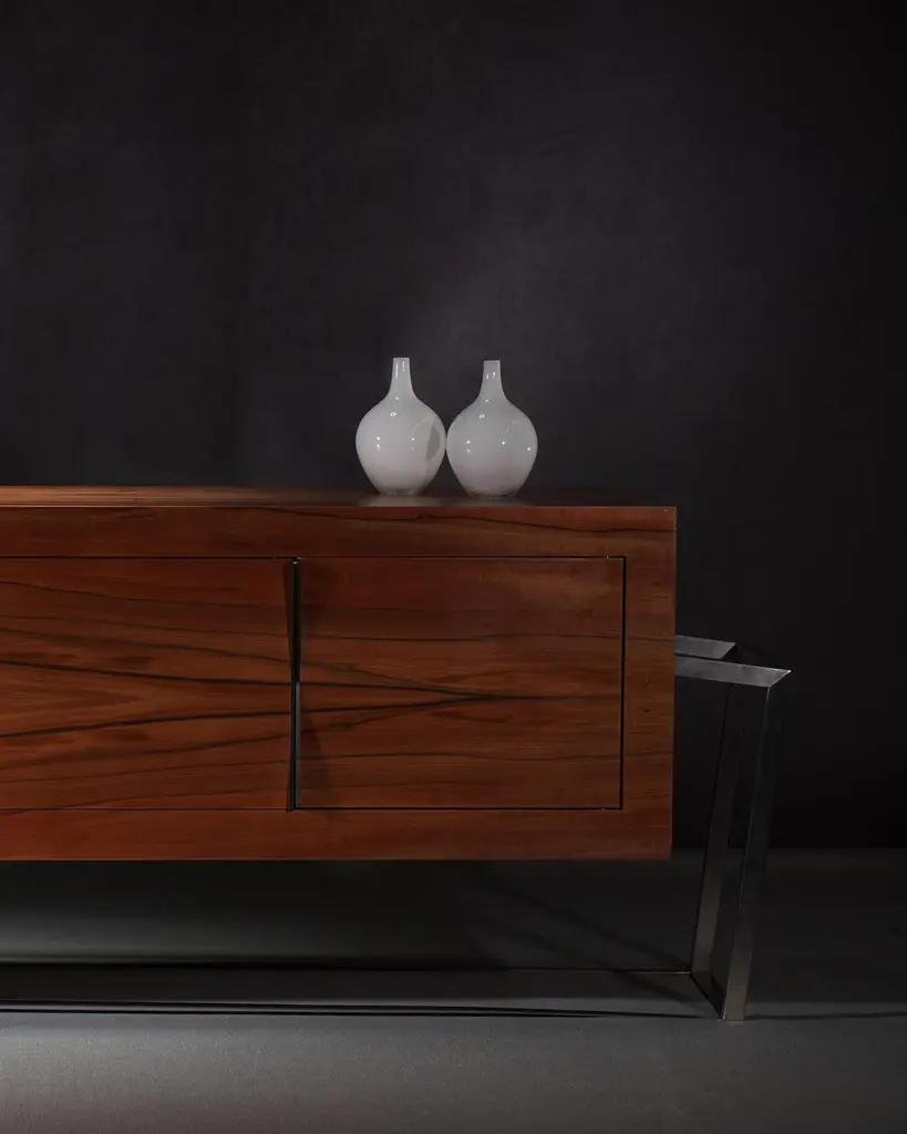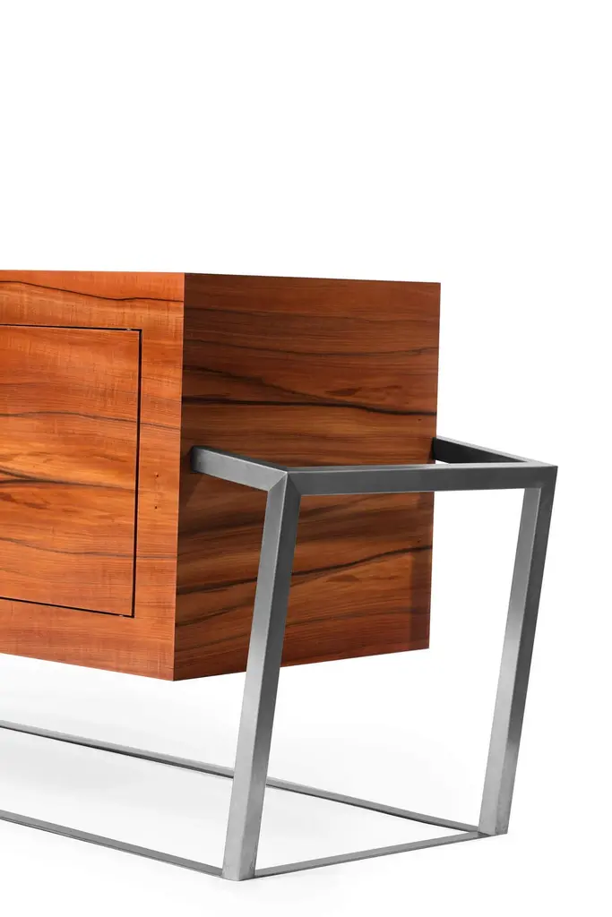 The Credenza Sideboard ExCentric 1.0 is made of tineo wood and brushed stainless steel and can be placed in a dining or office room. Its contemporary and edgy design challenges the perceptions of a usual sideboard. This piece would make the ideal companion to an ExCentric 1.0 Executive Desk.Available in two sizes – medium and large. This listing refers to the medium size. Also, this sideboard can be made in customized options:Structure and handles: Stainless steel (polished or brushed), brass (polished or brushed) or lacquered steel (in any RAL colour).Body: Another lacquer colour (any RAL colour) or wood veneer (walnut, ebony macassar, black oak, ironwood).Interiors: Oak wood veneer.Dimensions: The large sideboard measures 70 x 220 x 77 cm (27.6 x 86.6 x 30.3 in). Custom dimensions are only available after analysis.You can fit the interiors with shelves to store your items by request.Assembled piece. Given the weight and size, it will be delivered in a wooden box packed in bubble wrap.You can try it in your space using Augmented Reality with your mobile phone (available on our website - ExCentric 1.0 Collection).In 2016, it won an "A' Design Award" in the "Furniture, Decorative Items, and Homeware Design" category.This piece is entirely made in Portugal and manufactured artisanally. The author carefully executed or supervised every process step in a small workshop context.Labour of love from Portugal.Designer/Author - Joao Faria/Emotional Objects.Manufacturer - Joao Faria/Emotional Objects.At Emotional Objects, we don't follow trends or fashion. Instead, we create distinct and timeless objects with solid ideas and concepts. Every Emotional Object has a meaningful story behind it. Made to last for generations, we proudly see our objects as future furniture classics that will stand the test of time.Working in Portugal with the best artisans, the distinction between functional and fine art is difficult to find in Joao Faria's work. He uses the finest materials and techniques, but, most importantly, he only makes pieces he would want for himself.Art Furniture, Unique, Tailored, Emotional, Truly Yours.