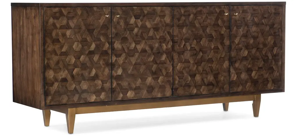 Modern burl buffet sideboard with four doors framed by a beveled edge, with interior drawers and shelves and finished in a lightly distressed rustic warm hand-rubbed finish.Dimensions: 84" W x 19" D x 36" H.