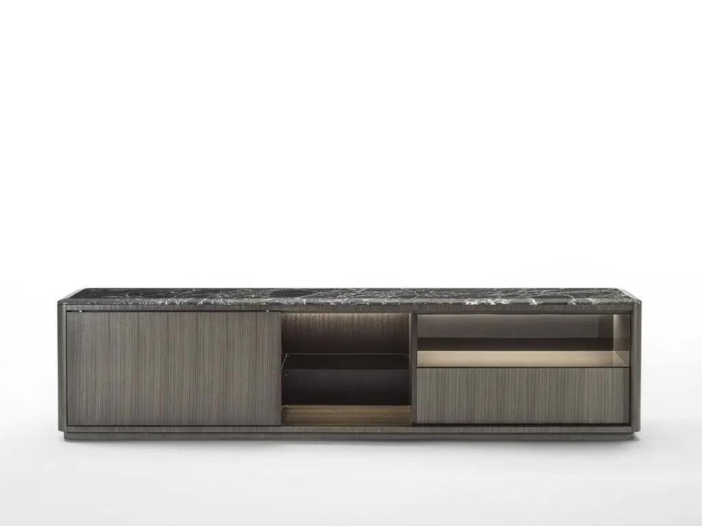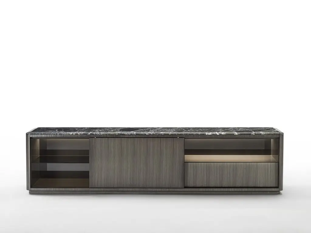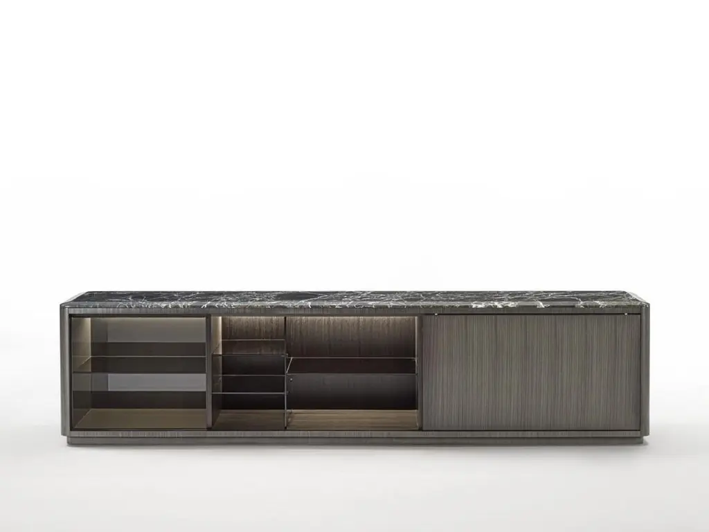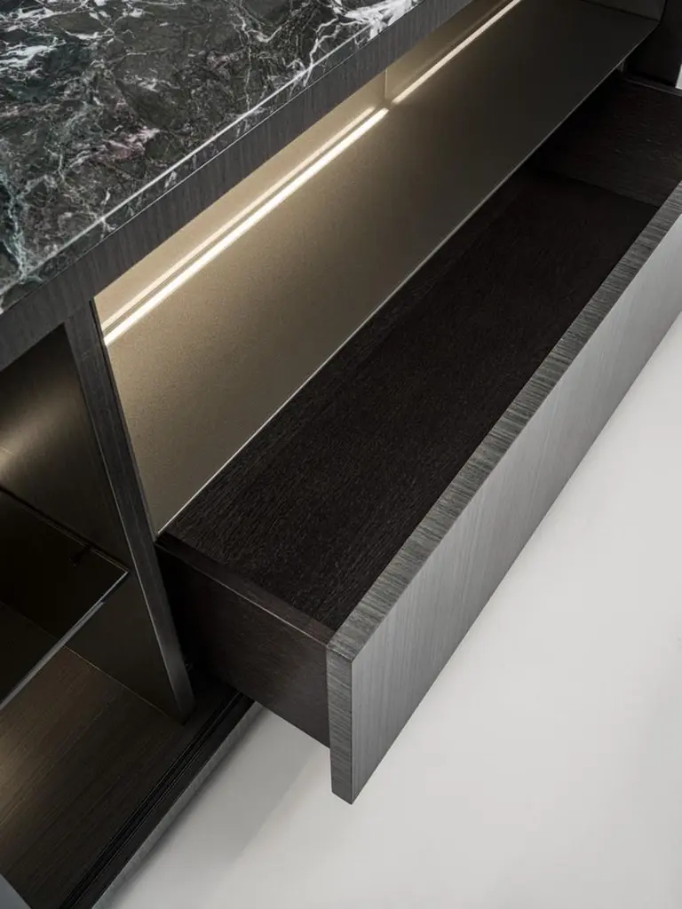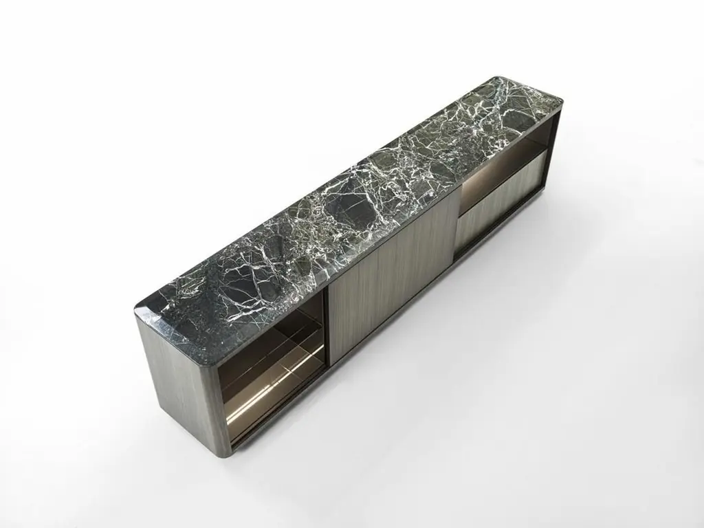 Sideboard characterized by the linear design, embellished by the dark Tay (CR77B) upholstered frame and the detail of rounded corners. The sliding door creates multiple compositions with open and drawer compartments. The internal structure of the open compartments are made of painted glass with Gold-Bronze FV05 finish. The FM08B green Lepanto marble top is embellished with beveling all around, also available with other marbles, painted glass or wood. The cabinet is also available in light Tay (CR77C) and Canaletto Walnut (CR77). Interior lighting on request.