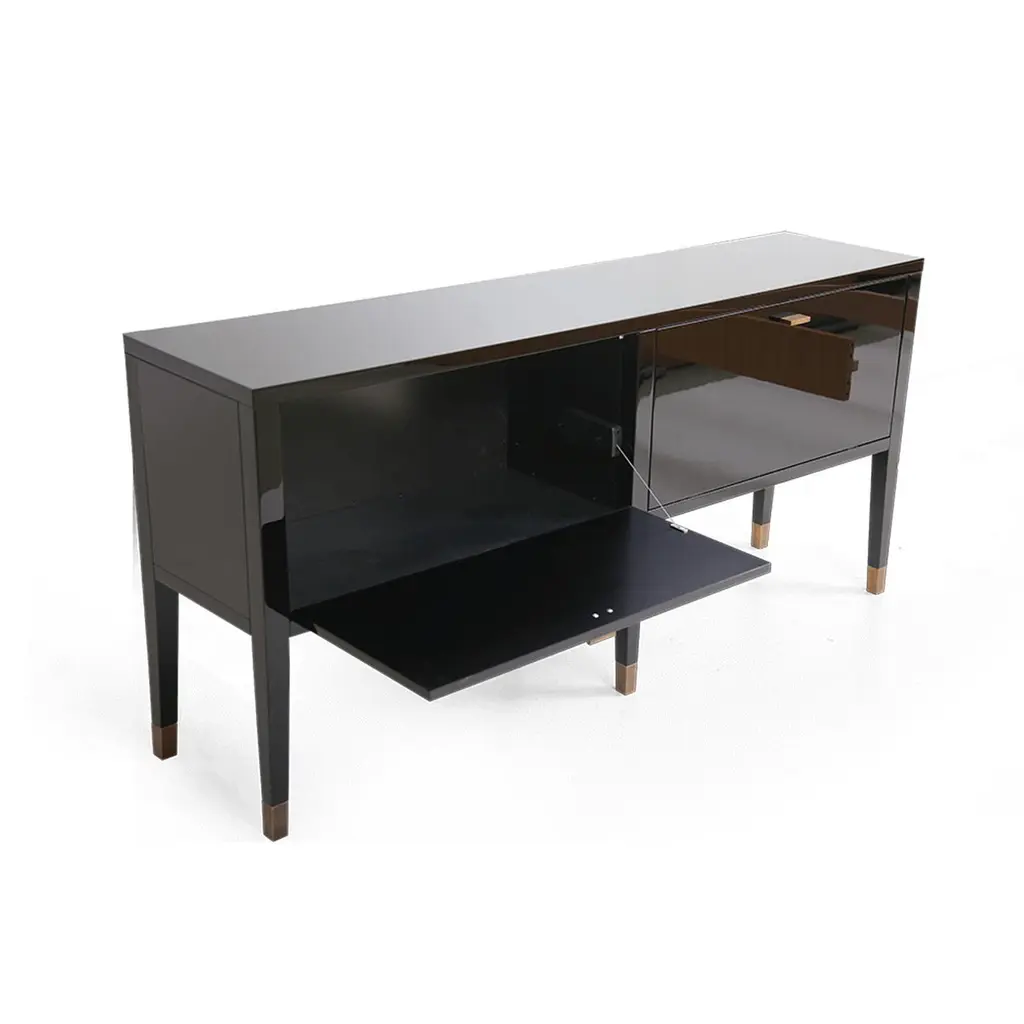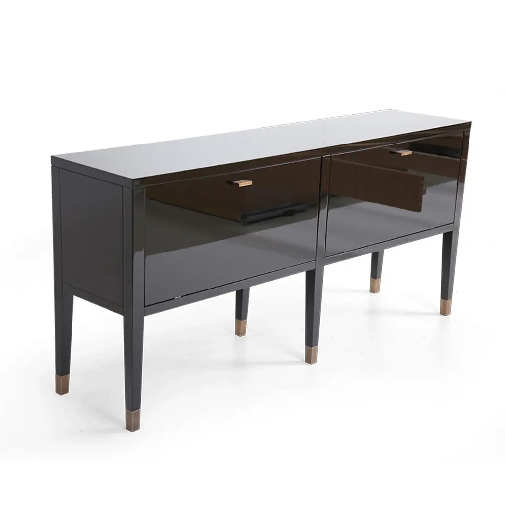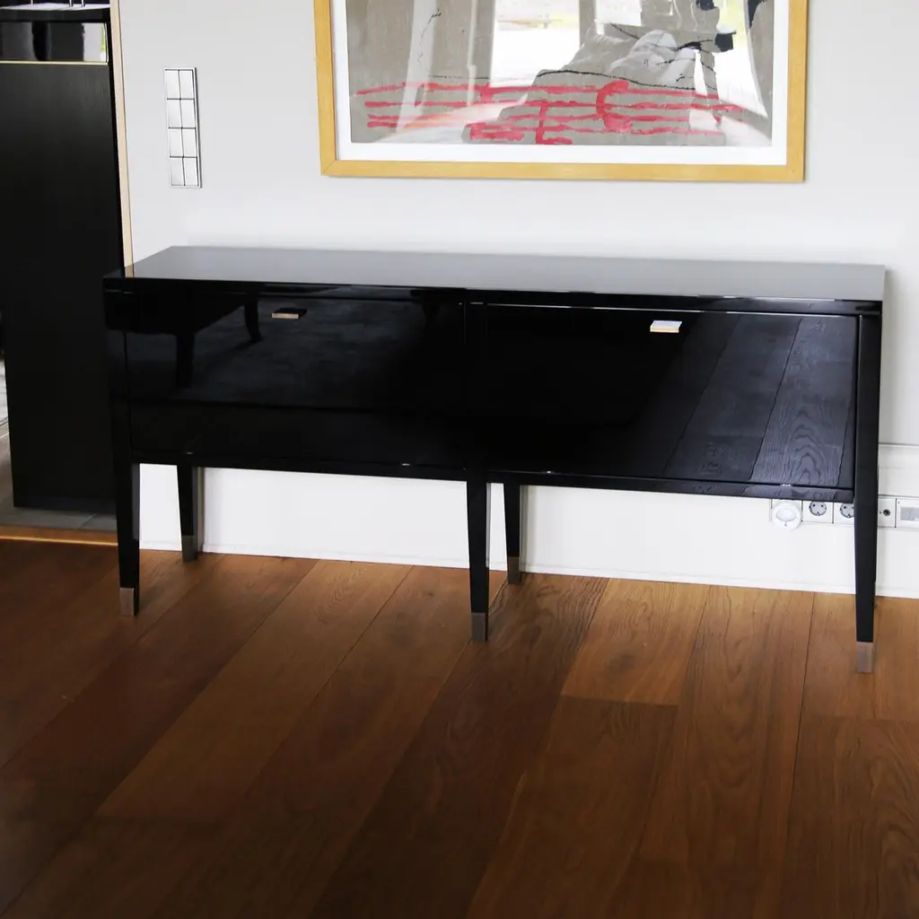 Elegant and fabulous, the sideboard is a stylish addition to the room. The black piano finish cabinet has a deeply luxurious appearance. With storage compartments behind two doors, this furniture piece is elegantly decorated with burnished solid brass handles and legs. Combining luxury design with brilliant craftsmanship, this is a timeless furniture creation.Kanttari’s bespoke service allows you to opt for your preferred finish. Our helpful team would be delighted to discuss possibilities.Material: MDF, ingeneering wood, solid brassFinish: high glossMade to orderCUSTOMIZATION AVAILABLE - Different colors, materials, finishes and customized sizes available upon request. If you’re interested in a customization that is not currently listed, please contact Kanttari.BESPOKE – We do create individual and fully customized designs. Please contact Kanttari to discuss your specifications.MANUFACTURING – we fully hand-craft each piece in our workshop by our best craftsmen. Production lead time may take up to 9 - 12 weeks, bespoke items may be longer – depending on the exact specification and availability of materials chosen. For more information please contact Kanttari.SHIPPINGCarefully packaged in wooden crate.Fully insured.Request a customized shipping quote.