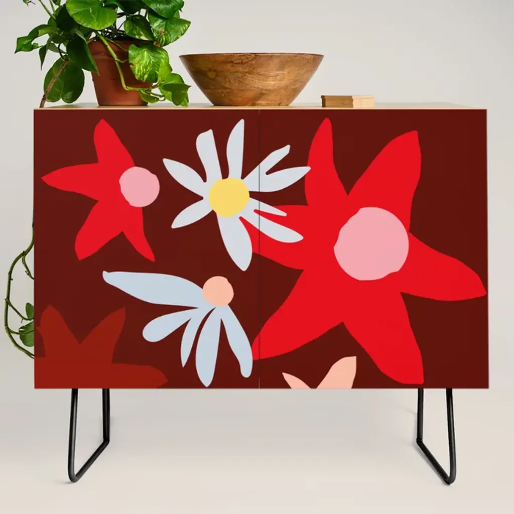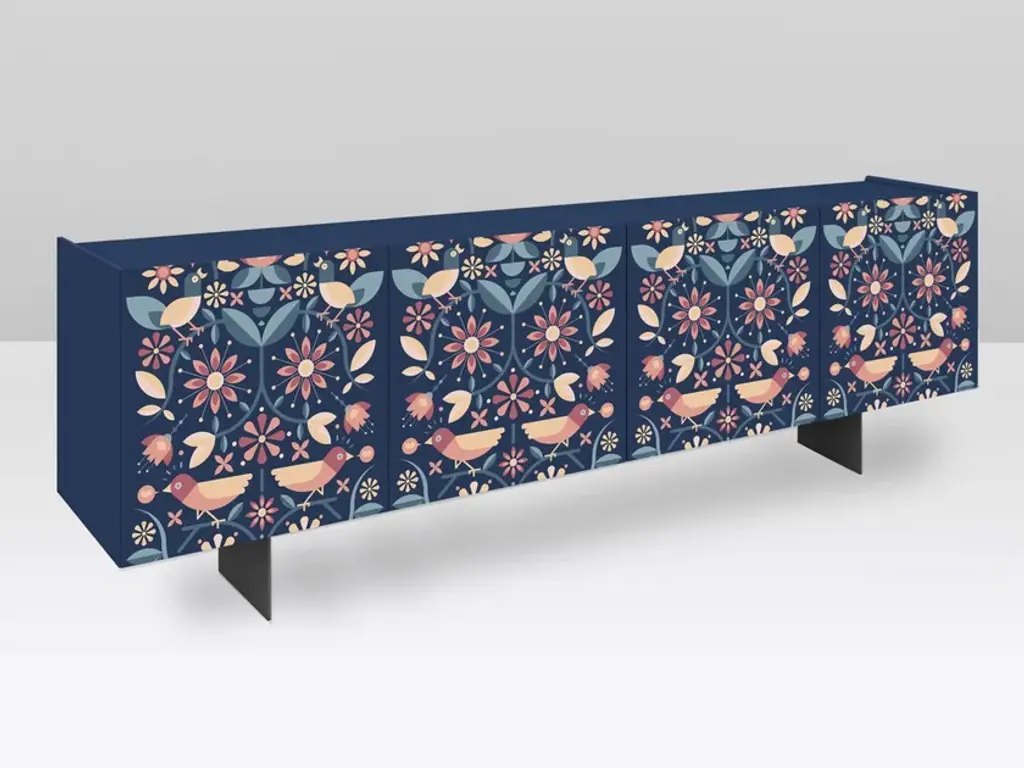 Sideboard with three doors in lacquered wood inside. The exterior is made of digital printing with protective paint. The container is supplied with a metal pedestal.
