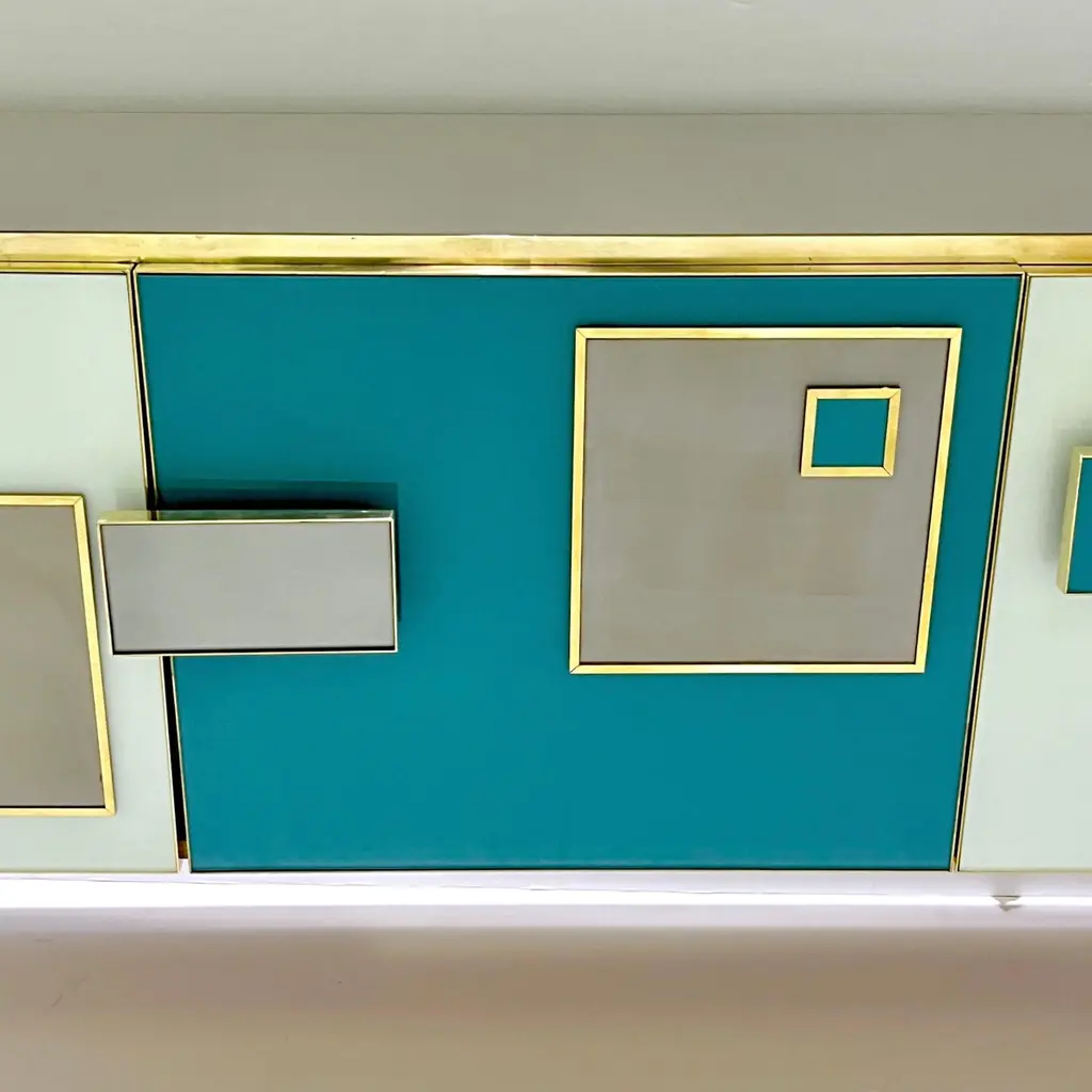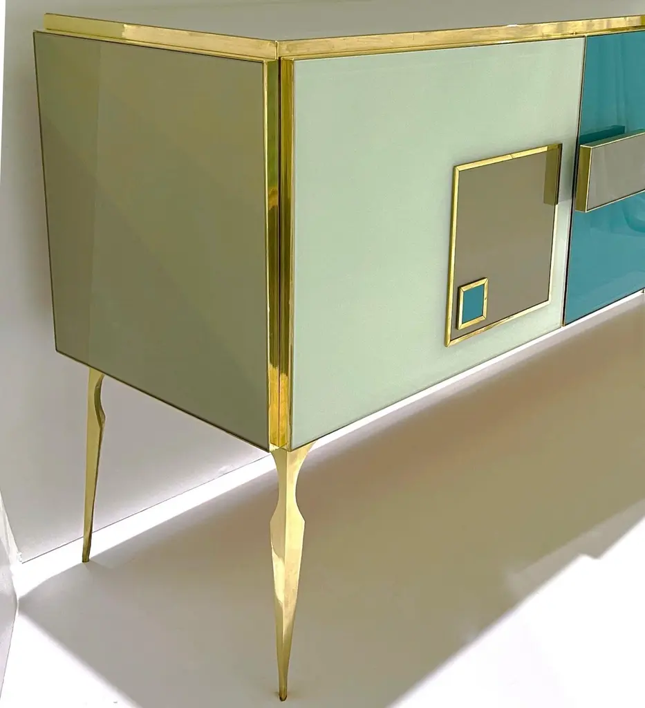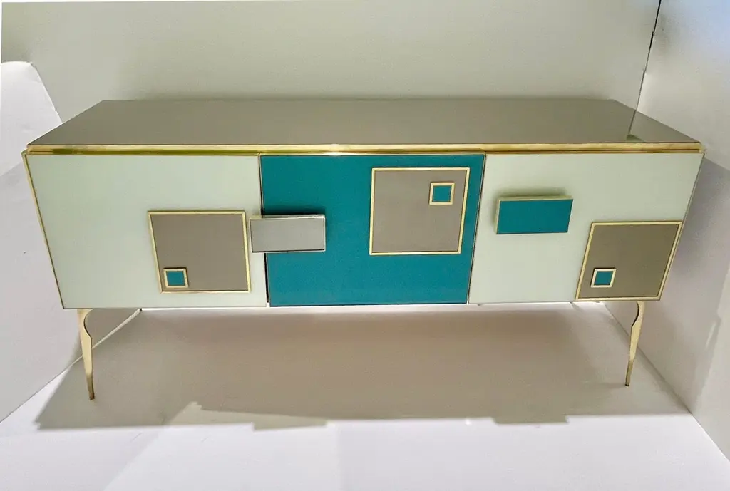 Modern Italian Ivory Gray Teal Blue Geometric Postmodern Brass Cabinet Sideboard