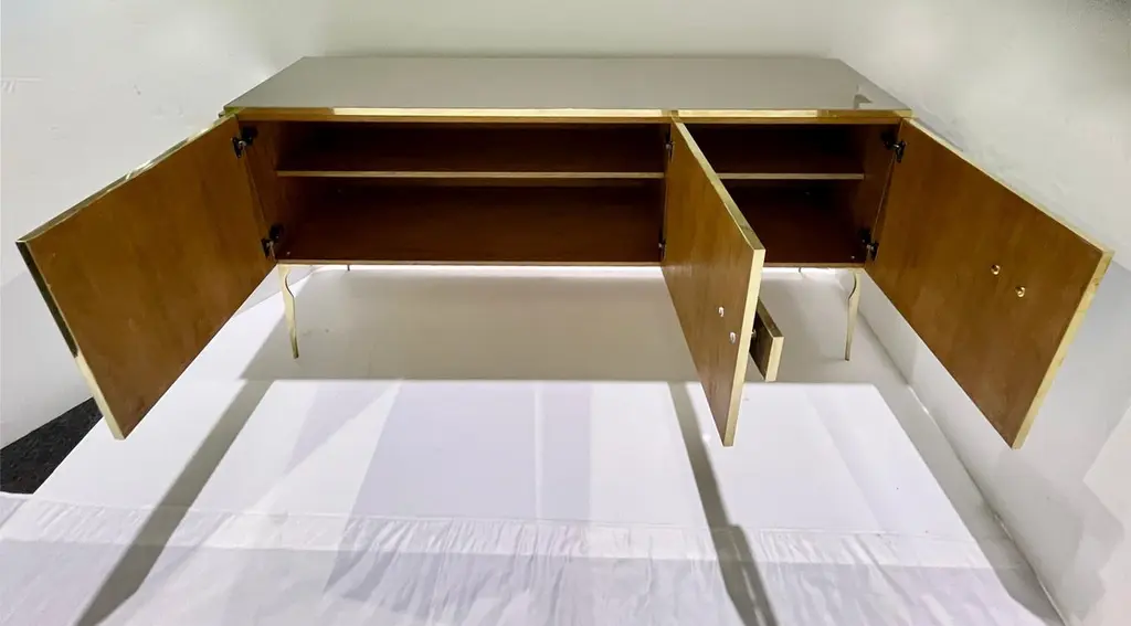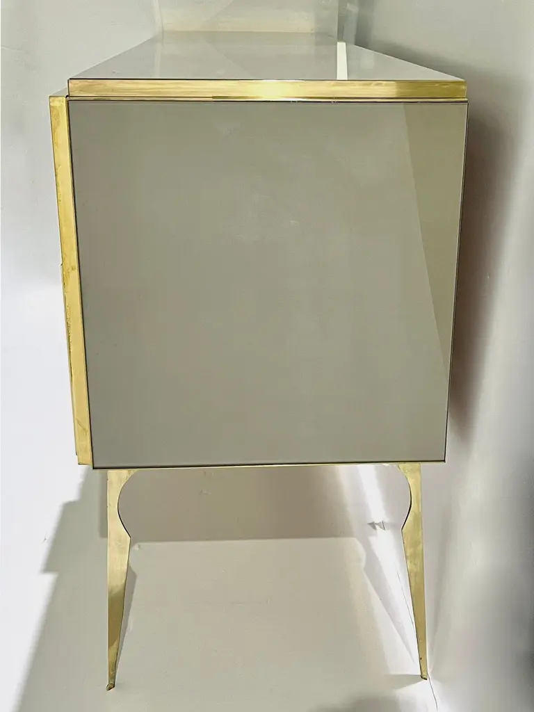 Bring your own accent colors to any space with our customizable modern collection, entirely handmade in Italy, with the purpose of anchoring individuality through Art in a functional piece, triggering personal healthy environments through your own narrative.A creative 3-door modern credenza with 2 shelved compartments, entirely handmade in Italy with high-quality details of execution: walnut veneered interior, the whole body and doors exquisitely edged with innovative brass profiles in relief that modernize the design, and an attractive geometric decor with raised handles and pattern. An elegant, artistic and functional buffet or sideboard for bedrooms or living rooms. Colors here are ivory cream white, light grey, teal turquoise, and for the top surface a precious gray tint with a metallic dust that makes it shimmer: this is a very unique and elegant statement in any interior. Customizable piece to personalized requests in sizes, colors, finishes, leg options and functionality.Ask to see other custom pieces or visit Cosulich Interiors Storefront.Additional measurements: Overall depth including protruding handles: 21.25 inBody height: 19.75 inInterior depth: 17.4 in. (shelf depth 13.5 in)Smaller compartment width 22.75 inLarger compartment width 46 in